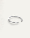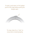 The elongated beauty of an egret bird's neck integrated into high-design. Make astatement by wearing this solo or add it to your stack. This custom bangle opens and closes with a hinge and tab lock closure. To open, push down on the highest point of the clasp before pulling the bangle open. To close, listen for a "click" to ensure tab is locked properly. Note: This design wears best when the closure is secured on the inside of your wrist. Finished in high-polish silver.