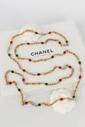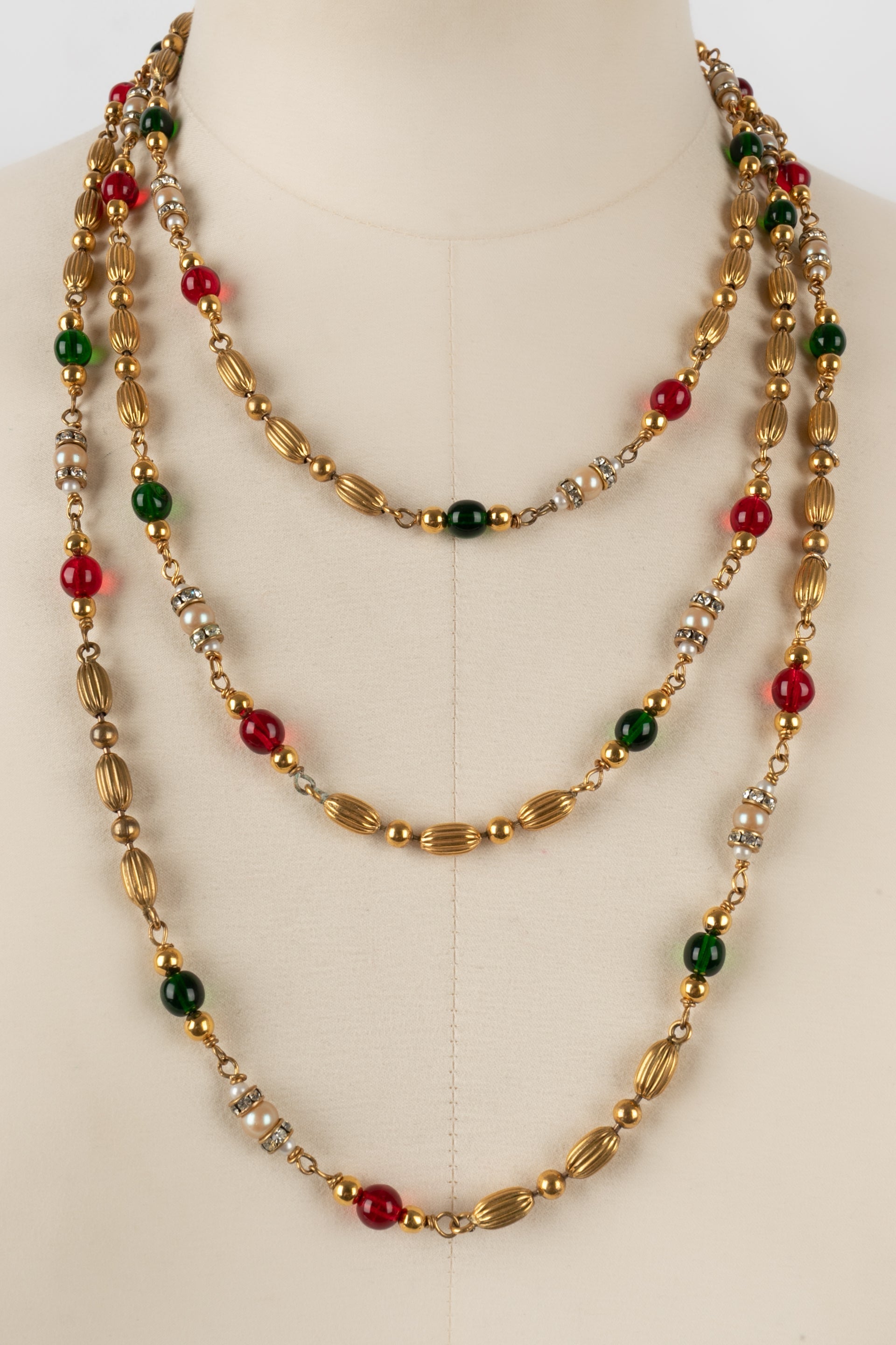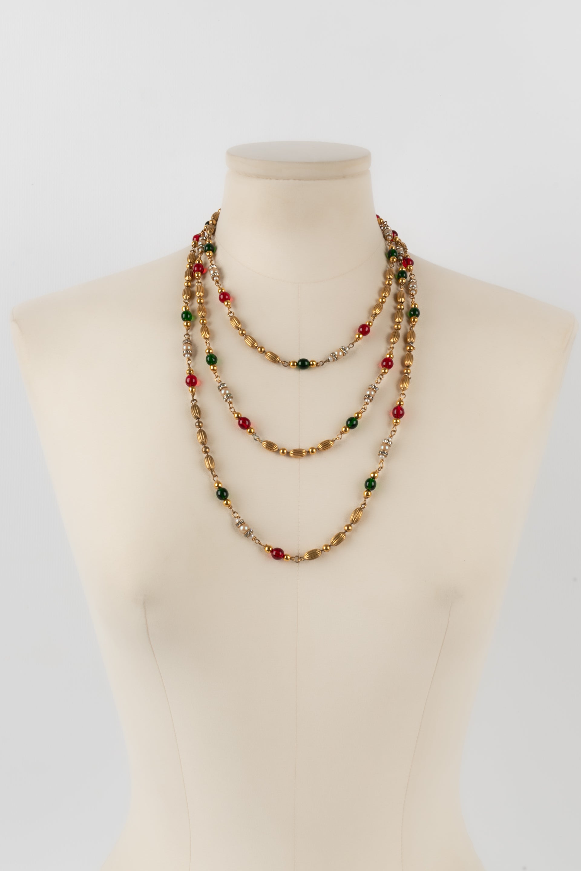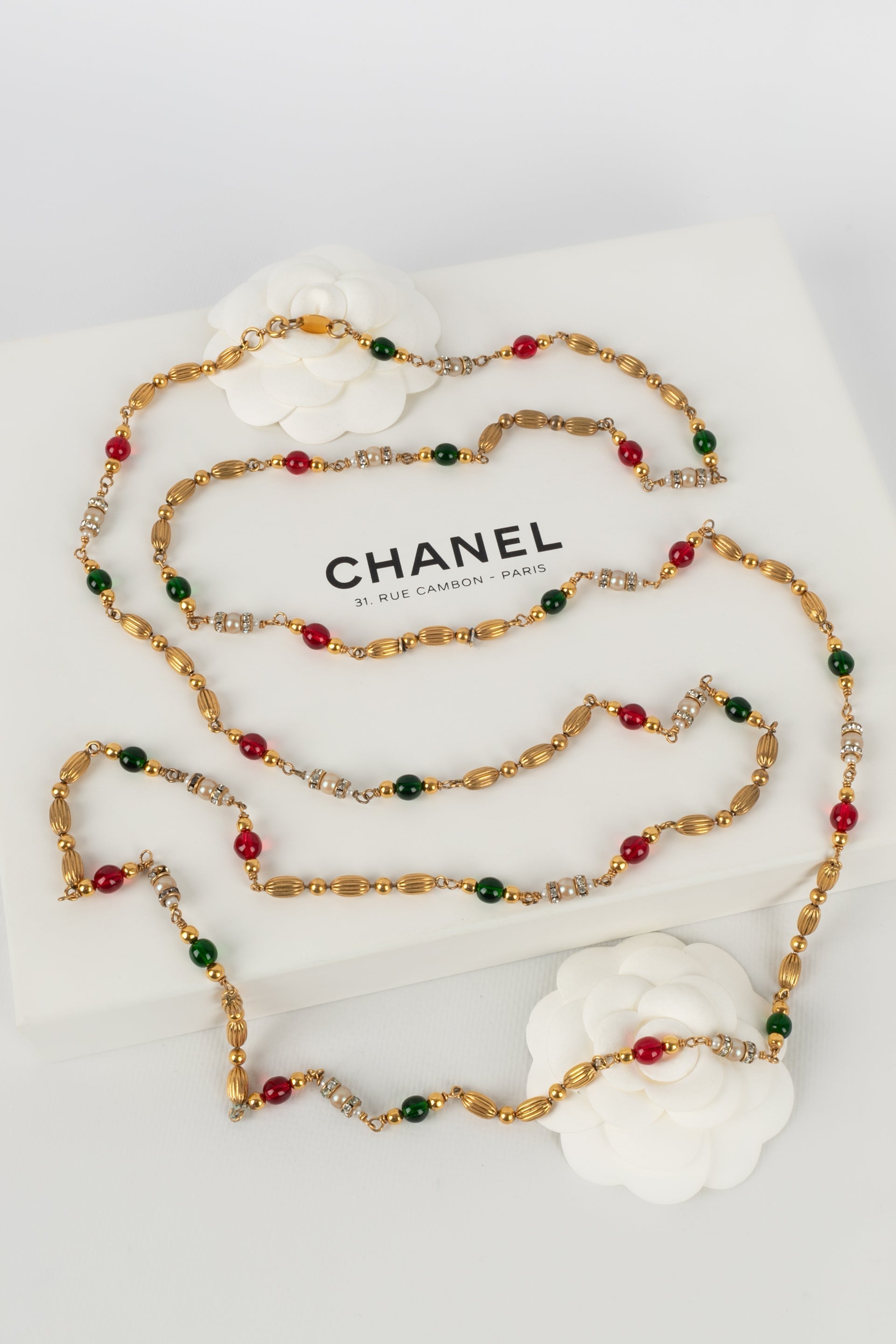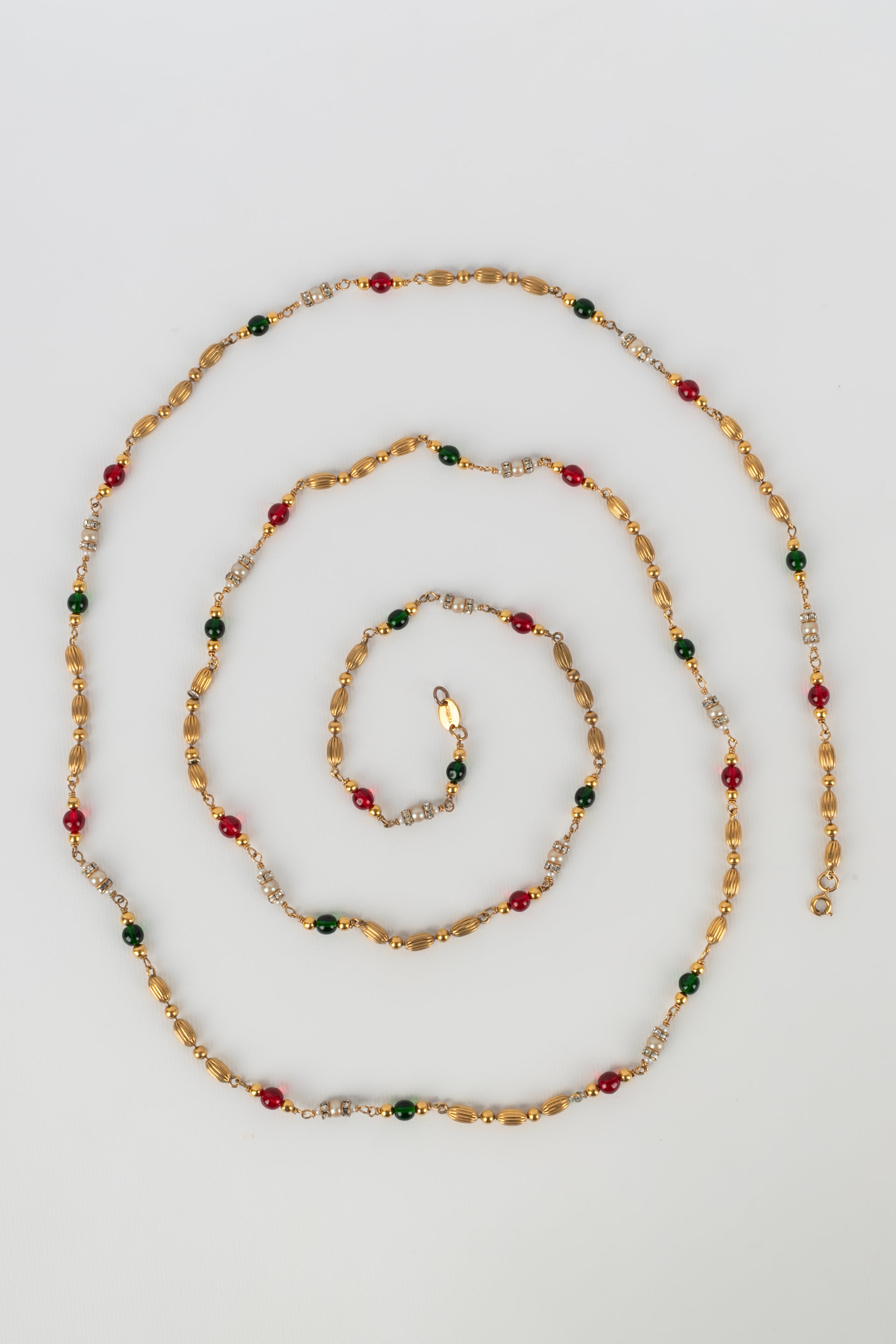 CHANEL - (Made in France) Sautoir en métal doré composé de perles métalliques, de rondelles de strass et de perles de verre dans les tons rouge, vert et nacré. Bijou datant des années 1960.