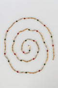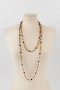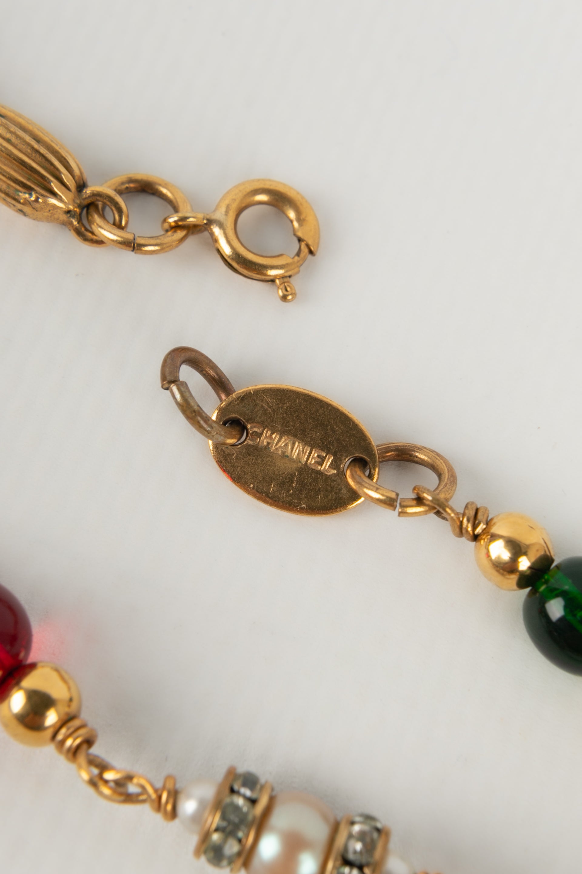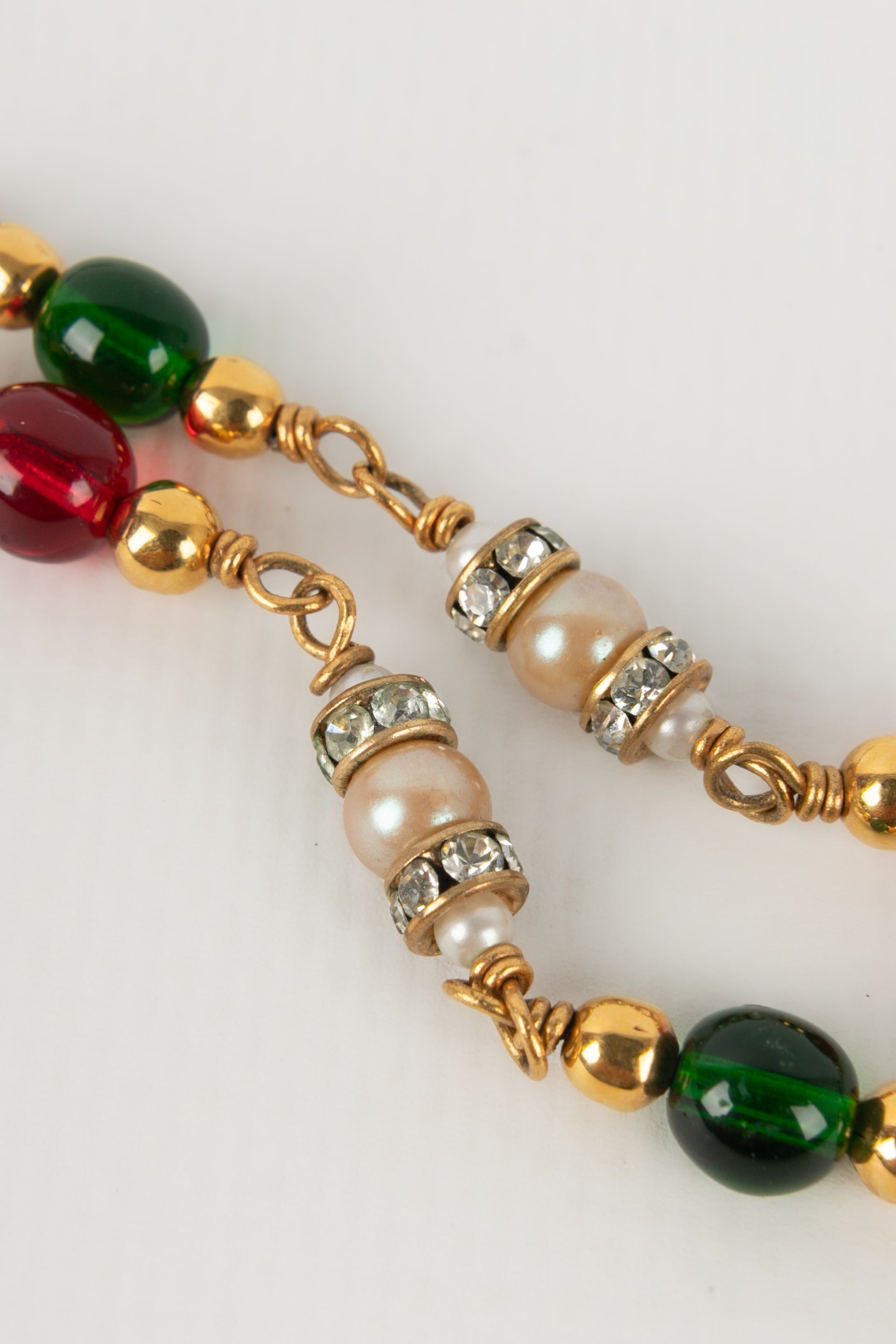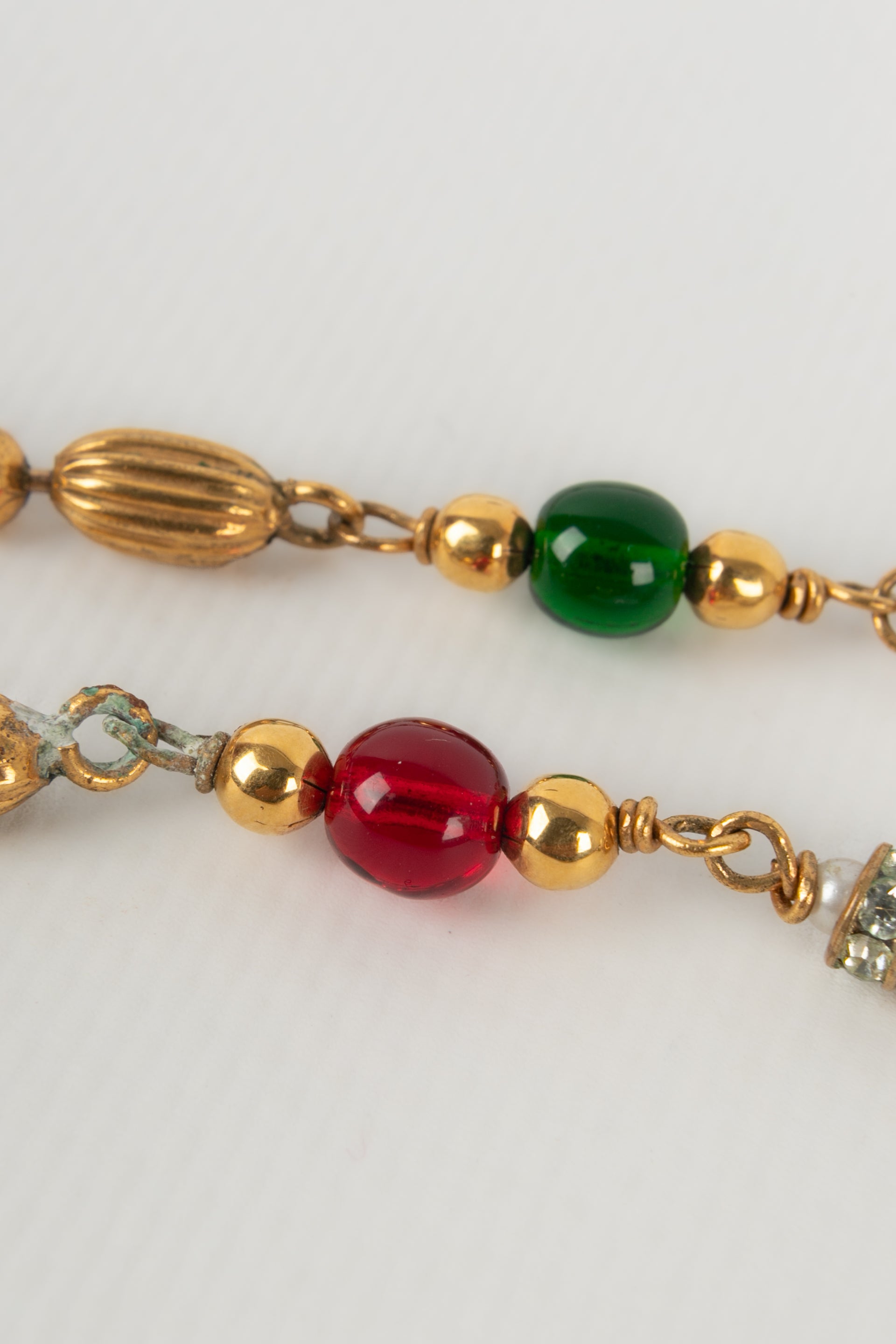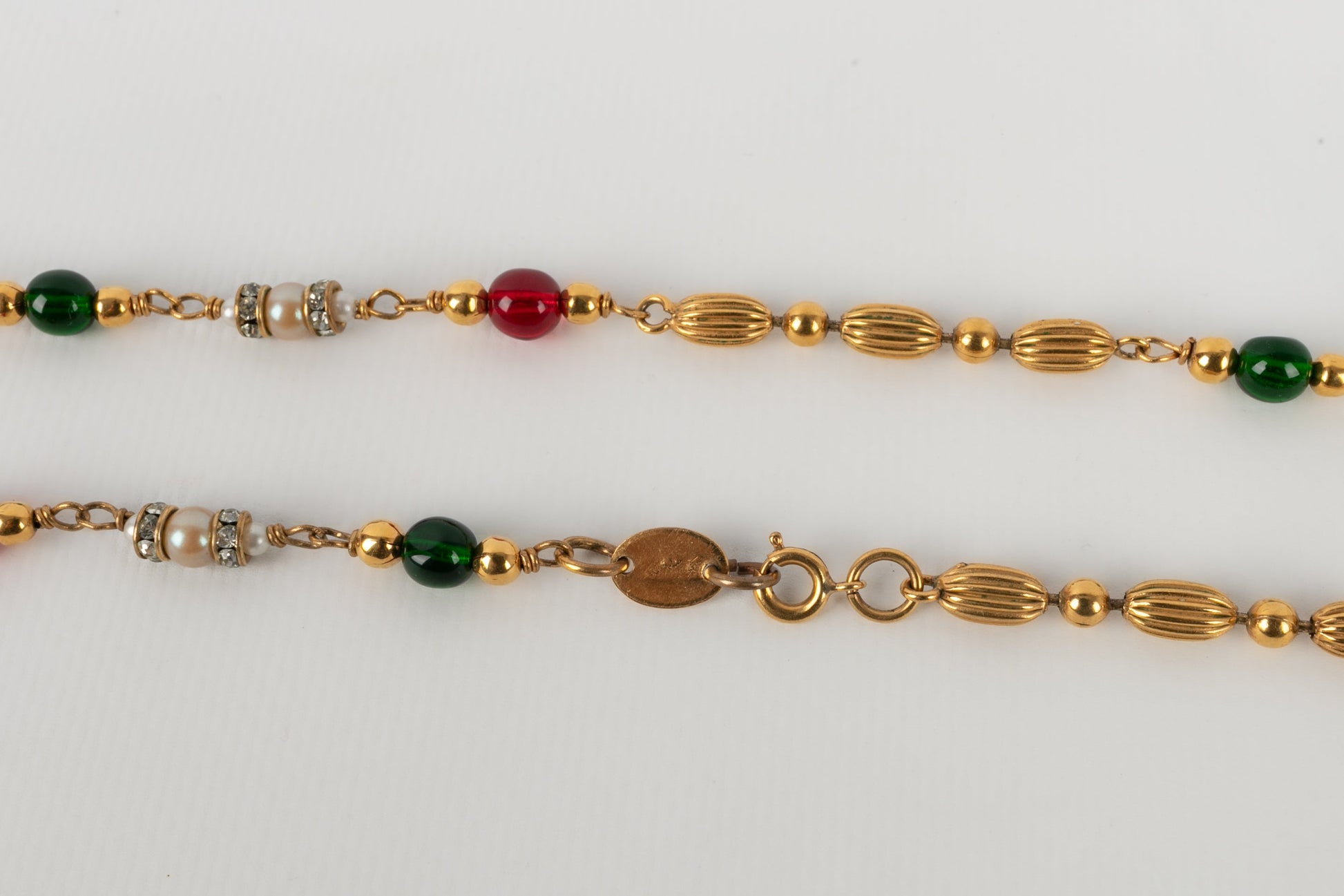 CHANEL - (Made in France) Sautoir en métal doré composé de perles métalliques, de rondelles de strass et de perles de verre dans les tons rouge, vert et nacré. Bijou datant des années 1960.
