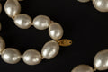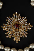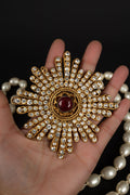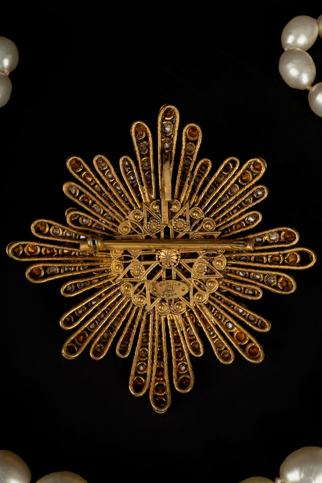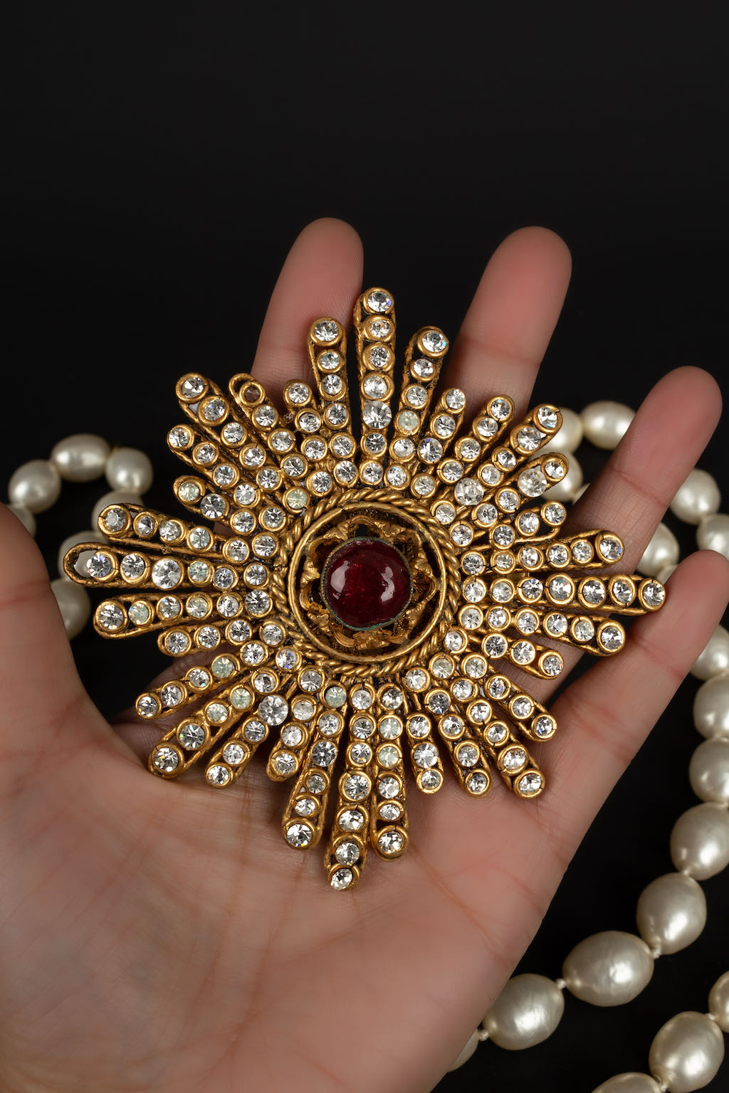 CHANEL -Collier de perles nacr�es et broche pendentif en m�tal, strass et p�te de verre rouge. Collection 1984.