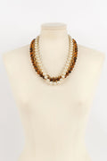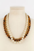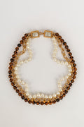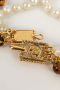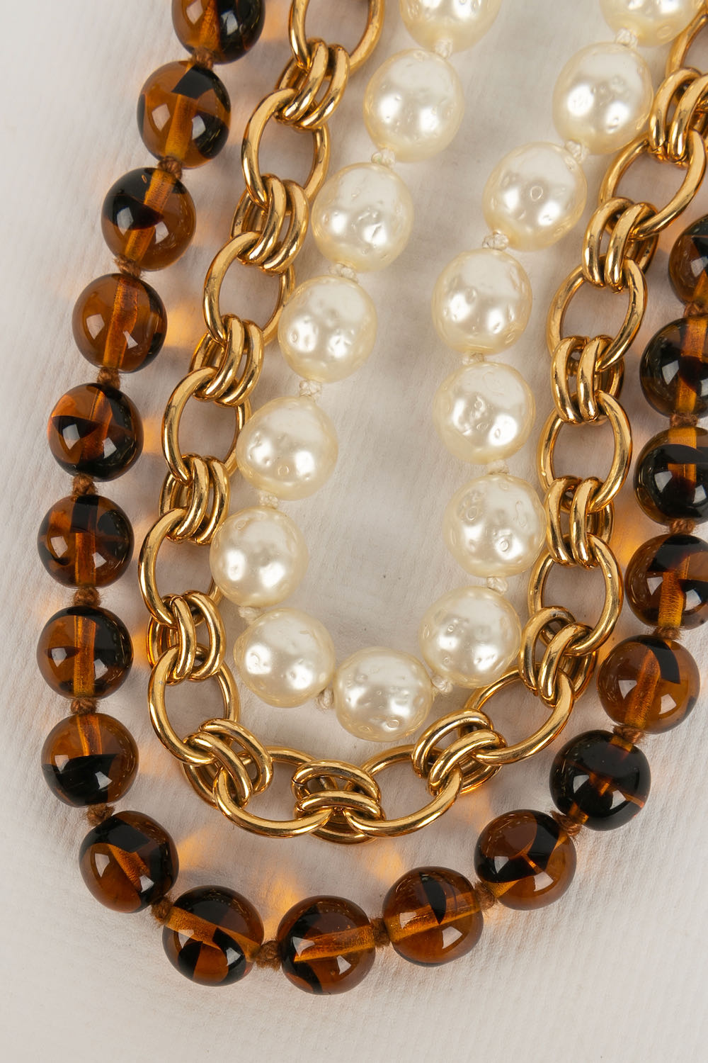 CHANEL -Collier trois rangs de perles nacr�es, perles de verre et cha�ne en m�tal dor�. Collection 1985.
