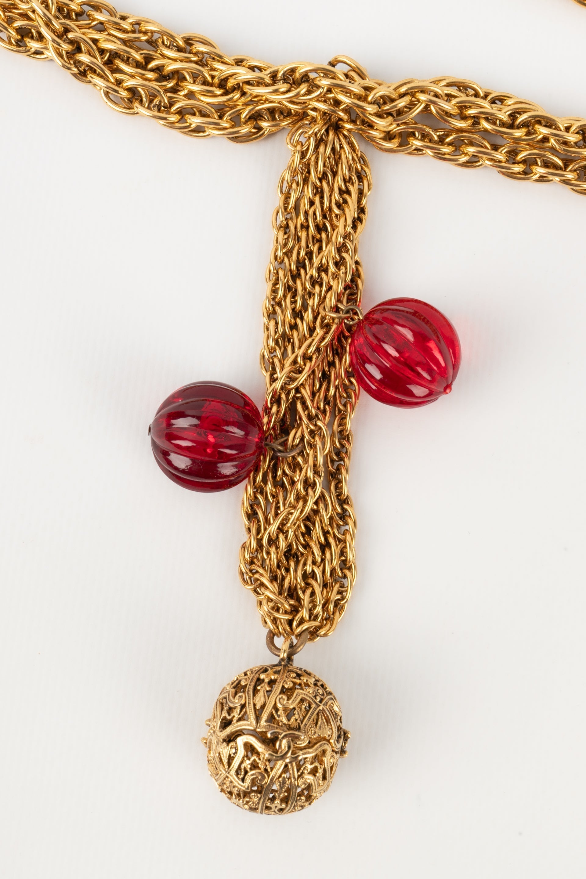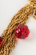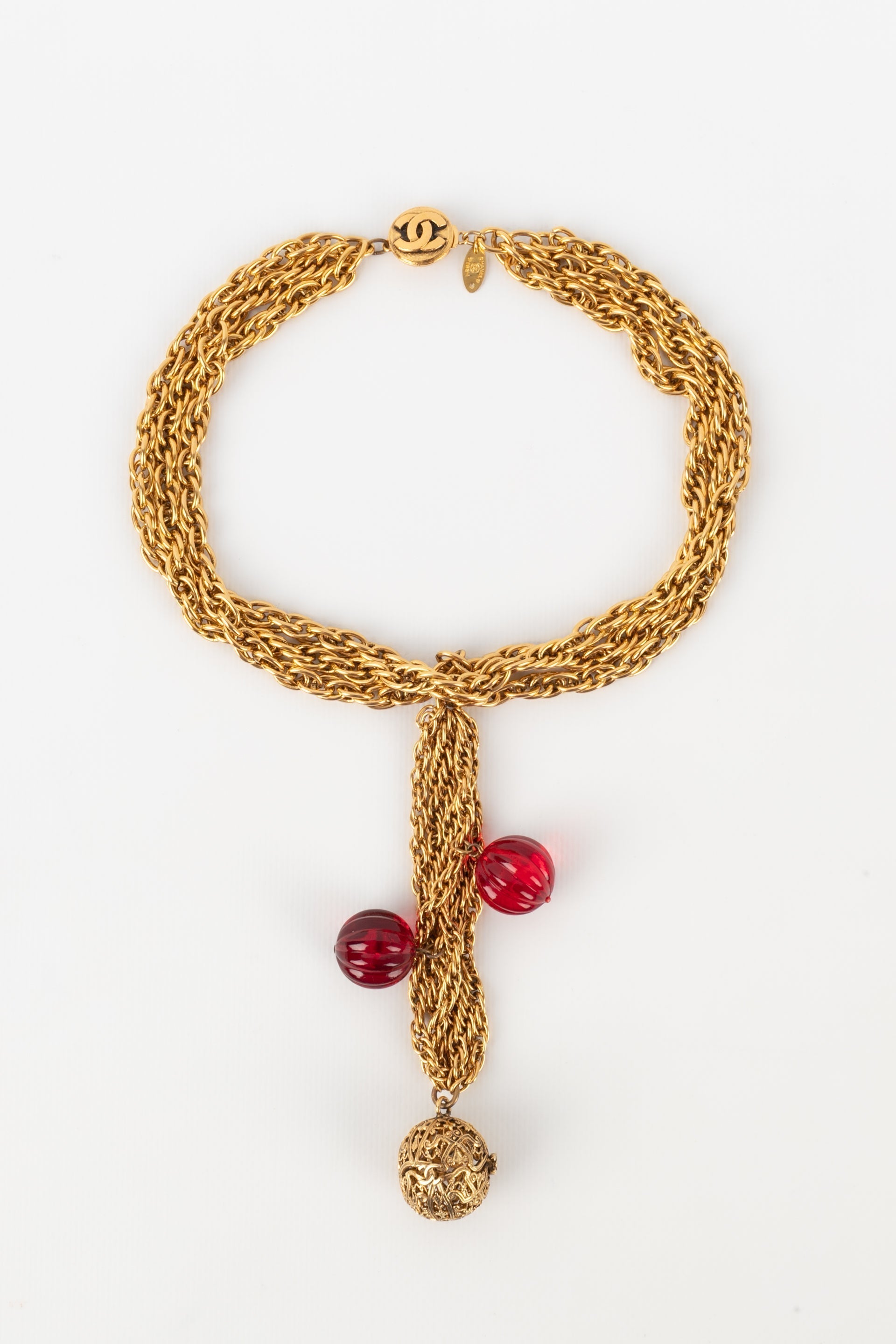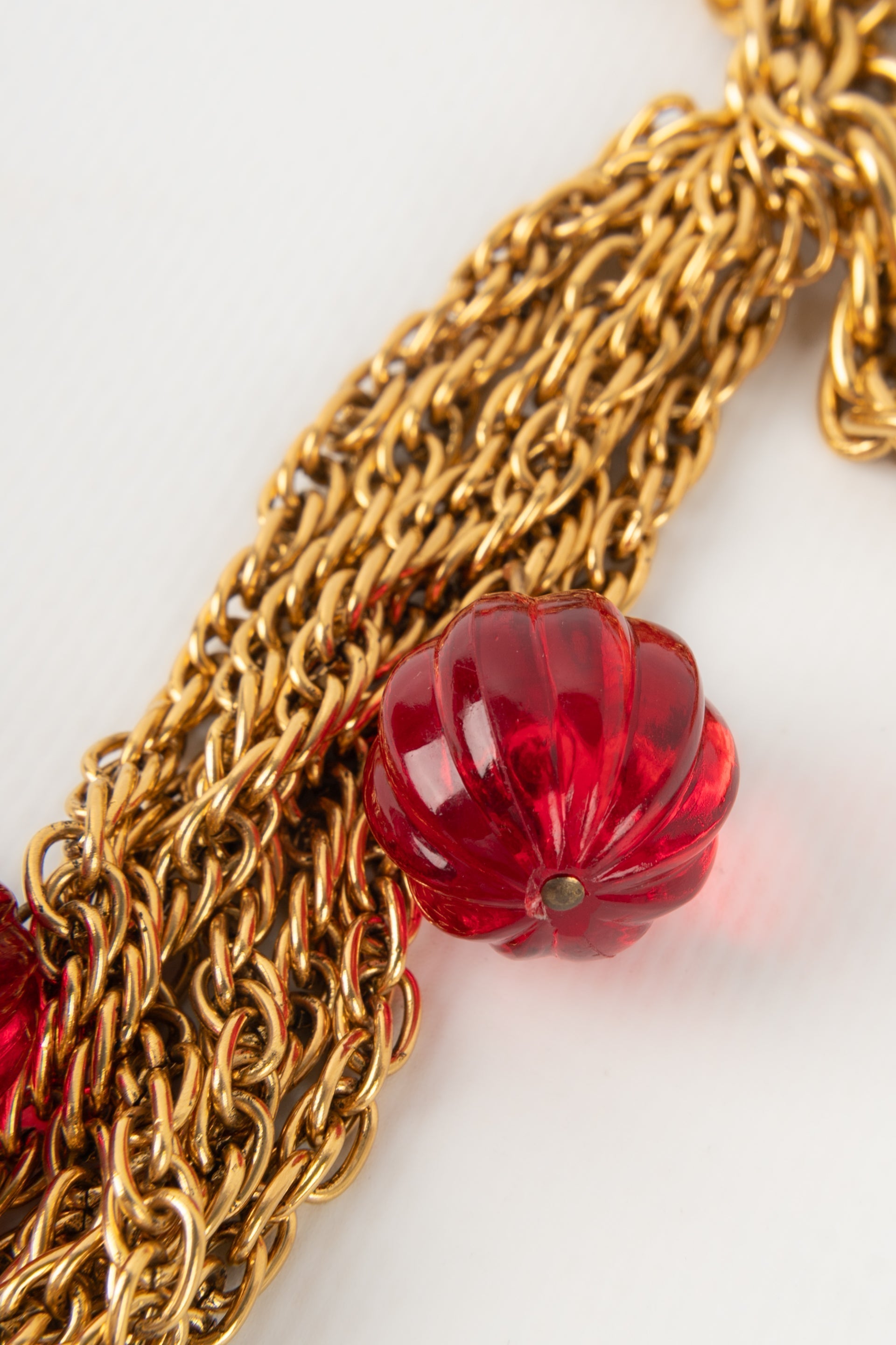 CHANEL - (Made in France) Collier en métal doré et perles rouges. Collection 1984.