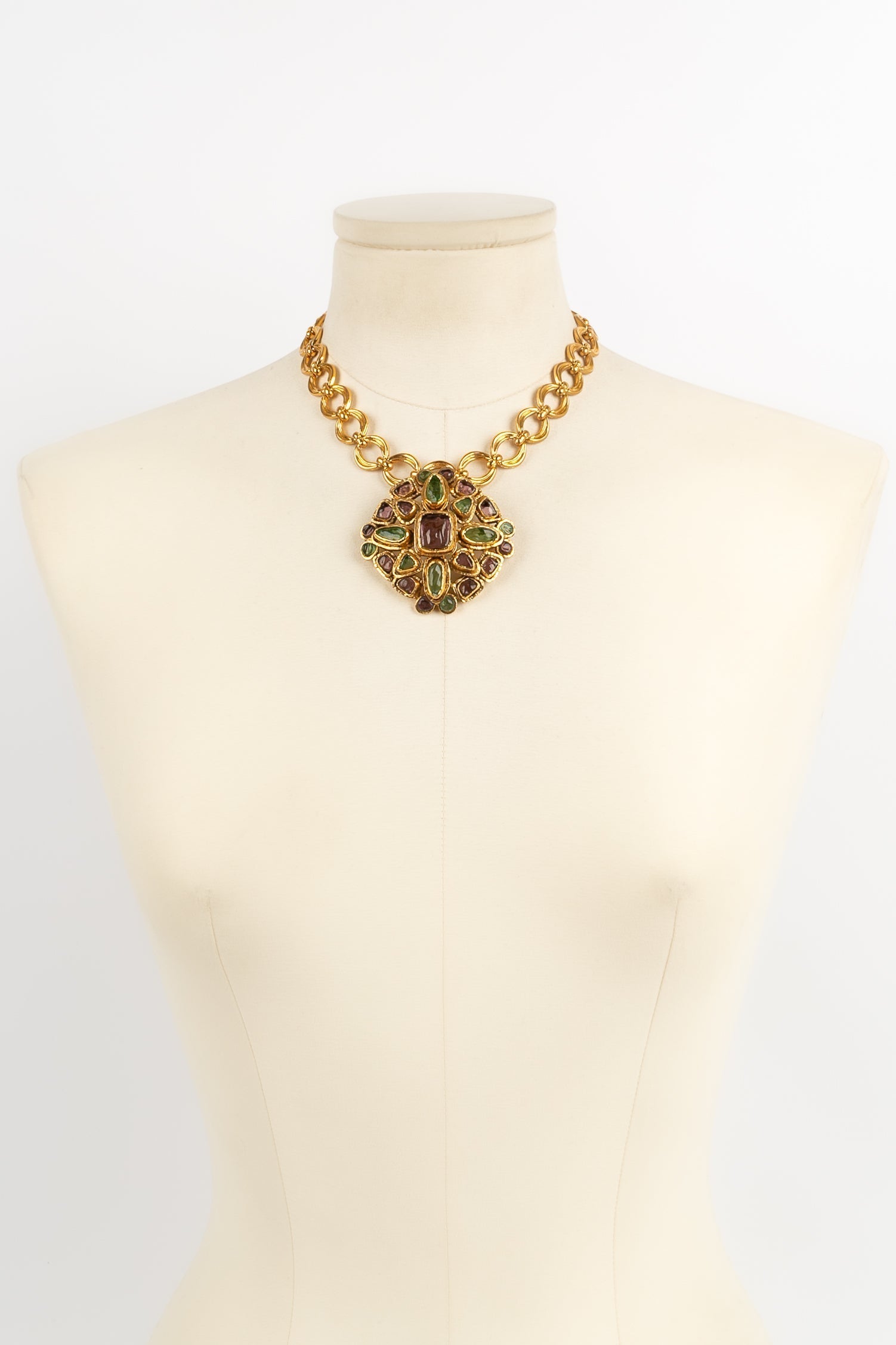 Note: Our Items are totally New High quality Brand Inspired Refurbished. Please make sure you are well aware of it before buying any of the Item. T&C's Apply in case of refunds.Please send us message on below chat to confirm availability. We will send the Refurbished Model in case you place an order with us. Enjoy Shopping.Always Send Us message to confirm availability before buying, In case of refund the transaction fee remains non refundable.�Thank�you. Collier court en m�tal dor� et broche pendentif en m�tal dor� ajour� et p�te de verre. Collection Automne-Hiver 1998.