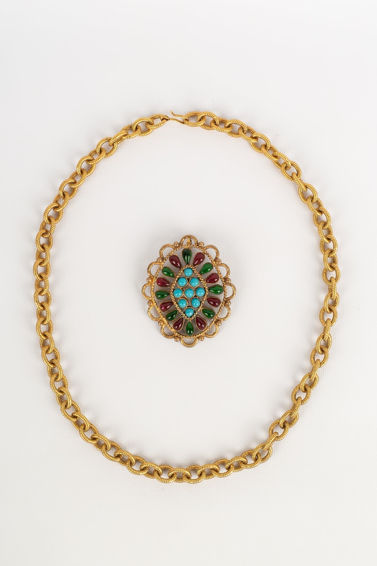 Note: Our Items are totally New High quality Brand Inspired Refurbished. Please make sure you are well aware of it before buying any of the Item. T&C's Apply in case of refunds.Please send us message on below chat to confirm availability. We will send the Refurbished Model in case you place an order with us. Enjoy Shopping.Always Send Us message to confirm availability before buying, In case of refund the transaction fee remains non refundable.�Thank�you. Collier en m�tal dor� et pendentif pav� de cabochons en p�te de verre. Collection Automne-Hiver 1993.