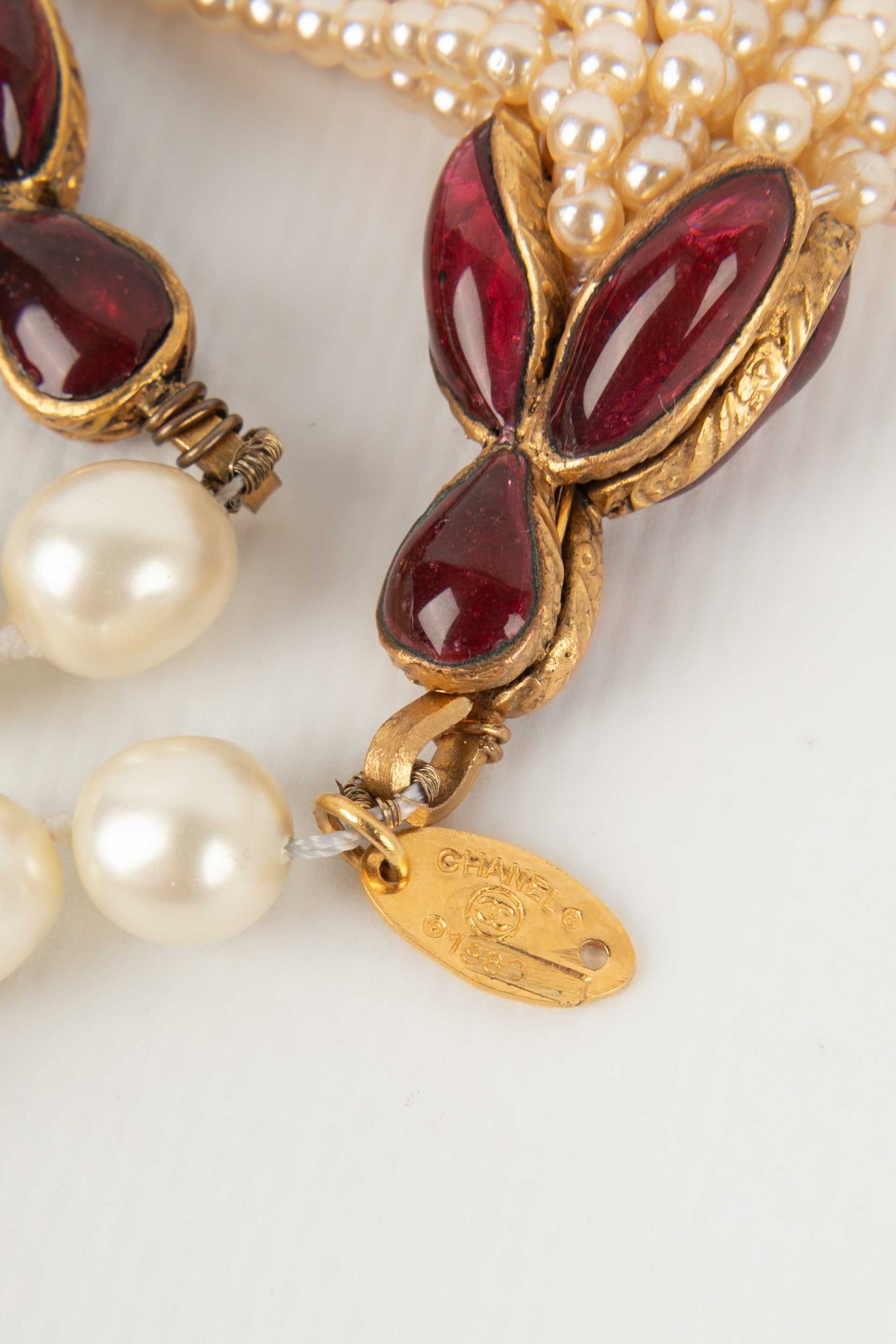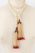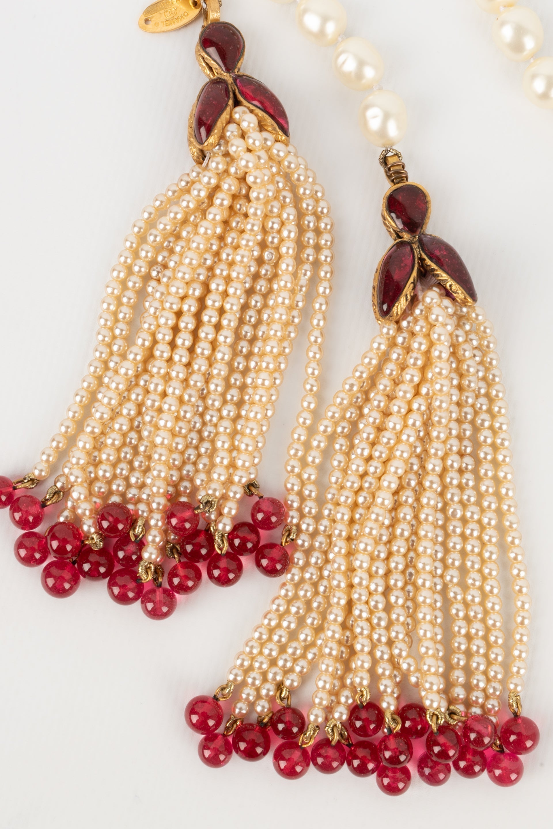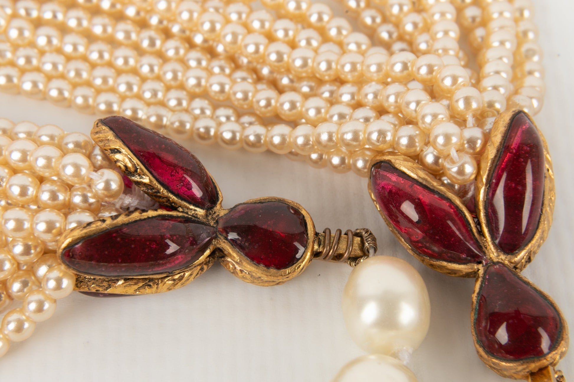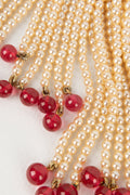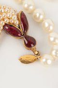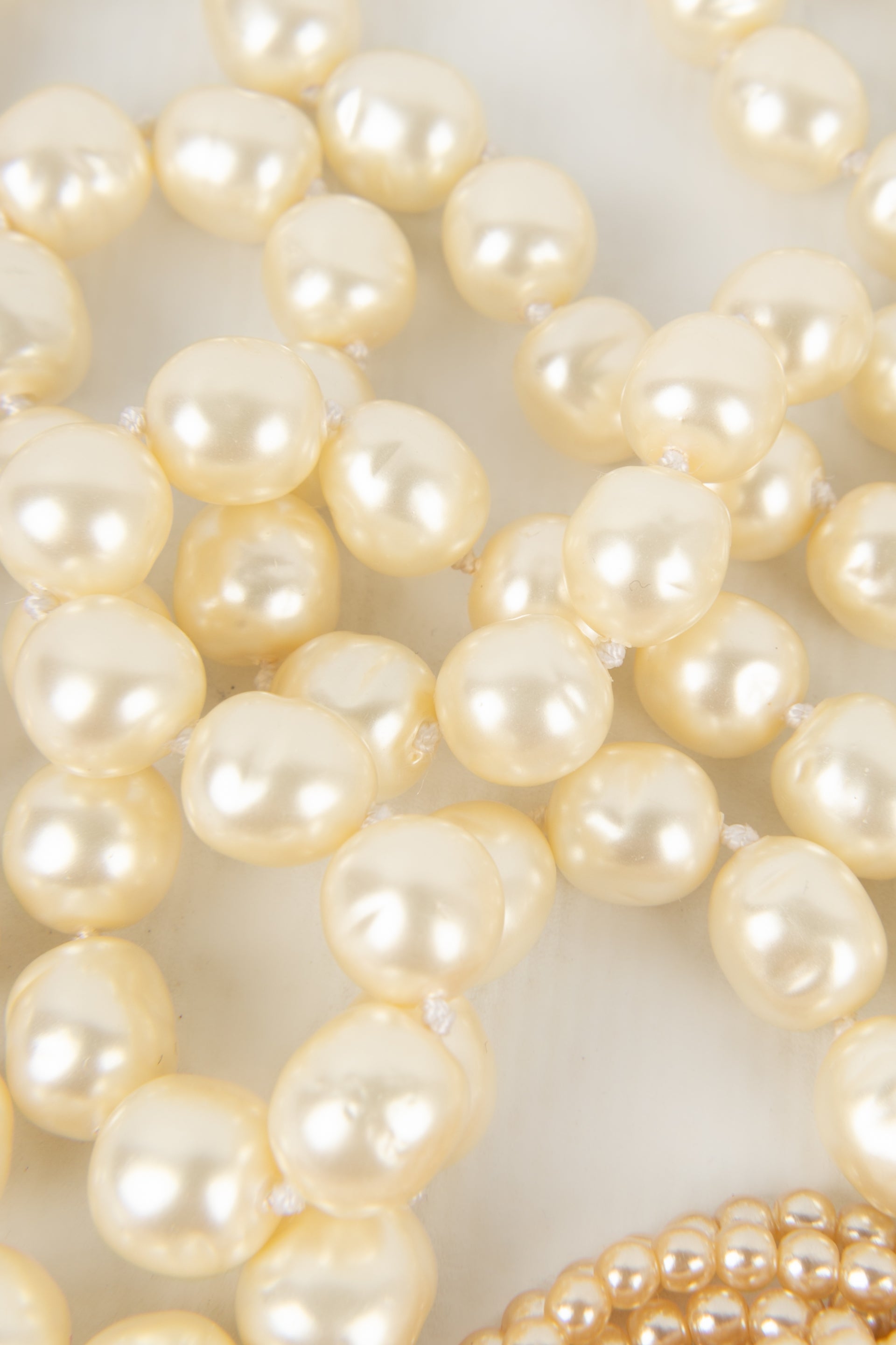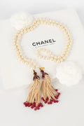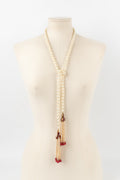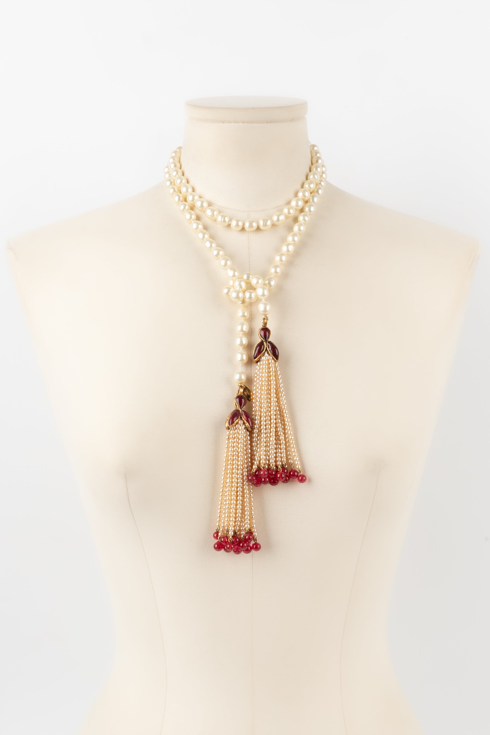 CHANEL - (Made in France) Collier cravate de perles nacrées fantaisies montées à noeuds. Le collier se termine par deux pompons en pâte de verre et métal doré. Collection 1983.