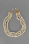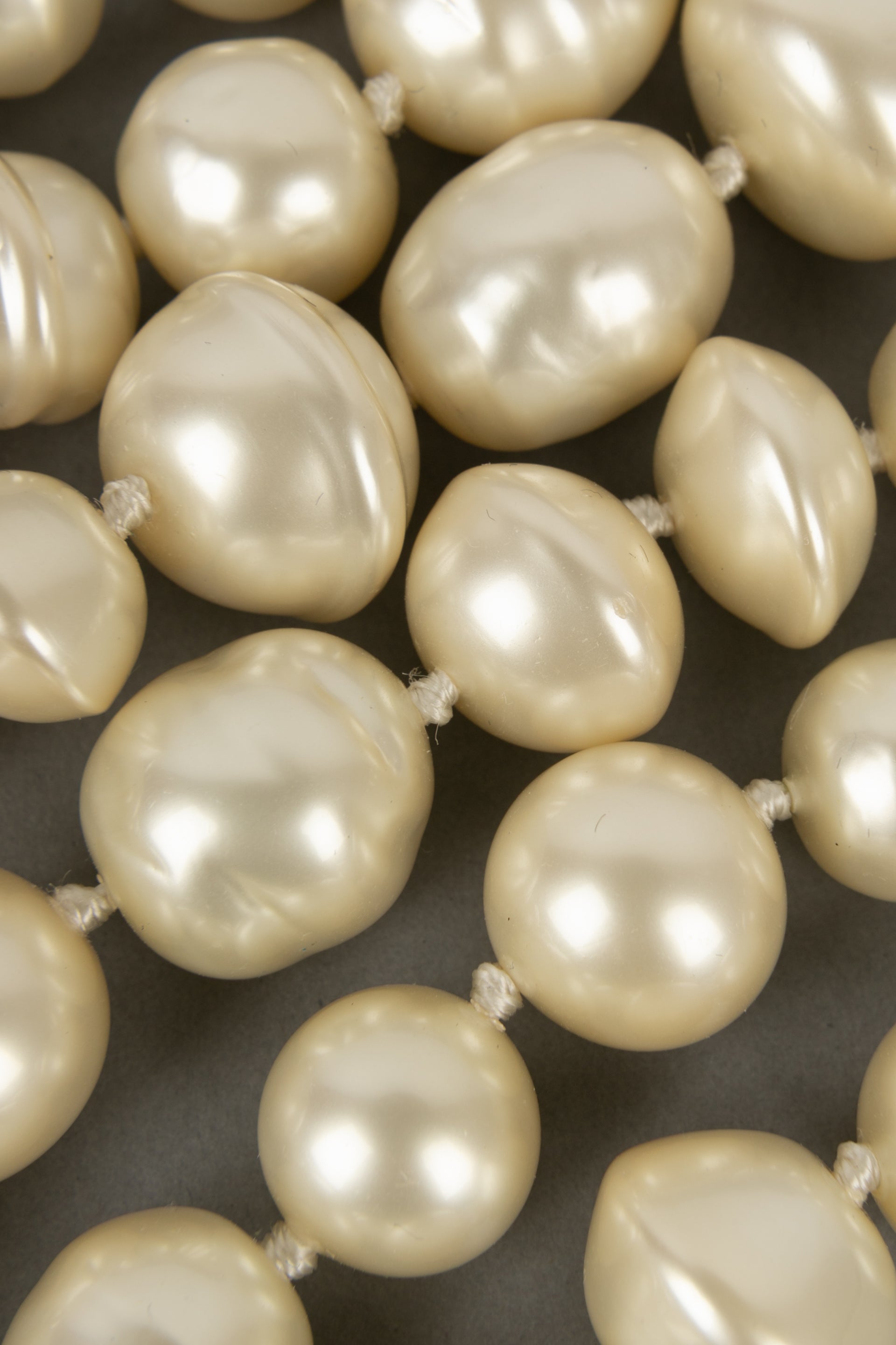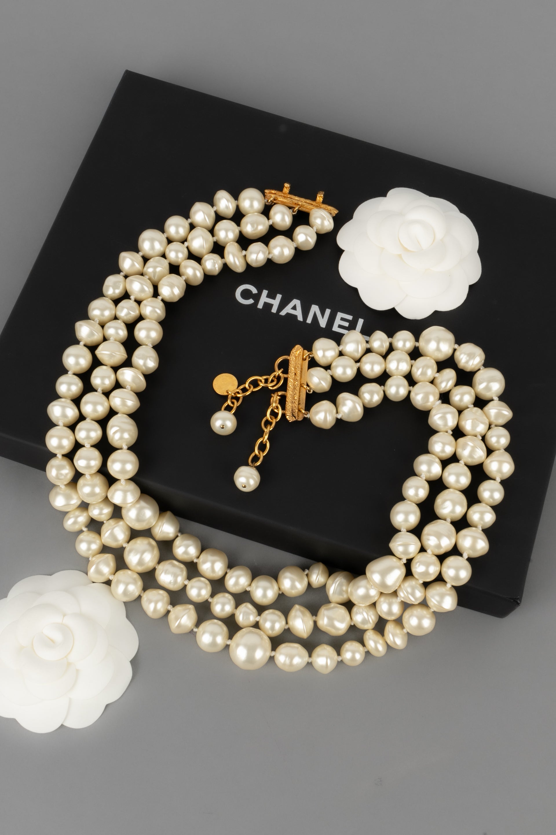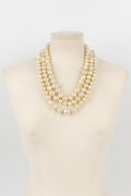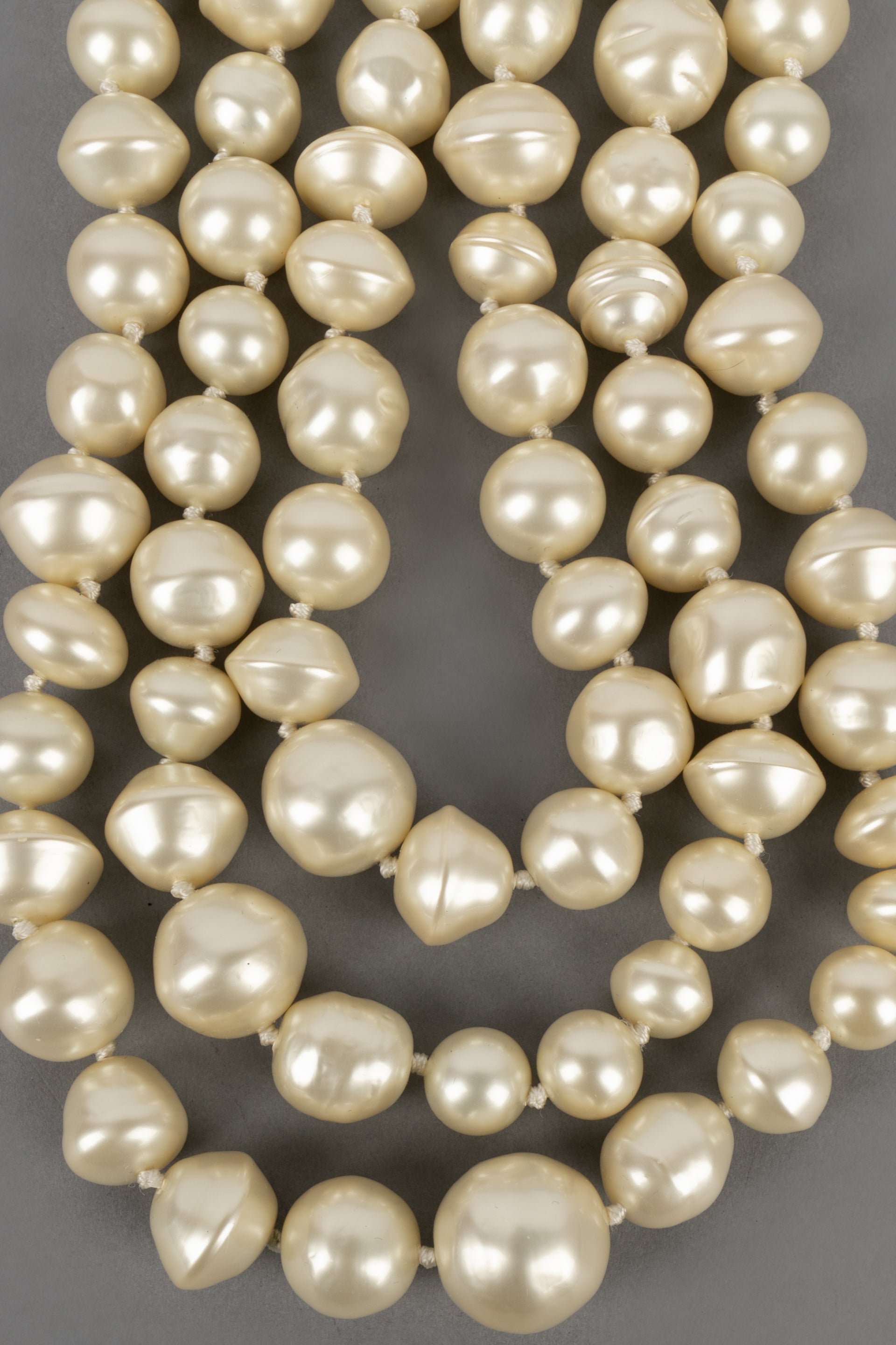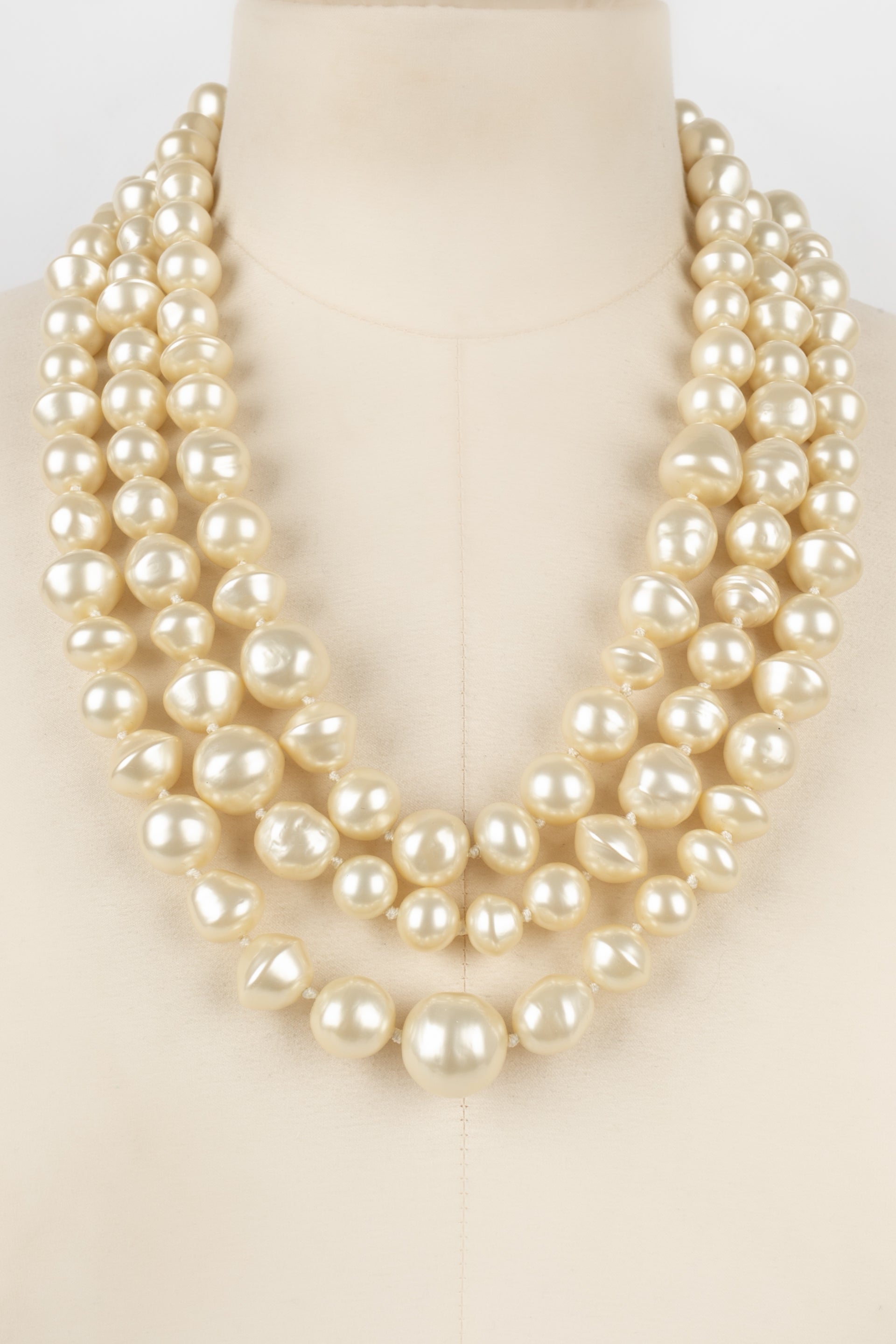 CHANEL - (Made in France) Collier composé de trois rangs de perles nacrées fantaisies montées à noeuds.
