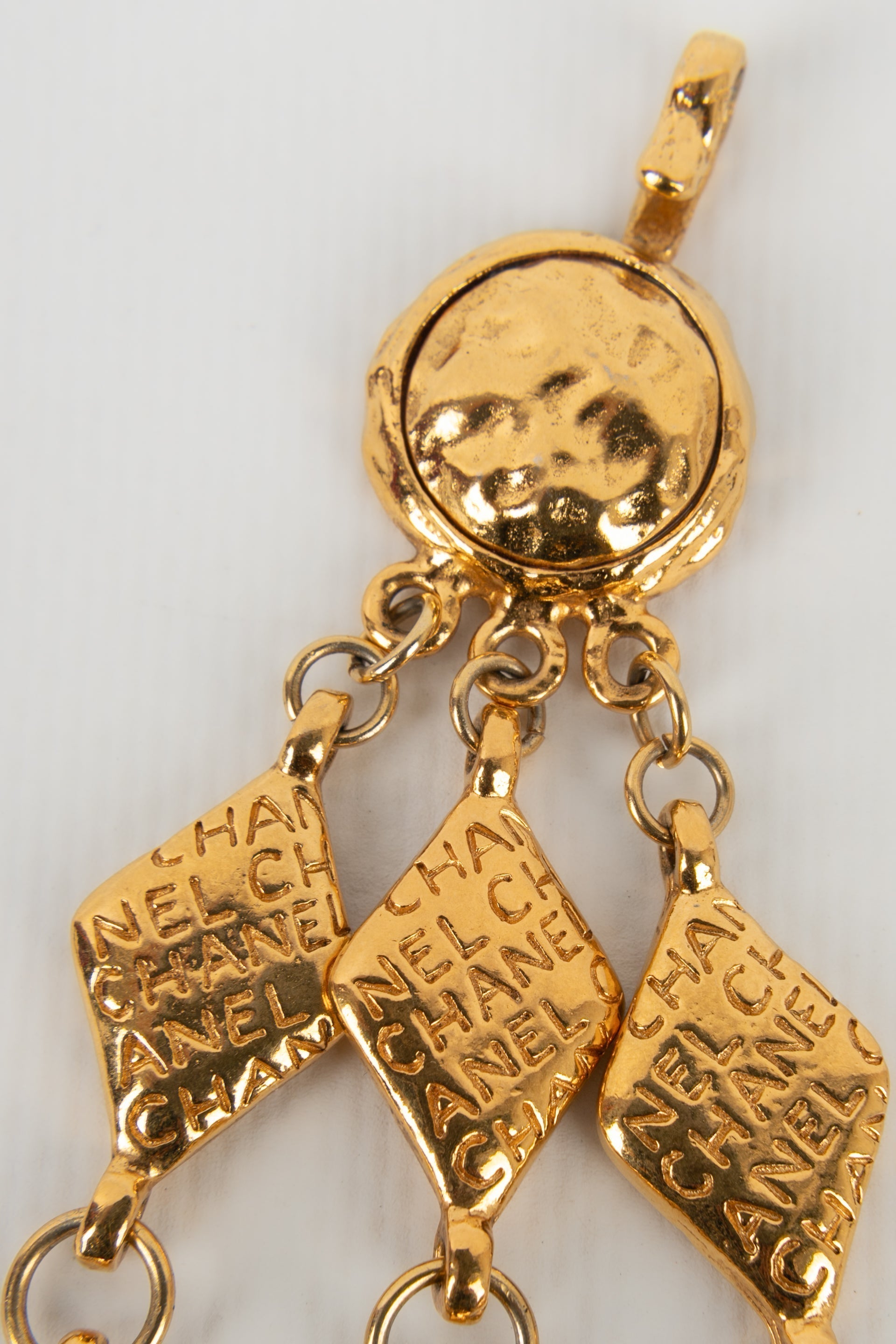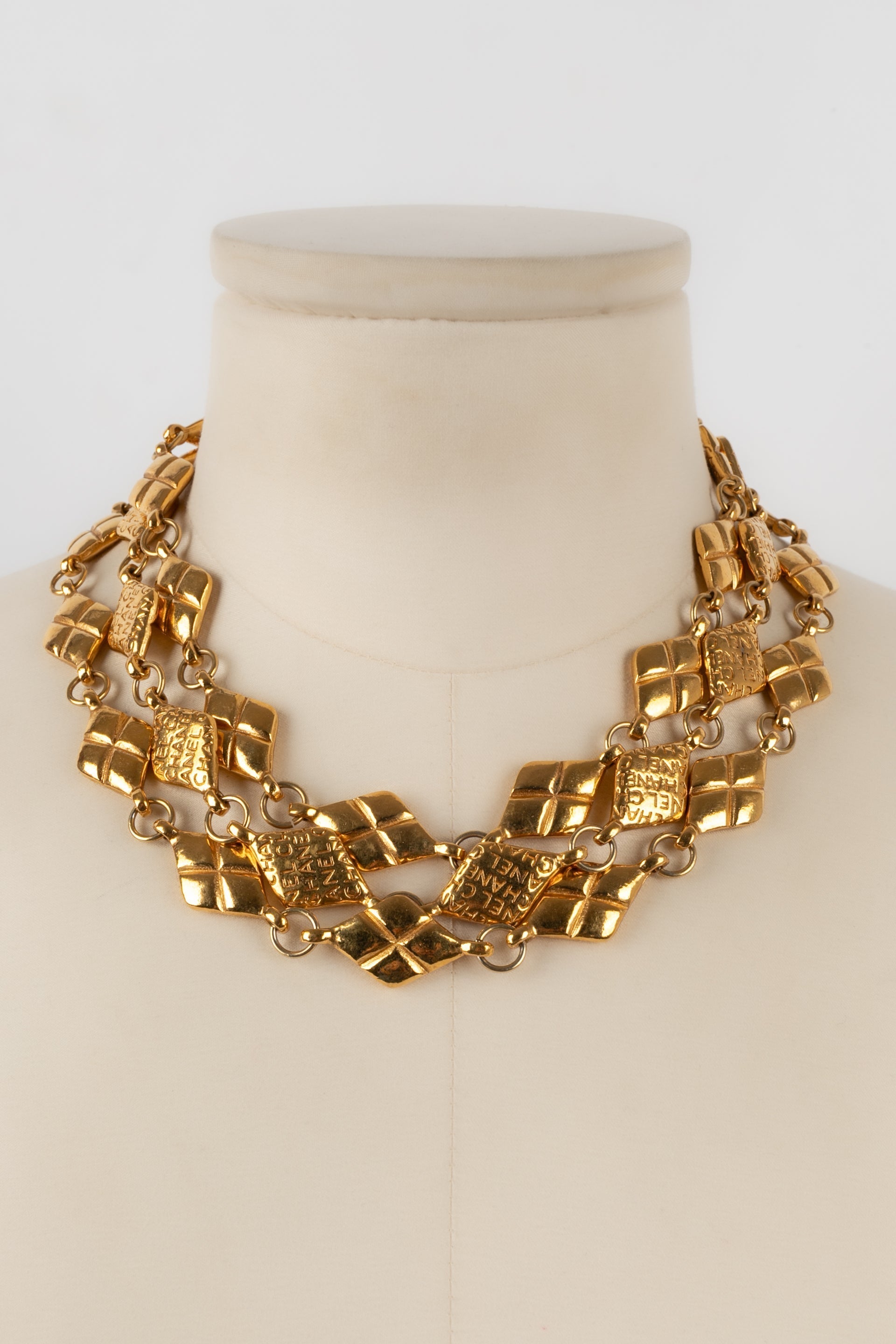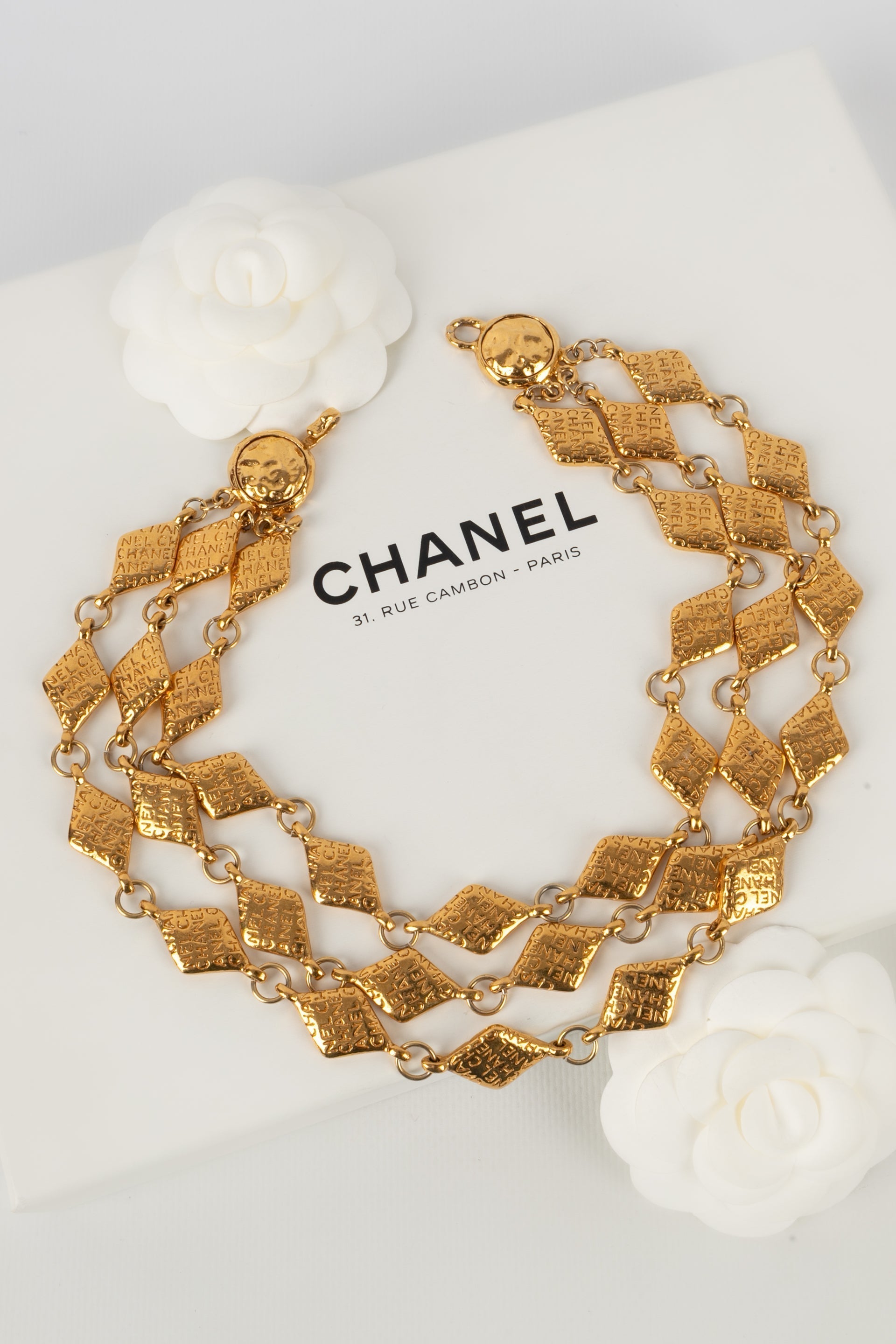 CHANEL - (Made in France) Collier en métal doré composé de trois rangs de médailles gravées "CHANEL". Bijou datant du début des années 1990.