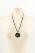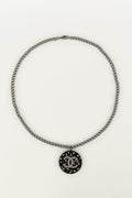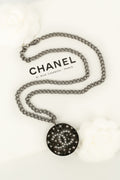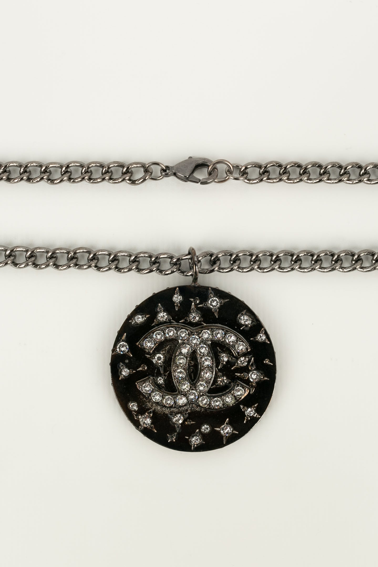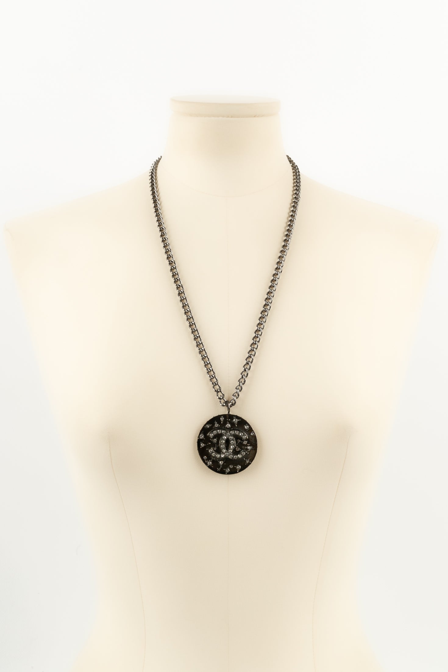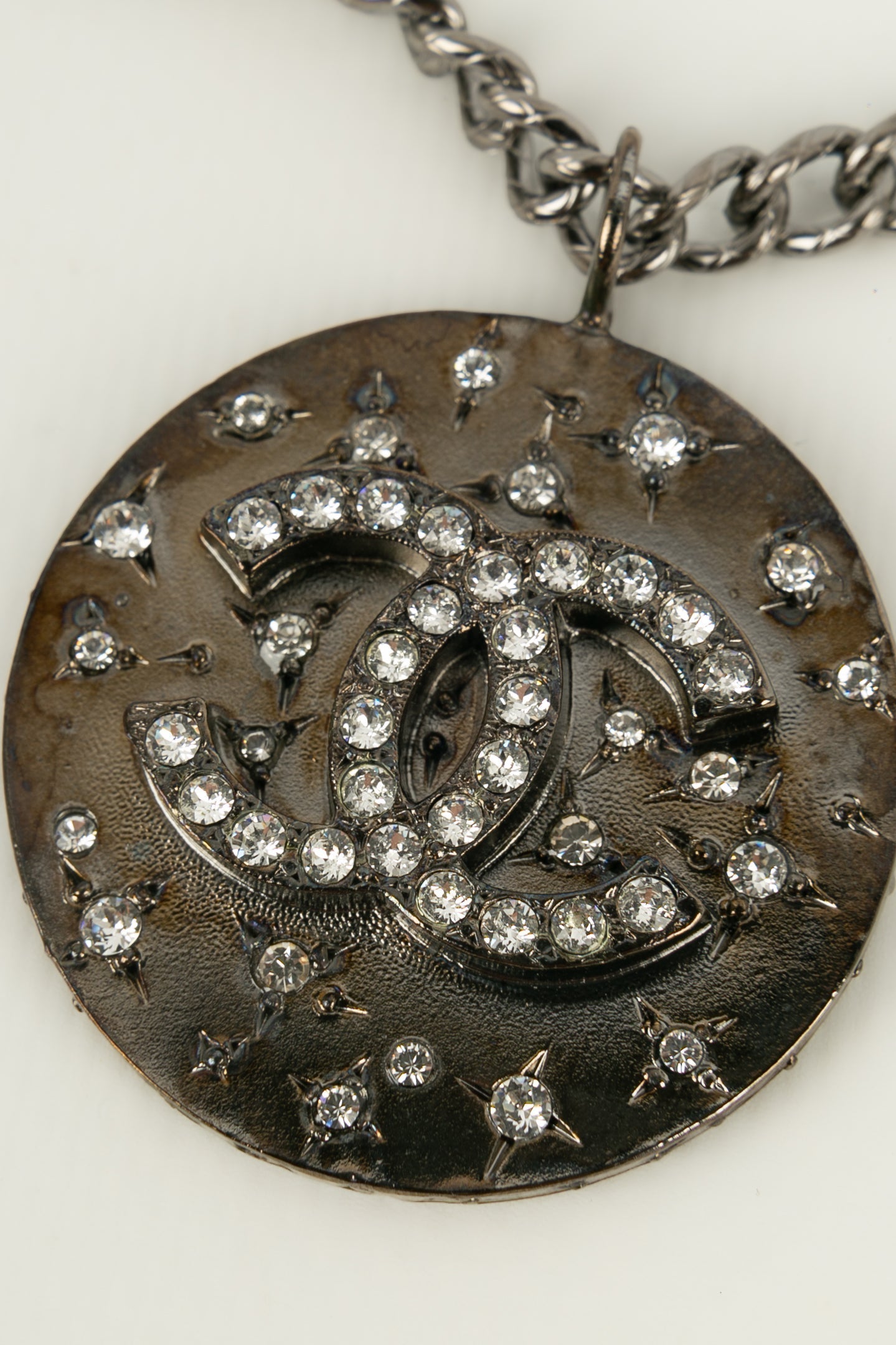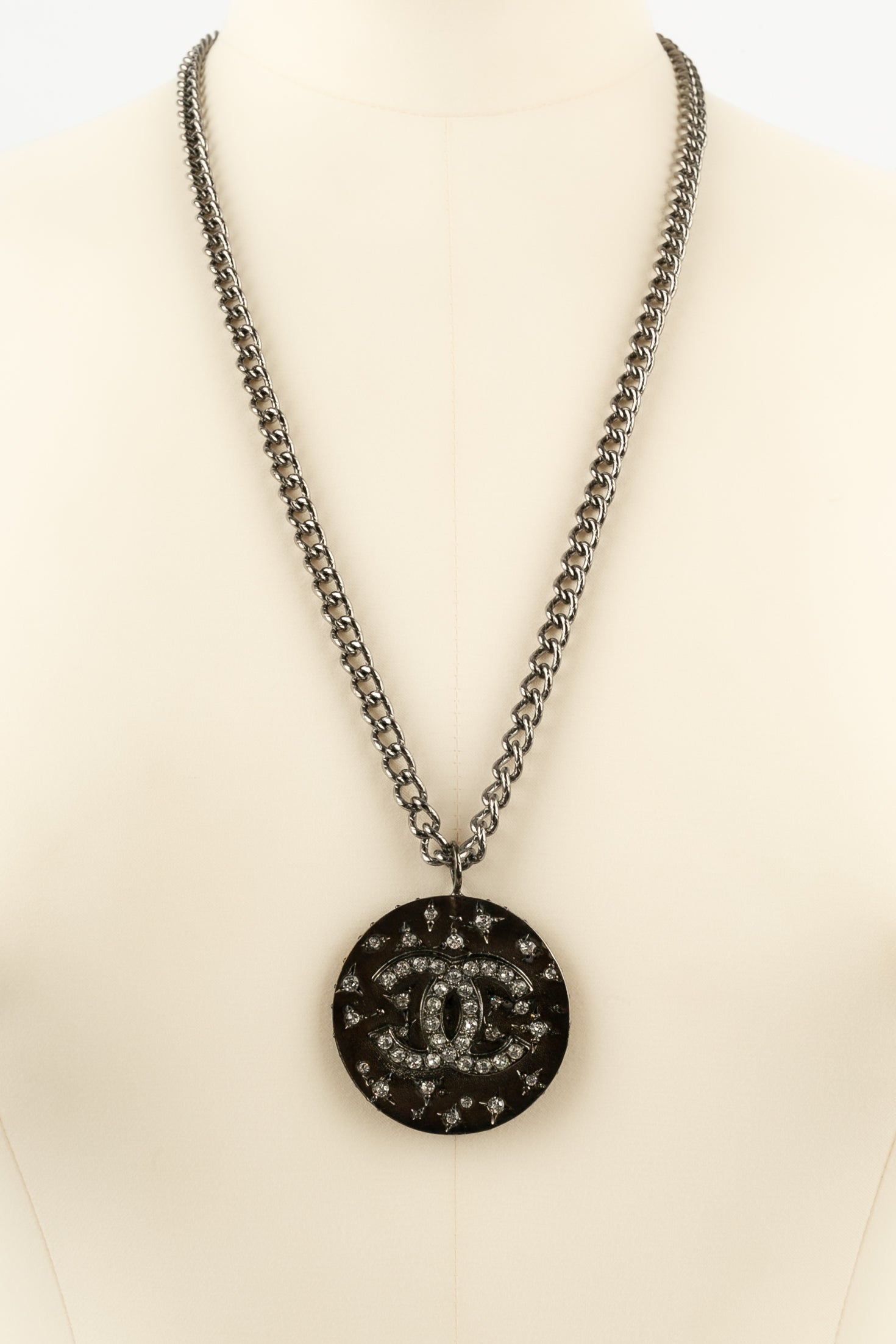 CHANEL - Collier en m�tal argent� fonc� et son pendentif cc pav� de strass de Swarovski. Bijou non sign� issu des ventes priv�es.