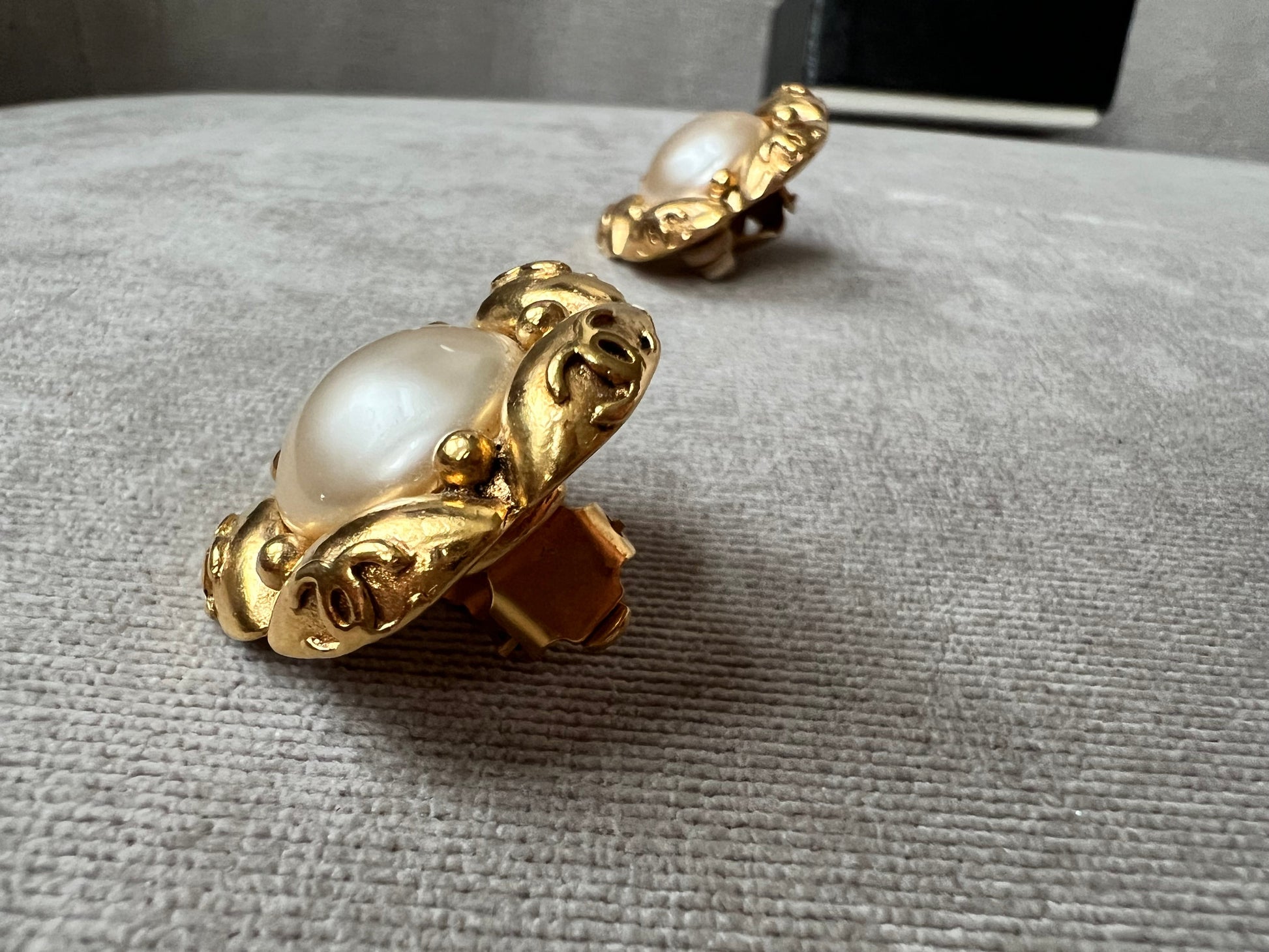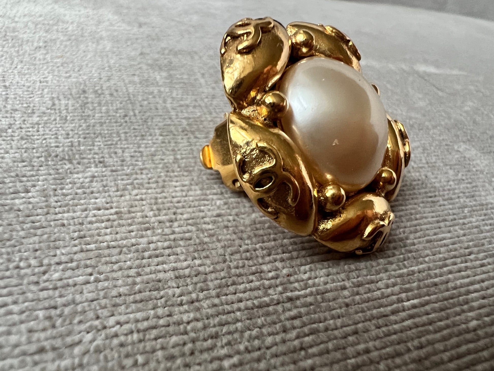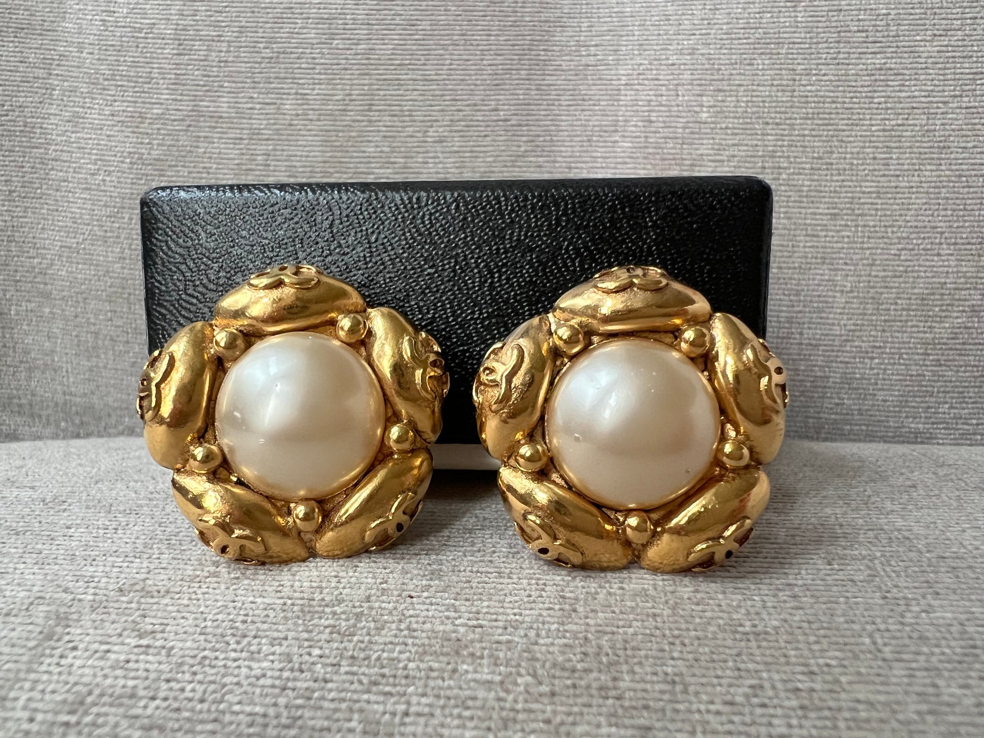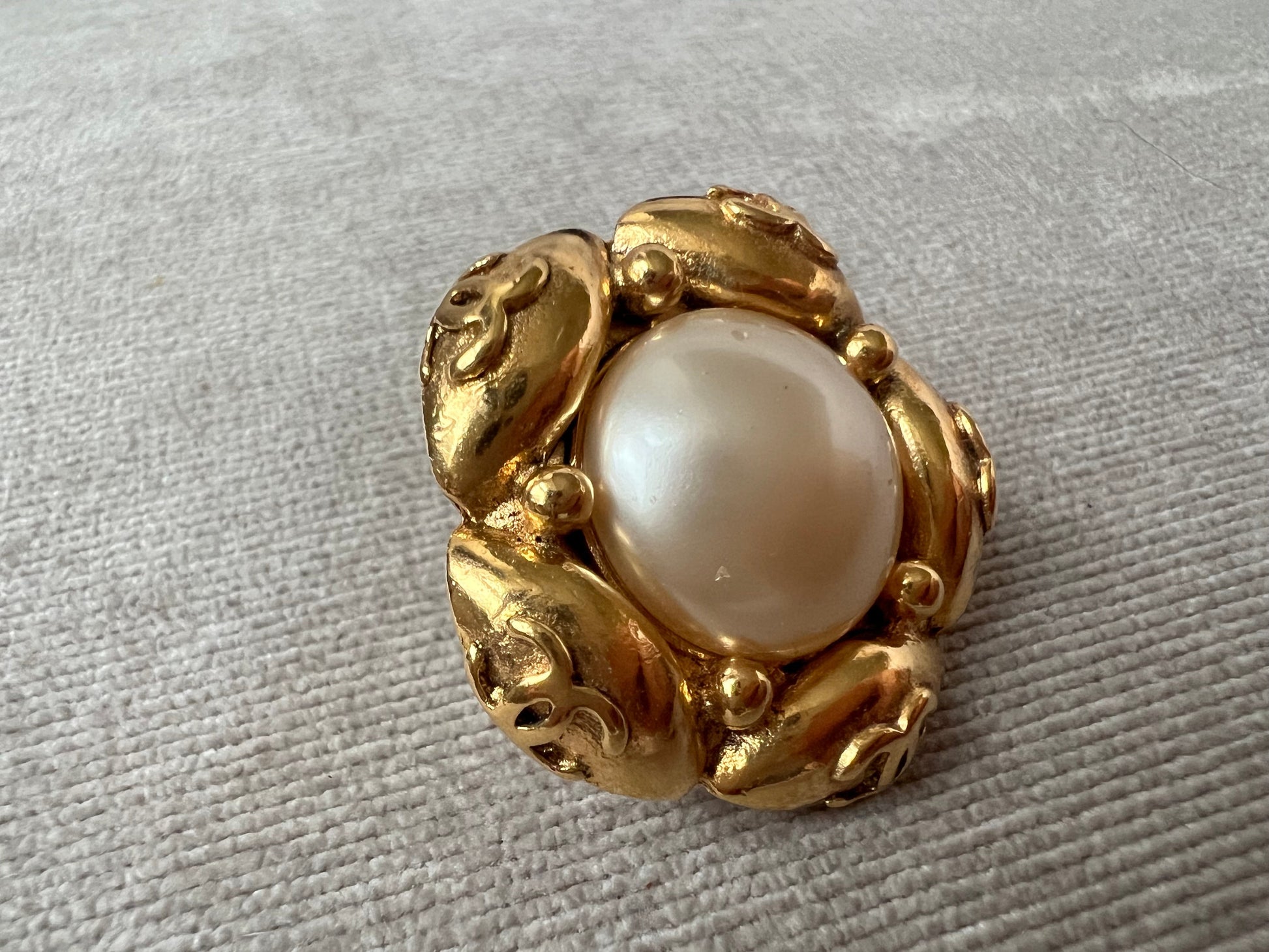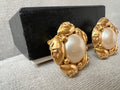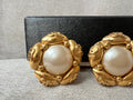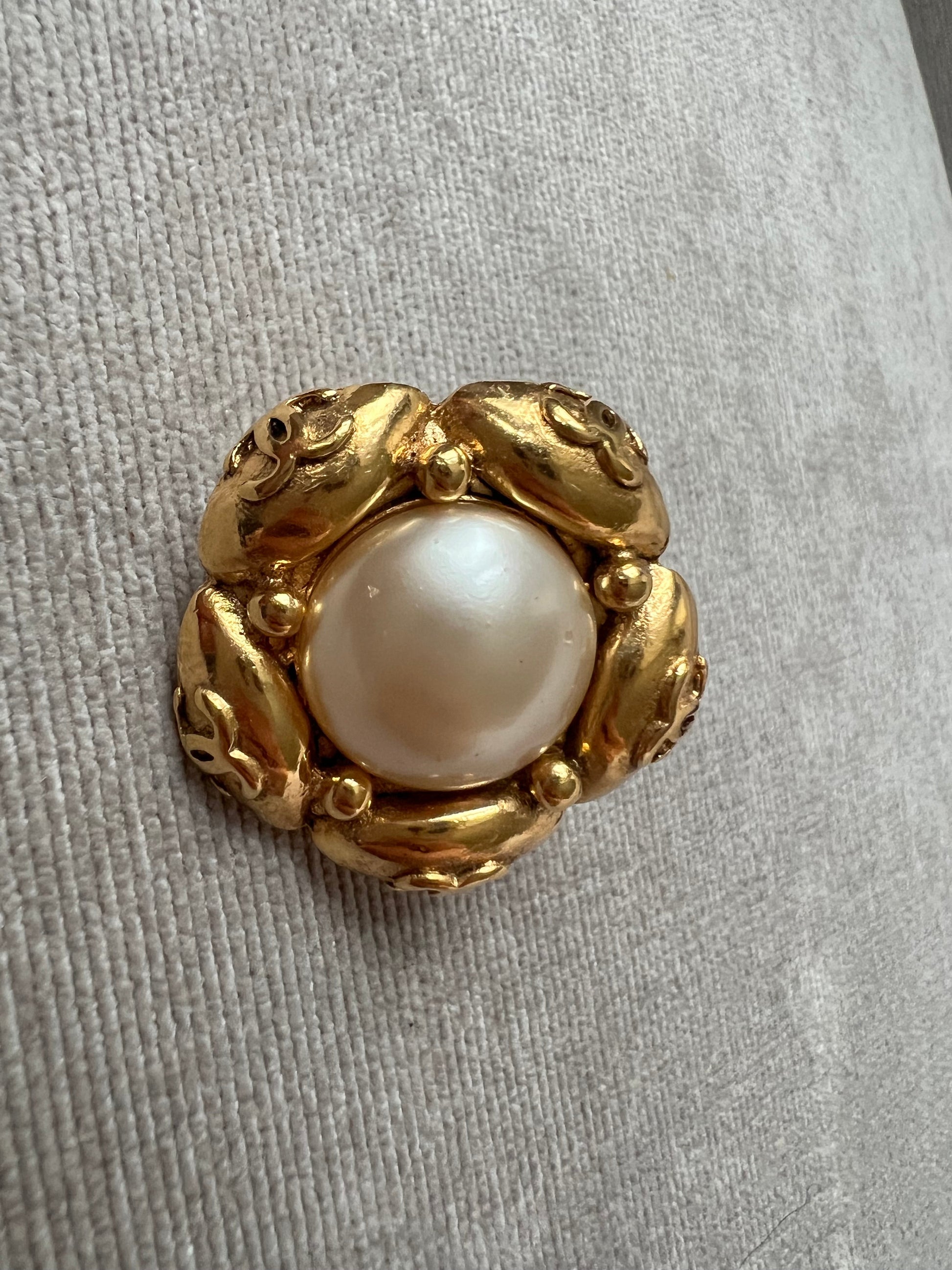 Chanel Vintage Cabochon Gold Plated Pearl CC Clip On Earrings. Faux pearls with gold plating. Clip on (not for pierced earrings). Stunning statement earrings to complement any outfit.