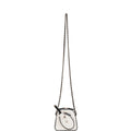 This Limited Edition Runway Tennis mini crossbody bag is in white canvas with light gold tone hardware and has a pocket for tennis racquet mirror, half moon back pocket and an interwoven light gold tone metal chain link and black leather cross body strap.