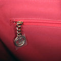 The interior is lined in Pink fabric and has two open pockets on the front wall and a zipper pocket with a Chanel pull on the rear wall.