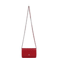 This Wallet on Chain is in Red lambskin with silver tone hardware and has a front flap with CC emblem, half moon back pocket, and an interwoven silver and red leather chain.
