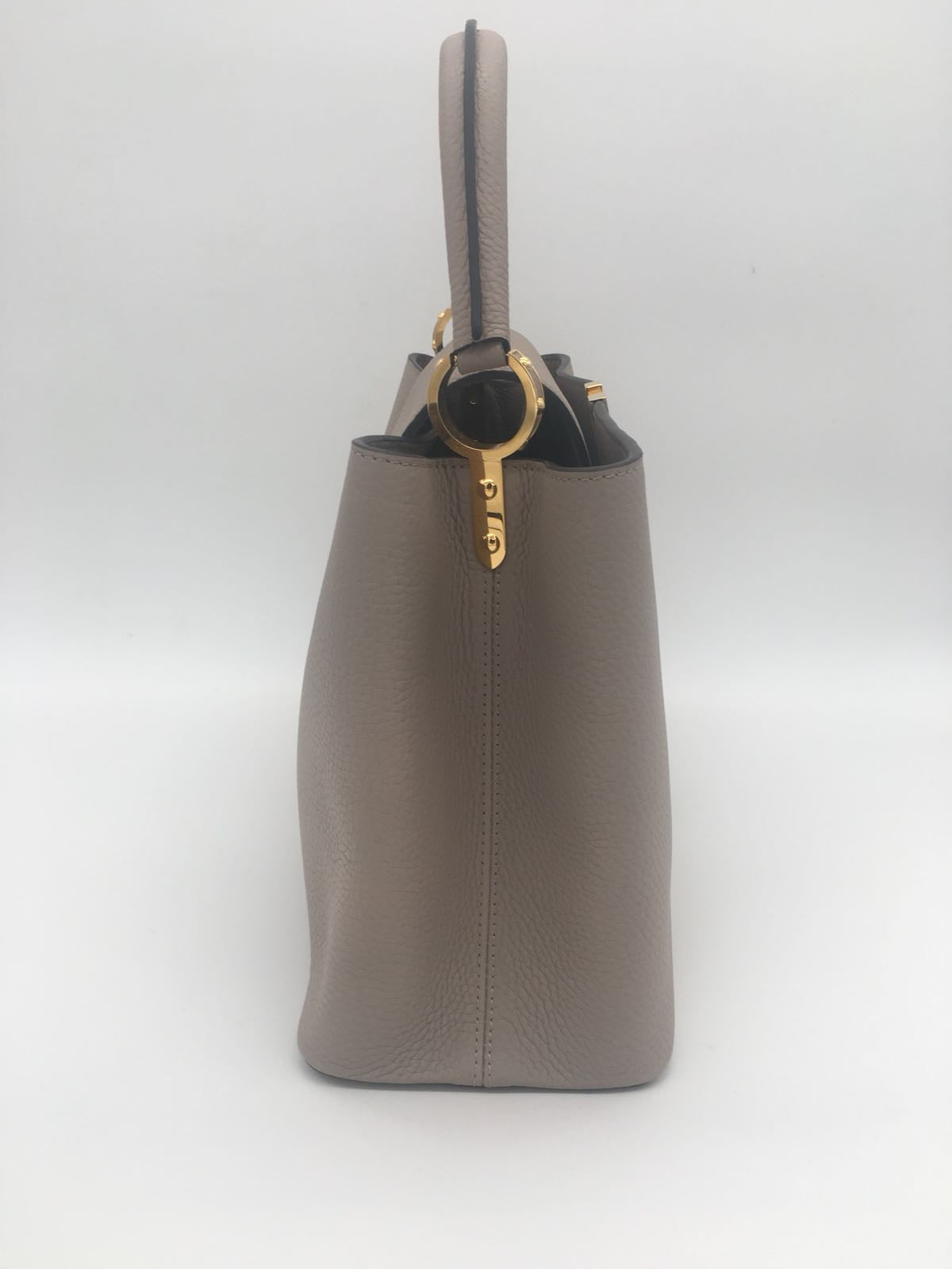 Characteristics: This piece is made of beautiful full grain taurillon leather in gallet, with a matching interior calfskin lining. It features semi-rigid leather handles secured by gold ring handle links and a small cross-over flap that has a monogram fleur in gold. The flap opens to a portioned leather interior, with 2 large interior compartments with 1 flat pocket and 1 zipped pocket. It's unique flap can be two ways: outside to reveal the fleur or inside to show the iconic LV initials. Shoulder, elbow or hand carry options.