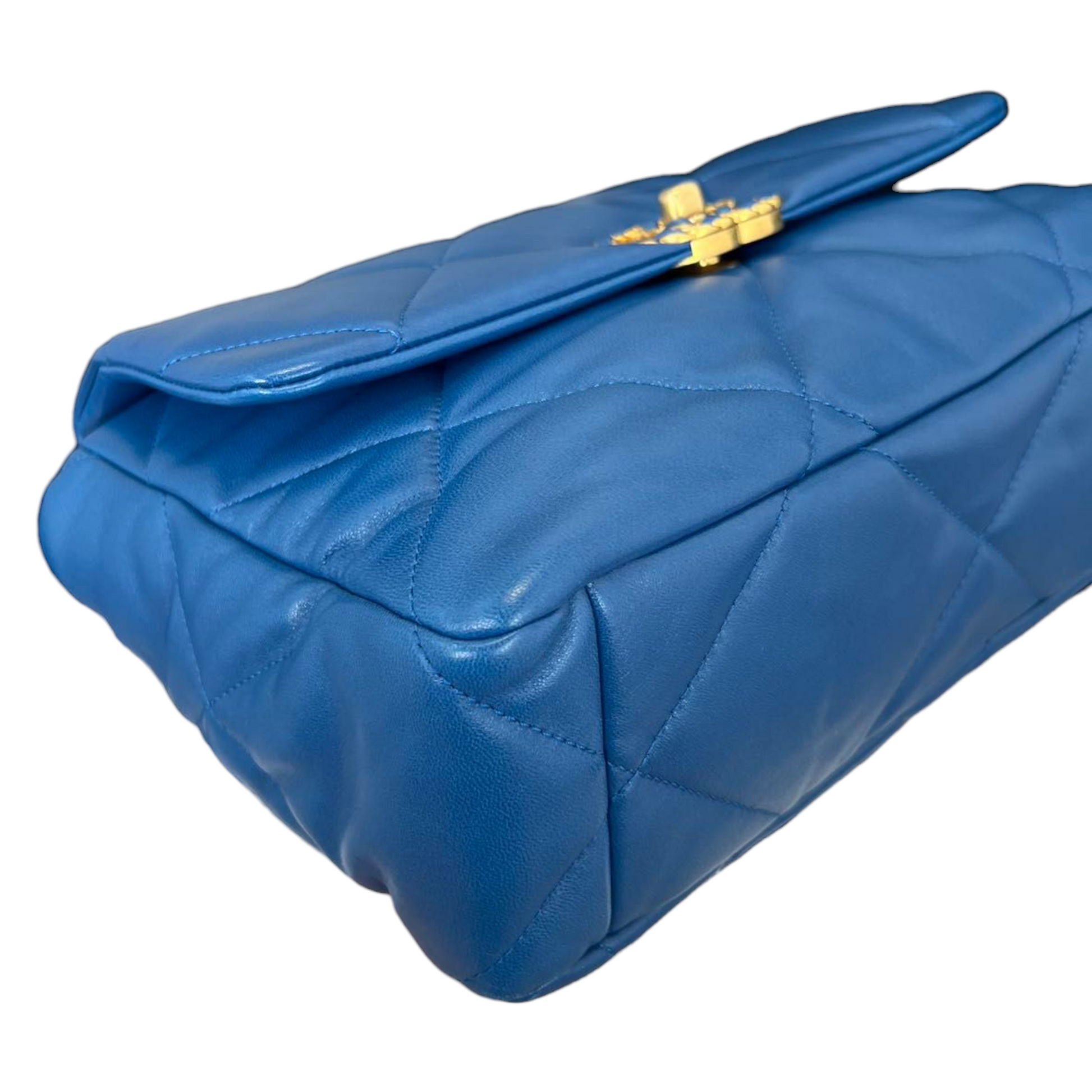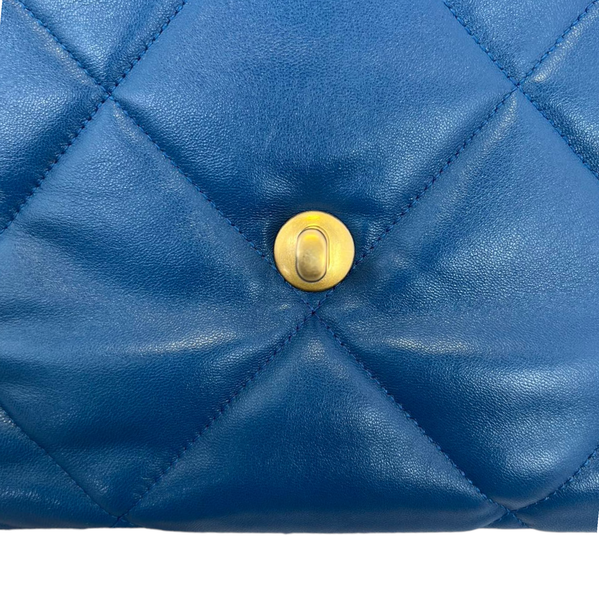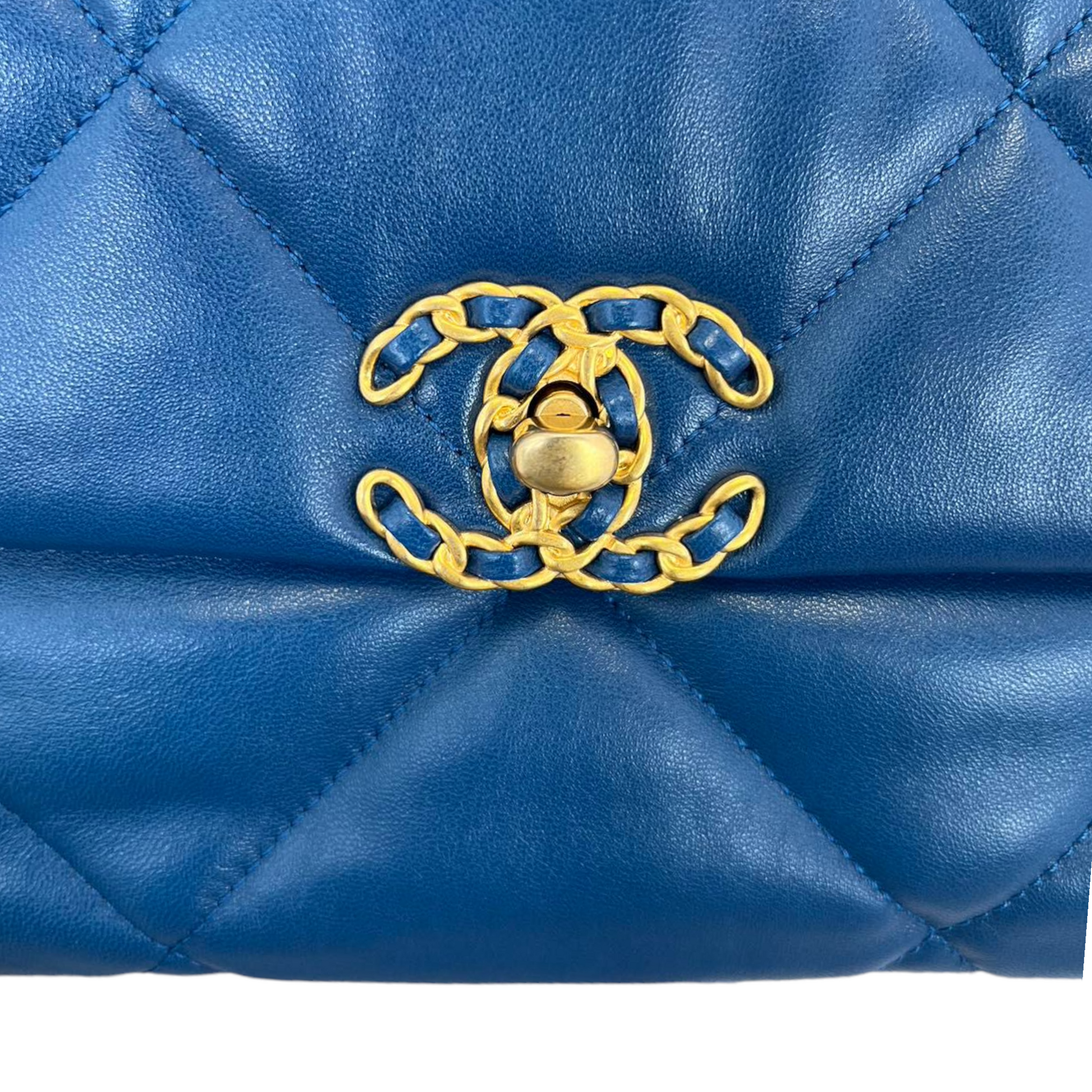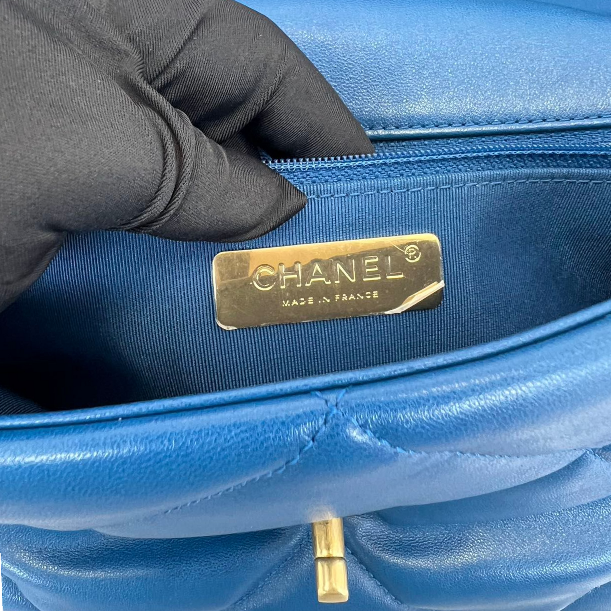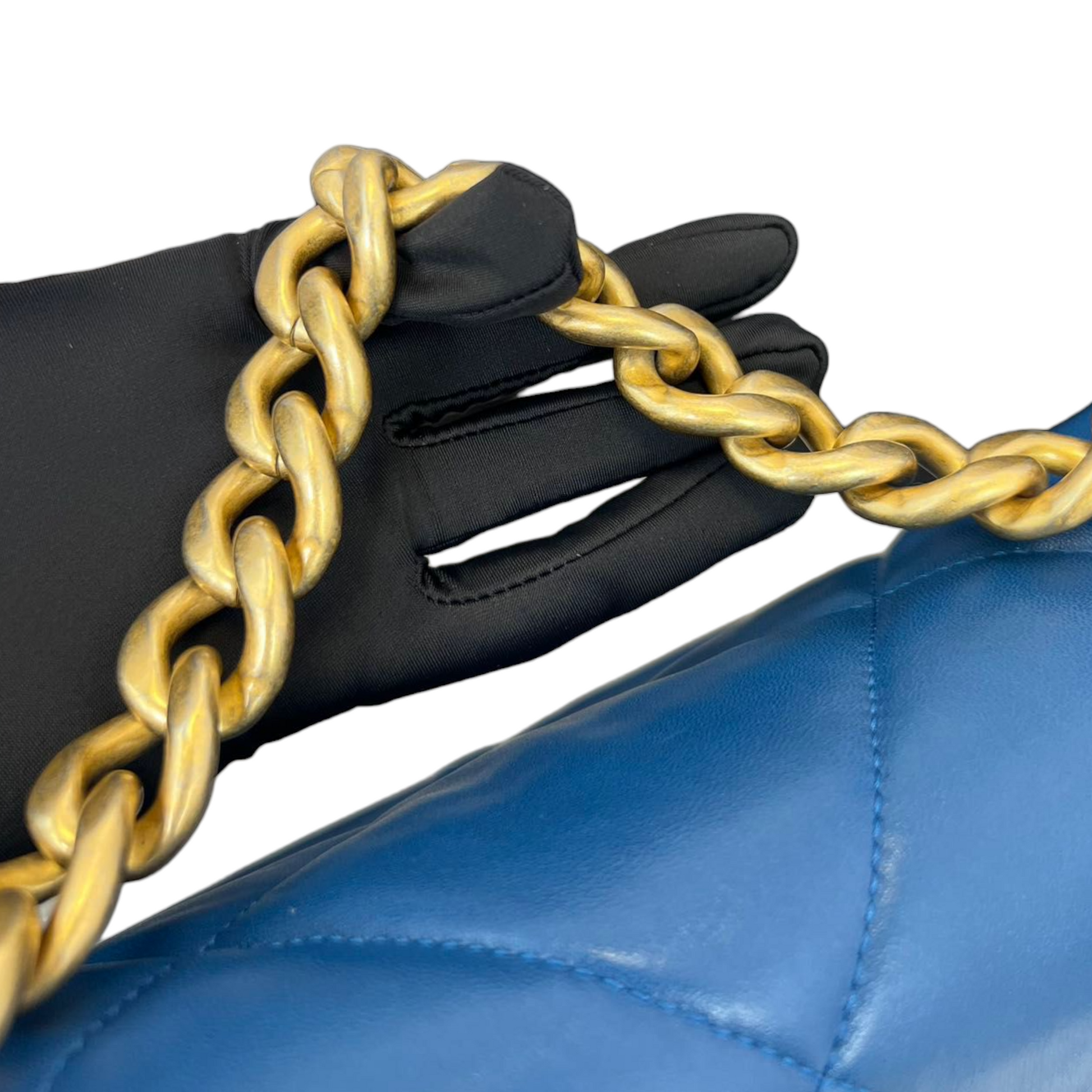 This Chanel 19 Medium features a flap enclosure to maximize space and increase security for your items. Adorned with gold-quilted leather and a beautiful mix of structured and soft with it's goatskin leather exterior. This is a beautiful addition to your collection.