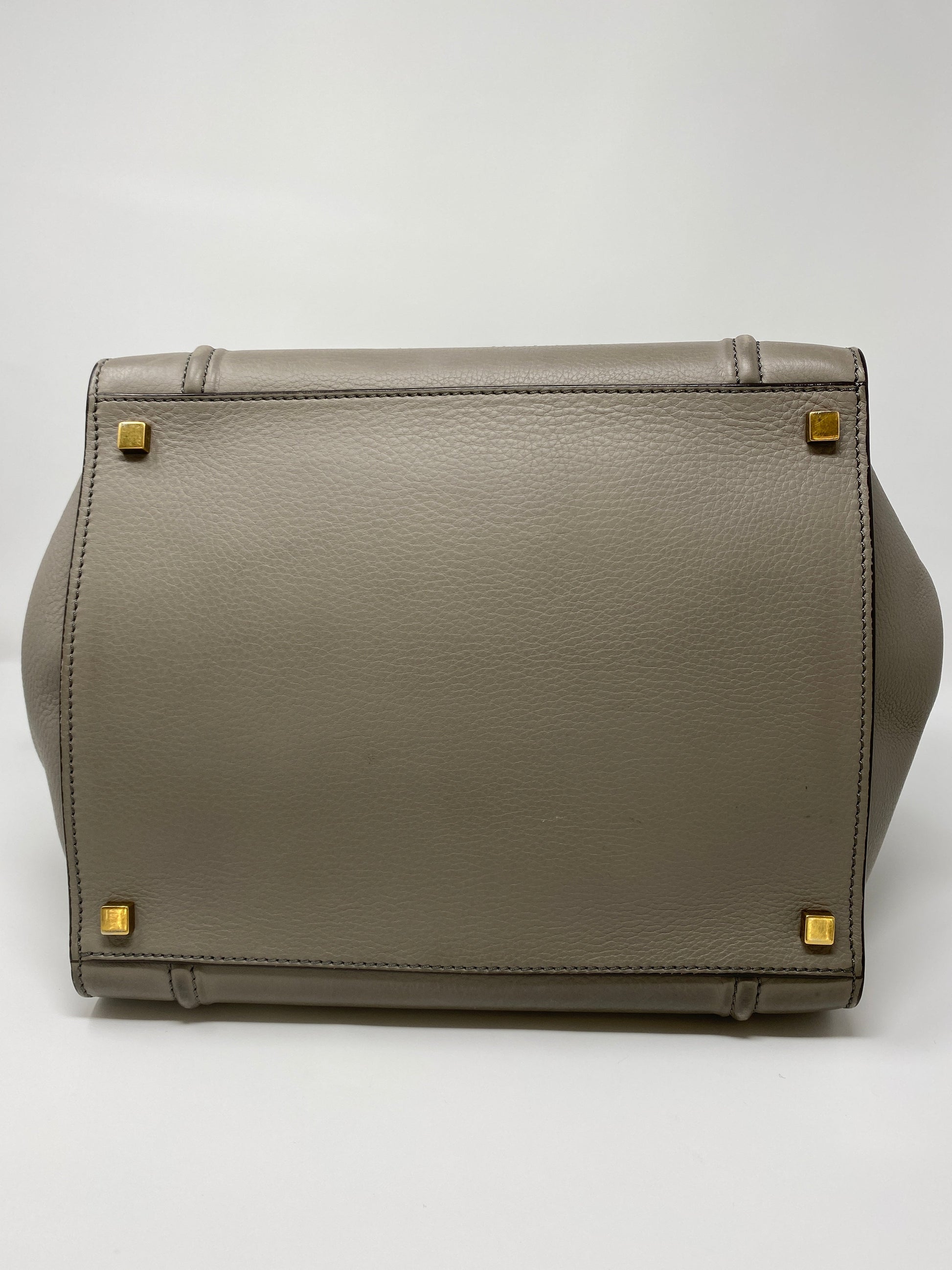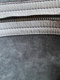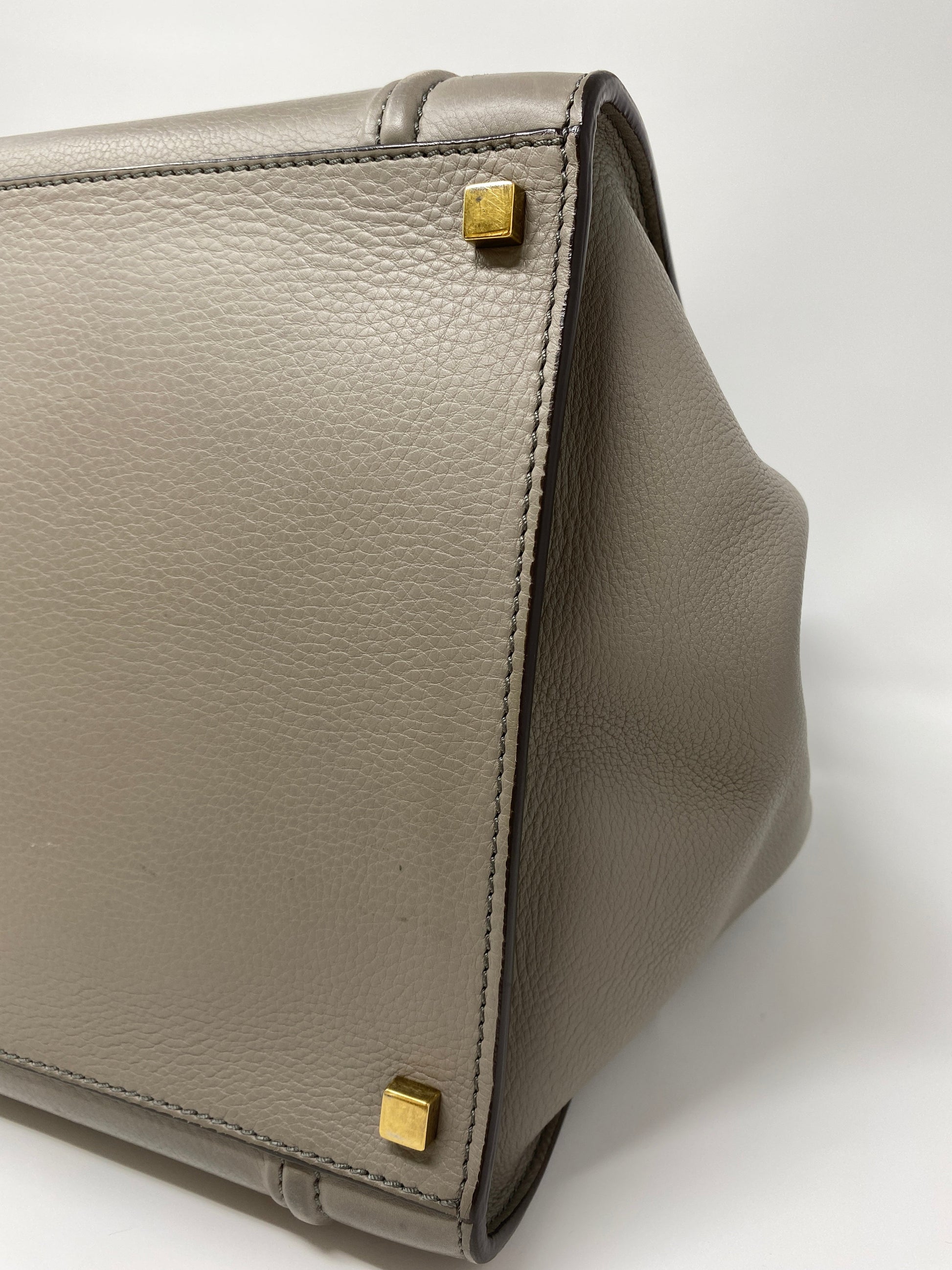 This "old-Céline" Phantom in a beautiful grey drummed calfskin features a leather body and suede interior, dual rolled top handles, antiqued gold-tone hardware, debossed logo and single zip pocket at front face, protective feet at base, tonal hide interior, single interior zip pocket and pull-through closure at top.