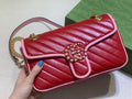 Recalling the color of precious rubies, the GG Marmont is presented in a deep shade of red leather with a delicate pastel pink trim. The shoulder bag is completed by its recognizable Double G hardware, enhanced by tonal details.