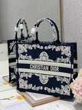 Introduced by Maria Grazia Chiuri, Creative Director of CHRSTN DR, the DYOR Book Tote has become a staple of the DYOR aesthetic. Designed to hold all the daily essentials, the style is fully embroidered with a blue Toile de Jouy Reverse motif, a variation of the House’s hallmark pattern with a play on reversed colors. Adorned with the ‘CHRSTN DR PARIS’ signature on the front, the medium tote exemplifies the House’s signature savoir-faire and may be carried by hand or worn over the shoulder.