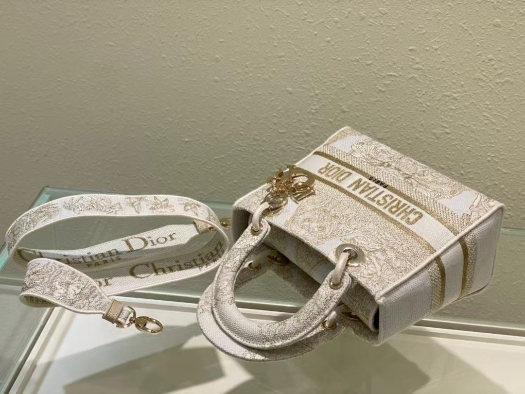 The Lady D-Lite bag combines classic TLMgance with House modernity. The style is fully embroidered resonating with the collection’s Greek inspiration through a romantic print. The front features a ‘CHRSTN DR PARIS’ signature while the thick ‘D.I.O.R.’ charms in pale gold-finish metal embellish and illuminate the silhouette. Equipped with a wide, reversible and removable embroidered shoulder strap, the medium Lady D-Lite bag can be carried by hand or worn crossbody.