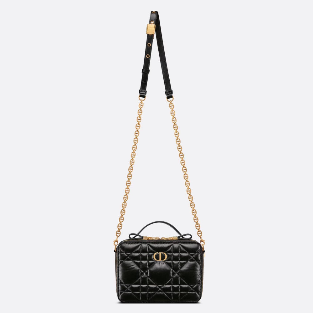 Maria Grazia Chiuri's Dior Caro box Bag is a modern creation. Crafted in calfskin, it stands out with a unique Macrocannage quilted effect and a spacious compartment, including three card slots, to accommodate all the daily essentials. The removable chain strap features a leather insert for comfortable and adjustable wear, either over the shoulder or crossbody, while the handle allows it to be carried by hand. CD signature on the front Zip closure 1 interior compartment 3 card slots Removable and adjustable chain shoulder strap with leather insert May be paired with the collection's shoulder straps and micro shoulder straps Made in ItalyCalfskin Product code:S5140UNGX_M900