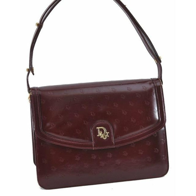For sale is a vintage, Christian Dior, 'Kelly' style top handle shoulder purse made of burgundy leather with an embossed oblique Dior logo design, an envelope top, two strap settings, gold hardware, multiple interior compartments, and an expandable bottom! This is a one of a kind, vintage style from Dior that will look great with anything and everything!