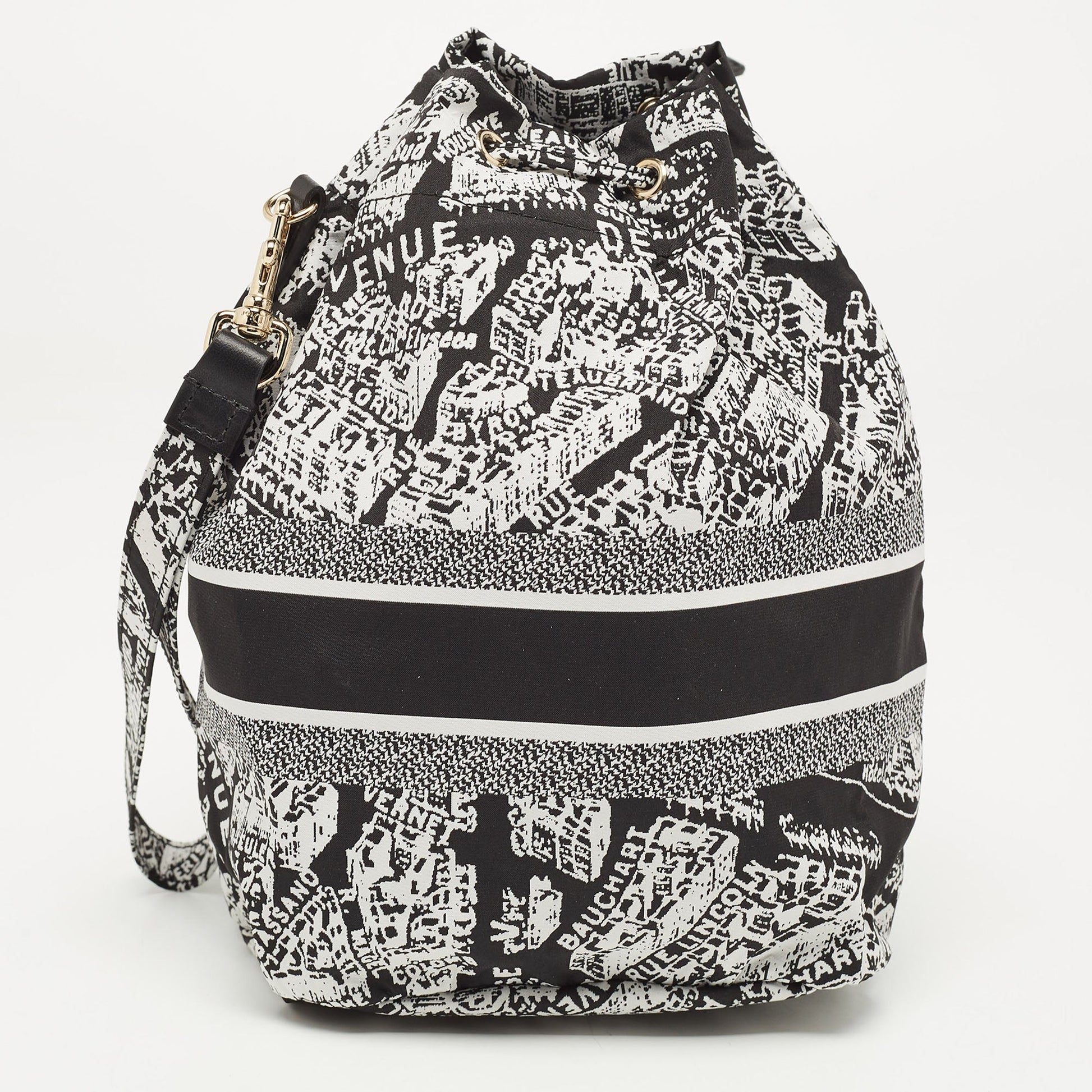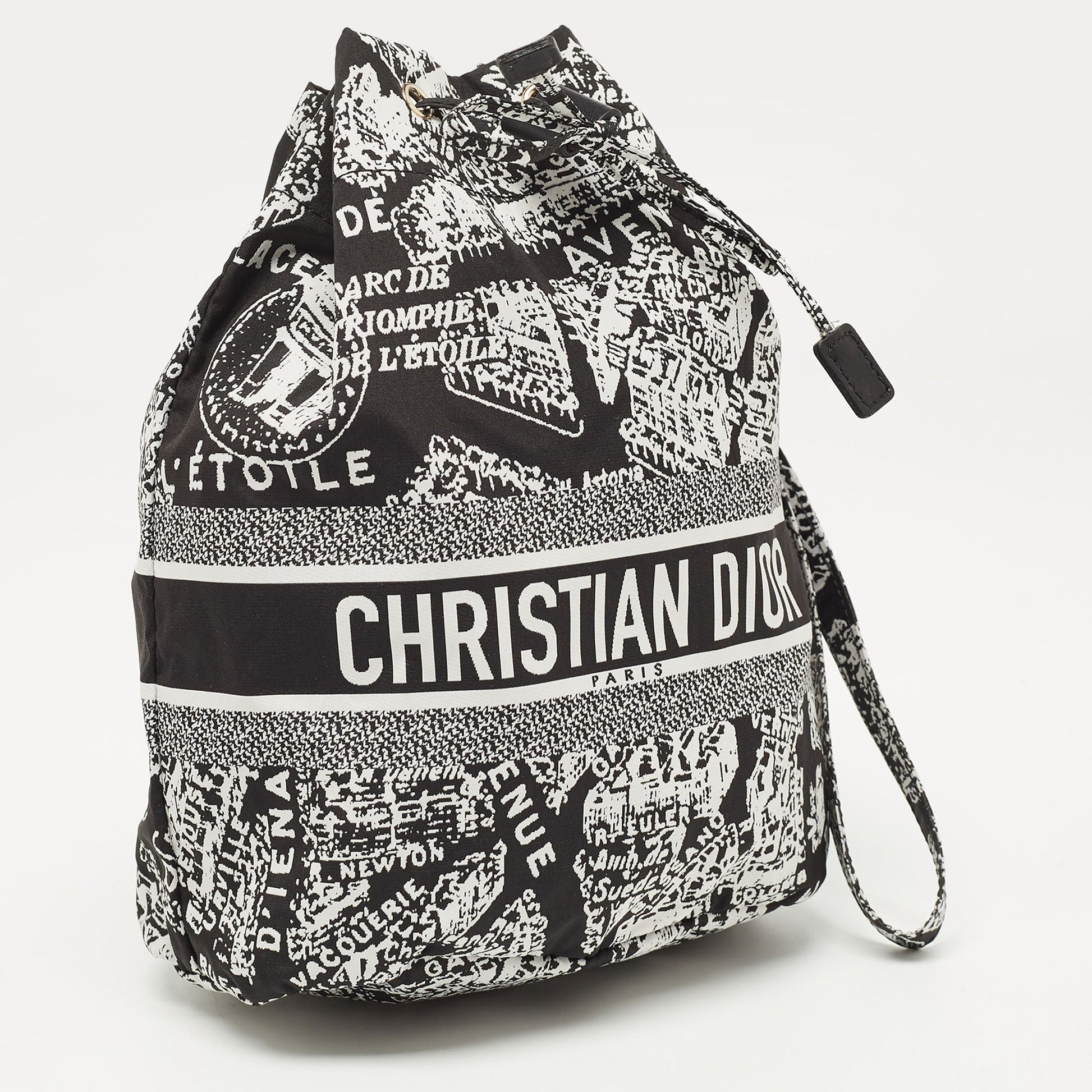 The Dior Diortravel Pouch is a chic and compact accessory featuring the Plan De Paris motif. Crafted from durable nylon, it boasts a black and white color scheme, exemplifying sophisticated Parisian style. Ideal for organizing essentials with a touch of luxury.