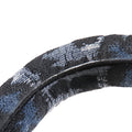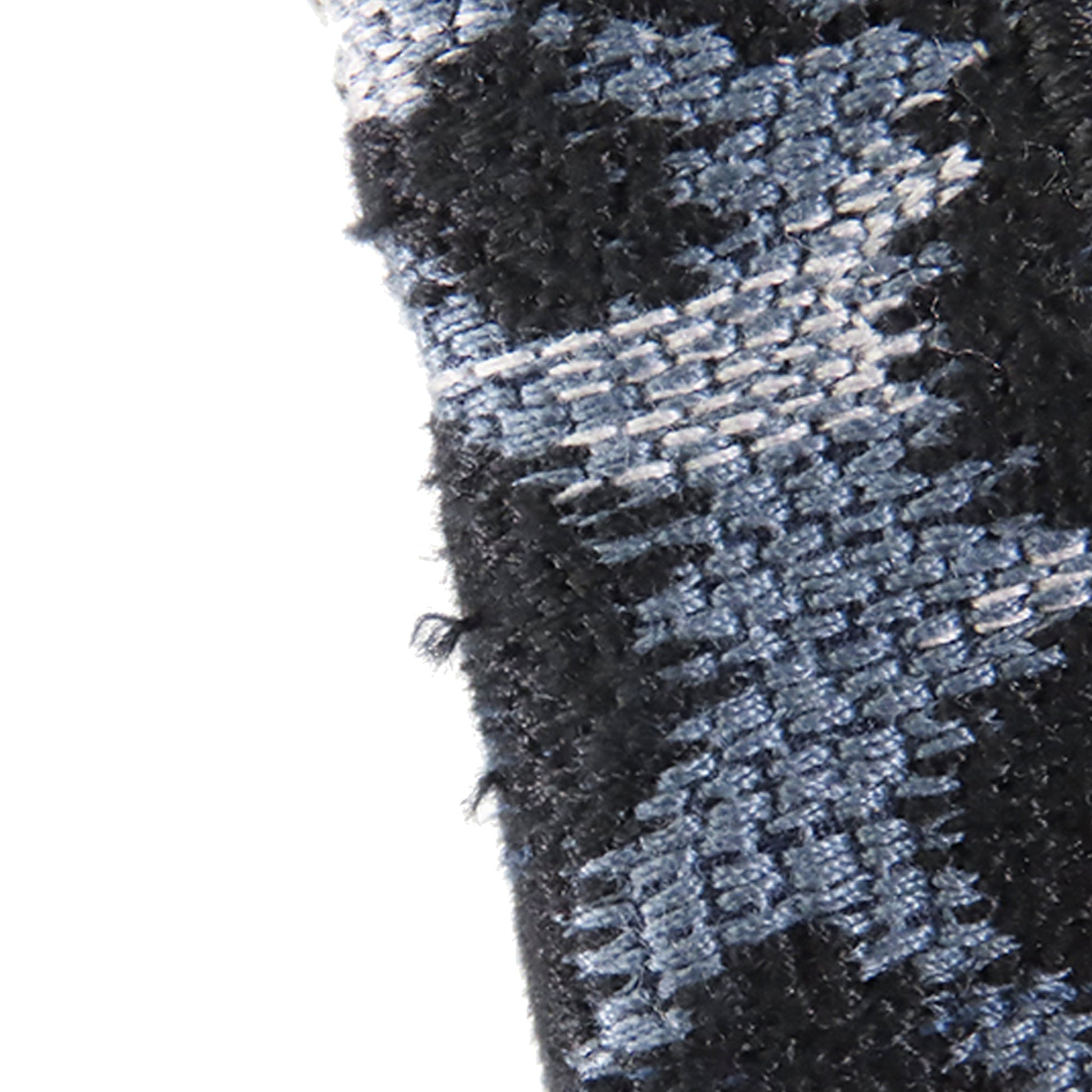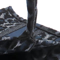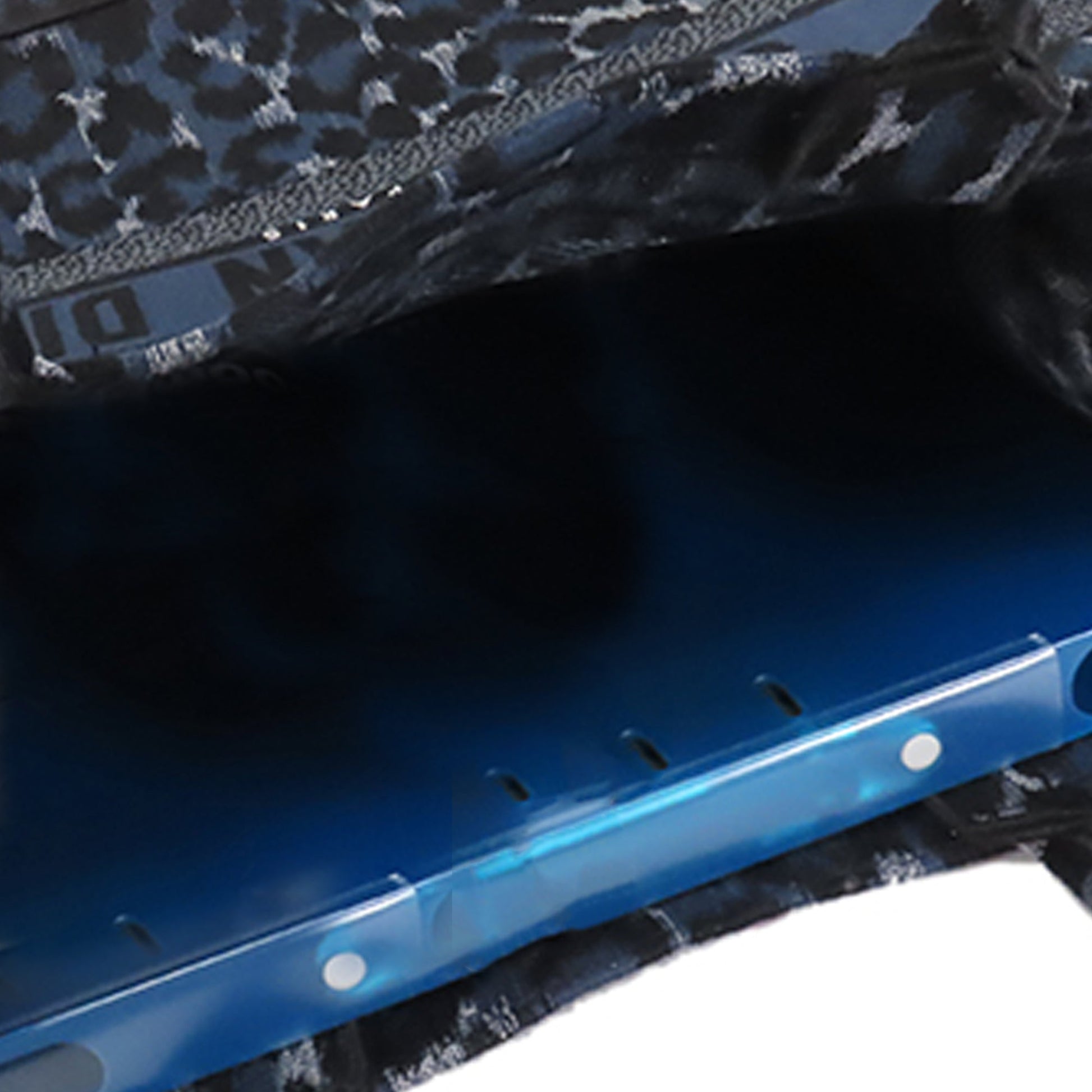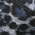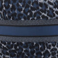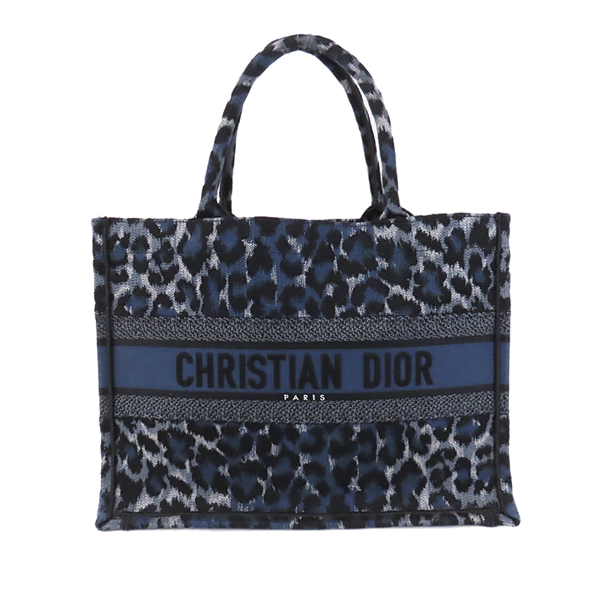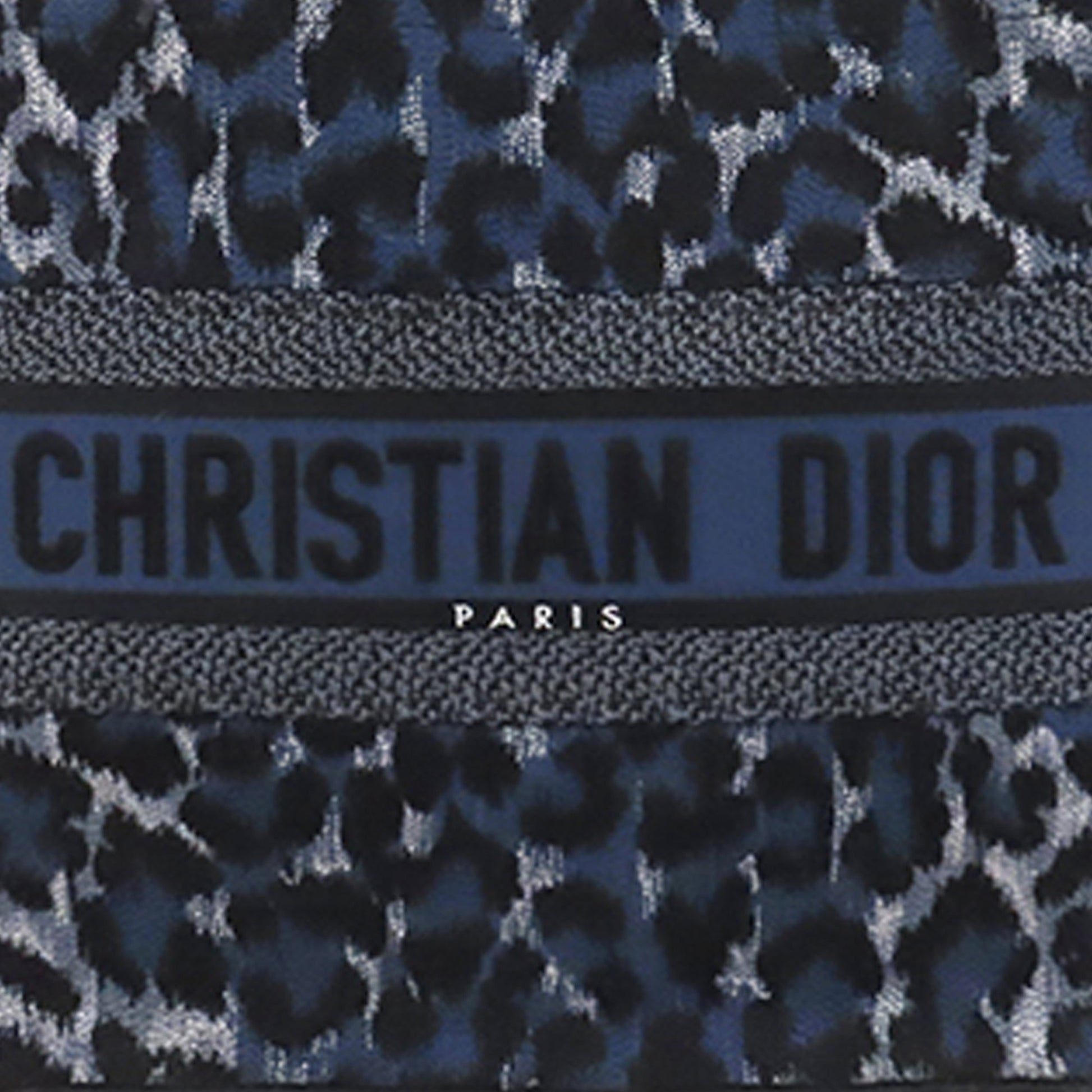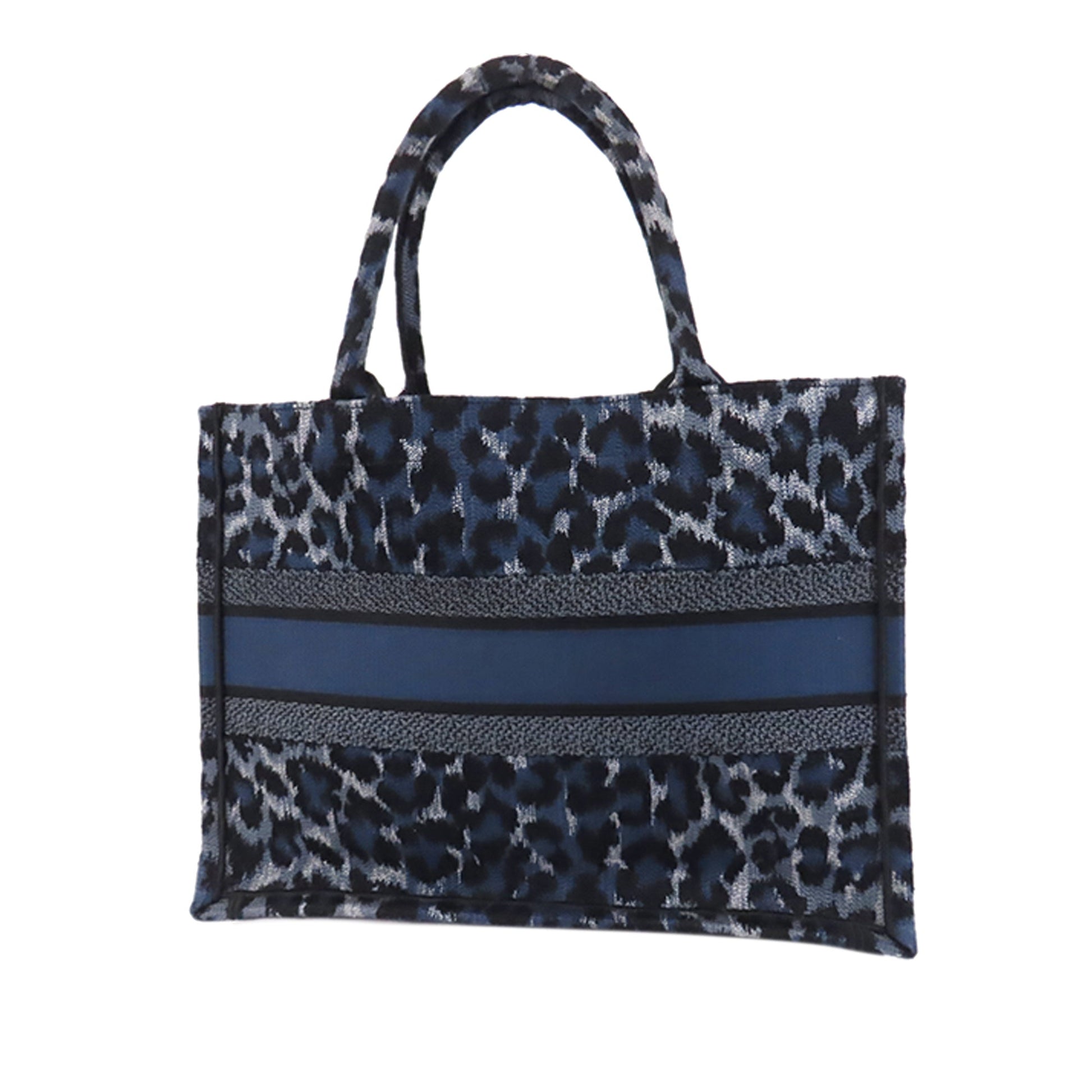 The Book Tote in size Medium is made of blue canvas with leopard print. It is carried by the two handles in the hand or on the arm and has an open top.