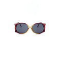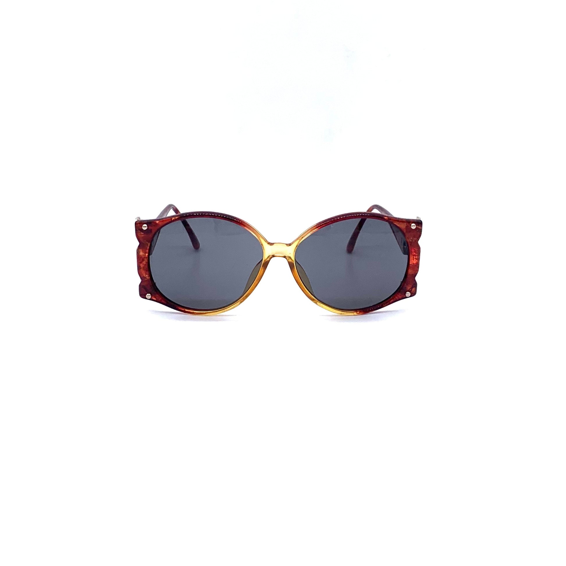 Vintage 1980s Christian Dior sunglasses, featuring grey lenses and a bold temple design that transitions from red to yellow in an eye-catching ombre style.