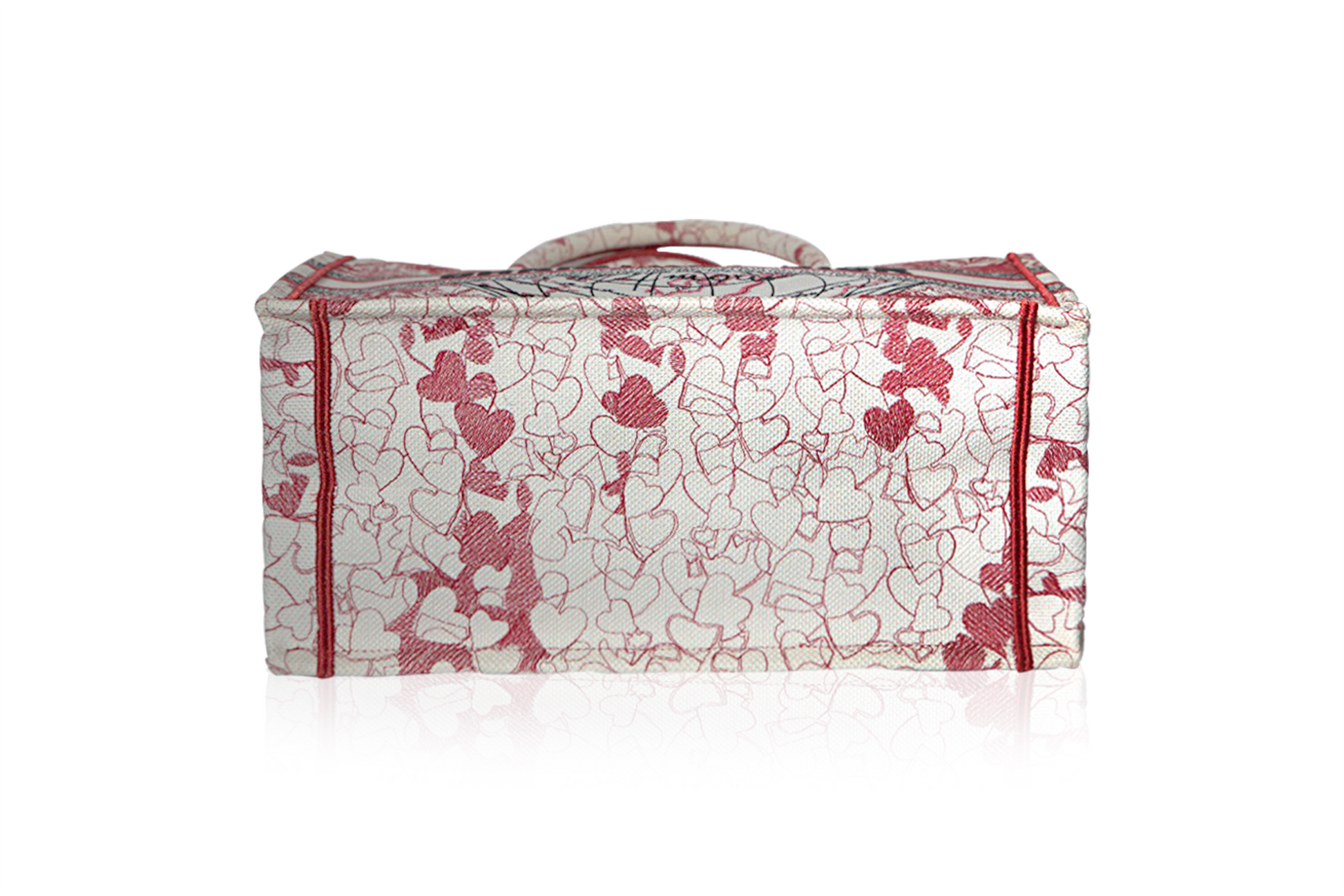 It features a stunning white, red, and black embroidered heart design, with the iconic Dior logo prominently displayed on the front.
