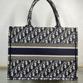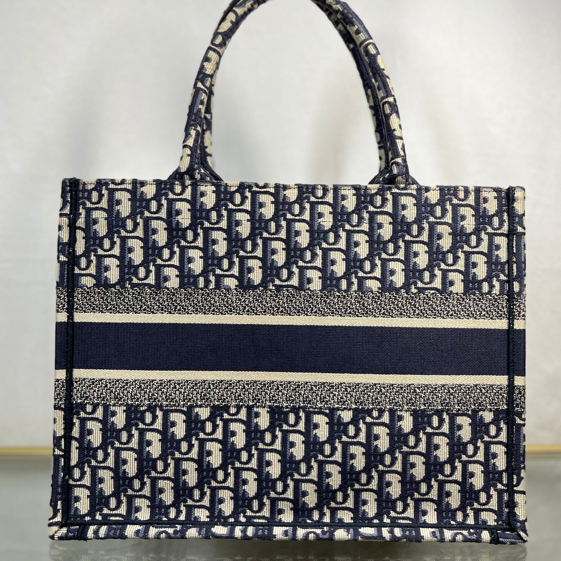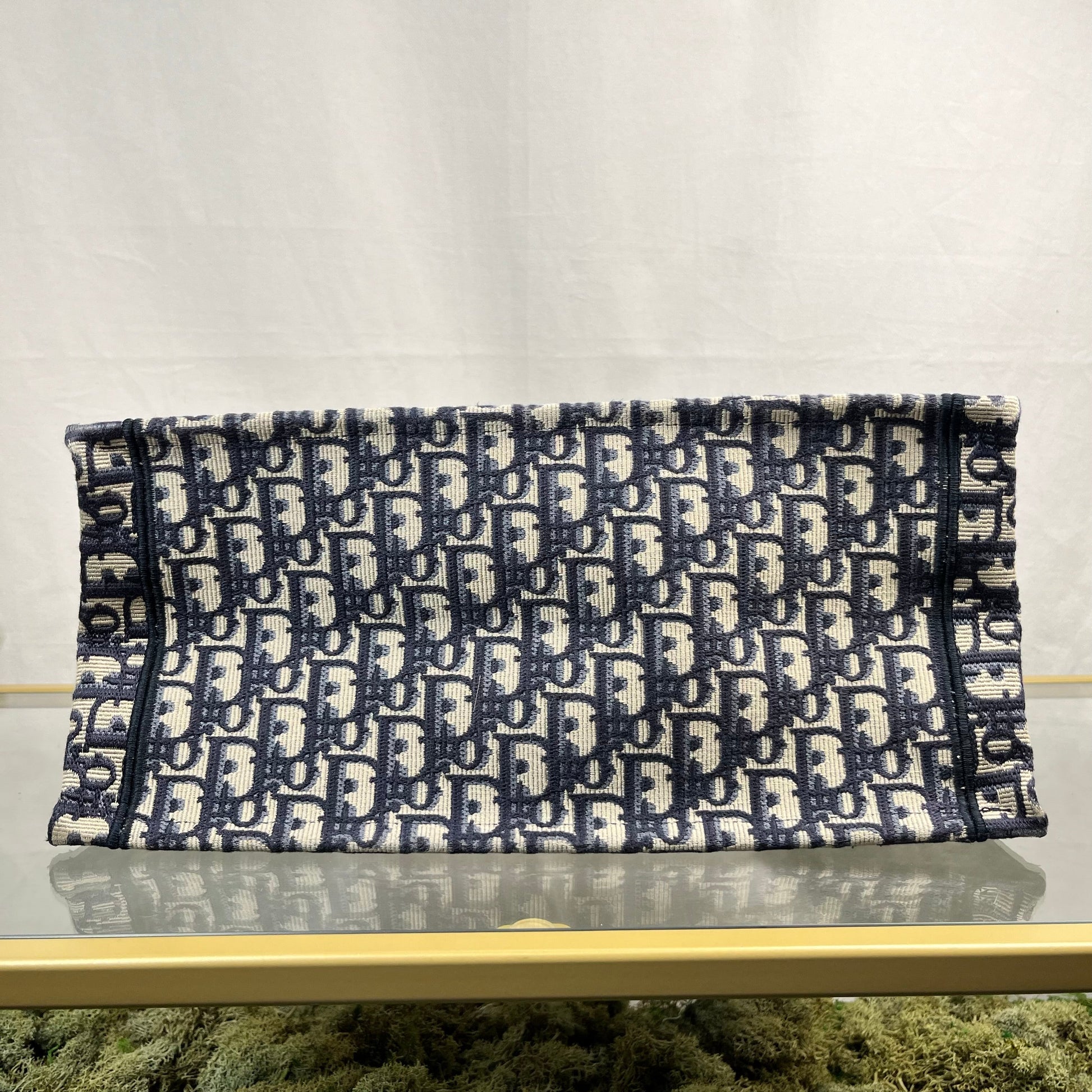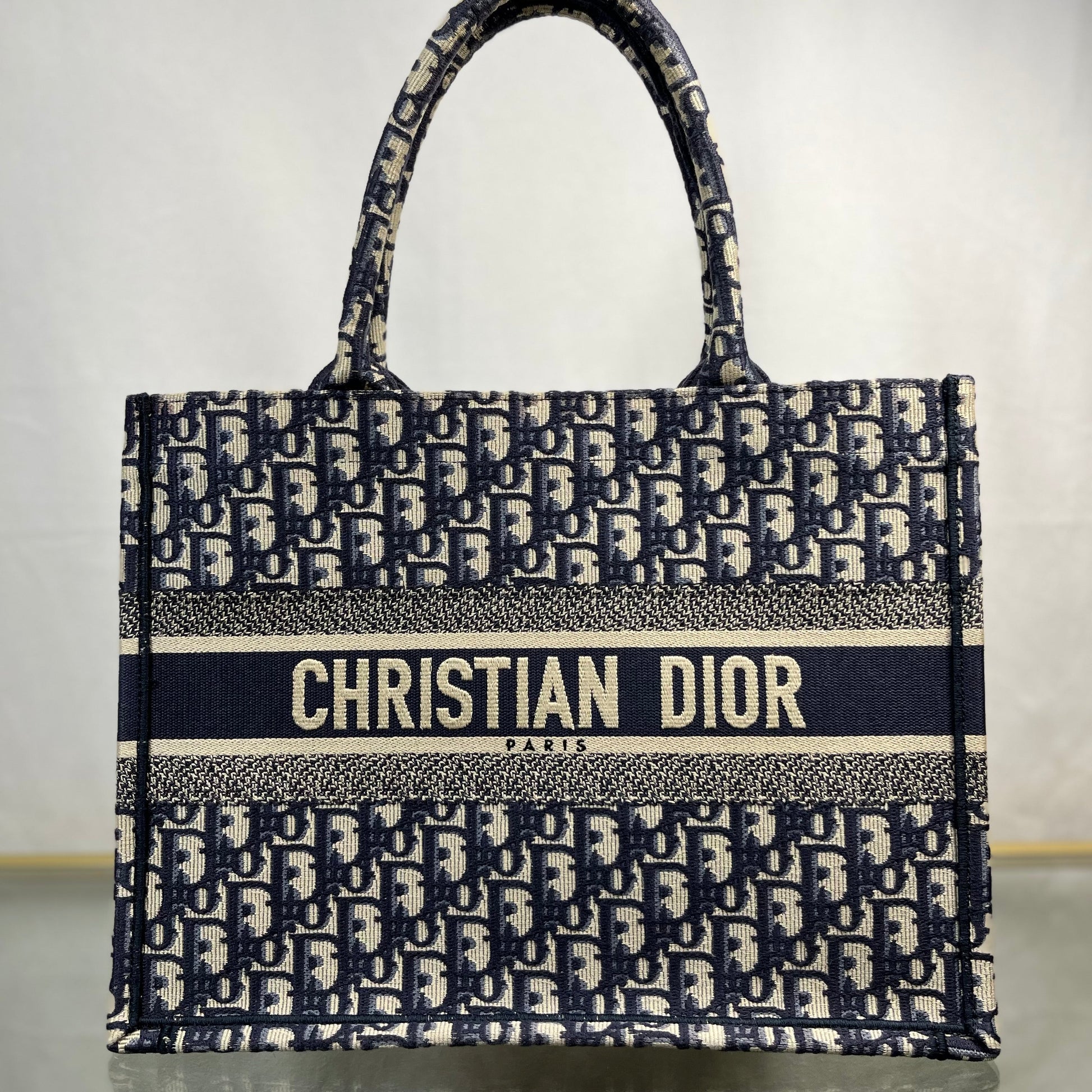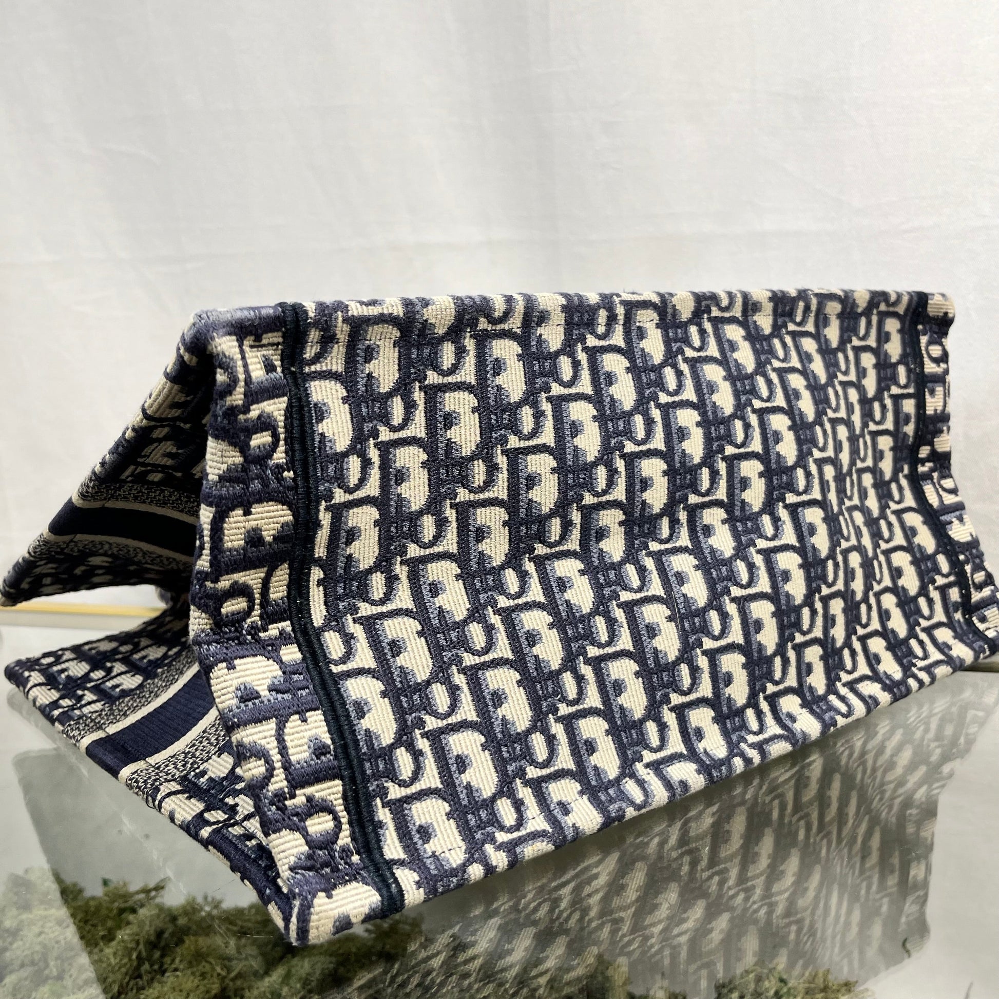 As an expert in the fashion industry, I present to you the Dior Book Medium Blue Oblique Tote. The iconic design features the signature Dior Oblique print, providing a touch of luxury to any outfit. Made with high-quality materials, this tote offers both style and durability. Perfect for any occasion, add this timeless piece to your collection. It's in very good condition. The corners and along the edge of the strap are mildly rubbed; however, the canvas remains structured and beautiful. The interior is clean with a perfume scent overall it's in very good condition. The dust bag has a stain.