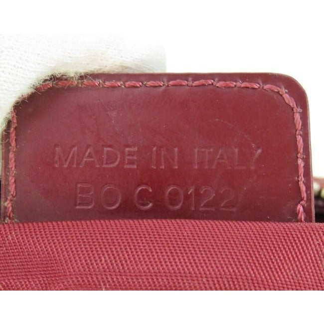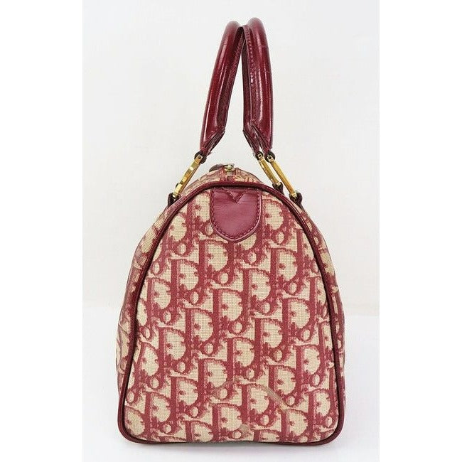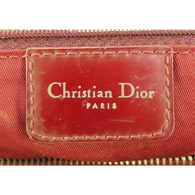 The interior has a very clean dark red fabric lining. It has one large compartment with an interior zip and snap pockets. The purse is made in one of Dior's signature and most desirable patterns with the bold D and Dior gold tone accents. All hardware is signed as Dior and it has its lock. There is a leather tag with 'Christian Dior, Paris' embossed in gold on the front, the serial number #BO C 0122 embossed on the back of the tag, and it was made in Italy!