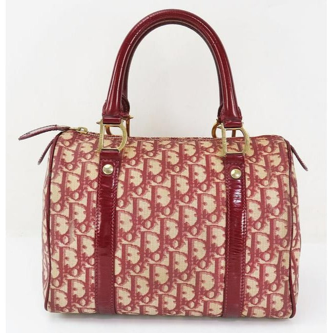 The bag is a medium/ large, classic, doctor's satchel style purse with two handles. It is made of trotter style logo coated canvas & leather in red. The purse has red, rolled leather handles, attached by a bold gold 'D' logo and a 'Dior' gold padlock attached to the zipper!