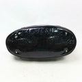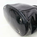 The bag is a large to extra large, satchel style purse or tote bag with a slightly tapered shape. It is made of trotter logo embroidered glossy black enamel or patent leather. The purse has two black leather handles, attached by chrome rings that are attached by black leather strips! It has a zip top closure and a footed bottom!