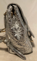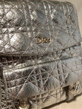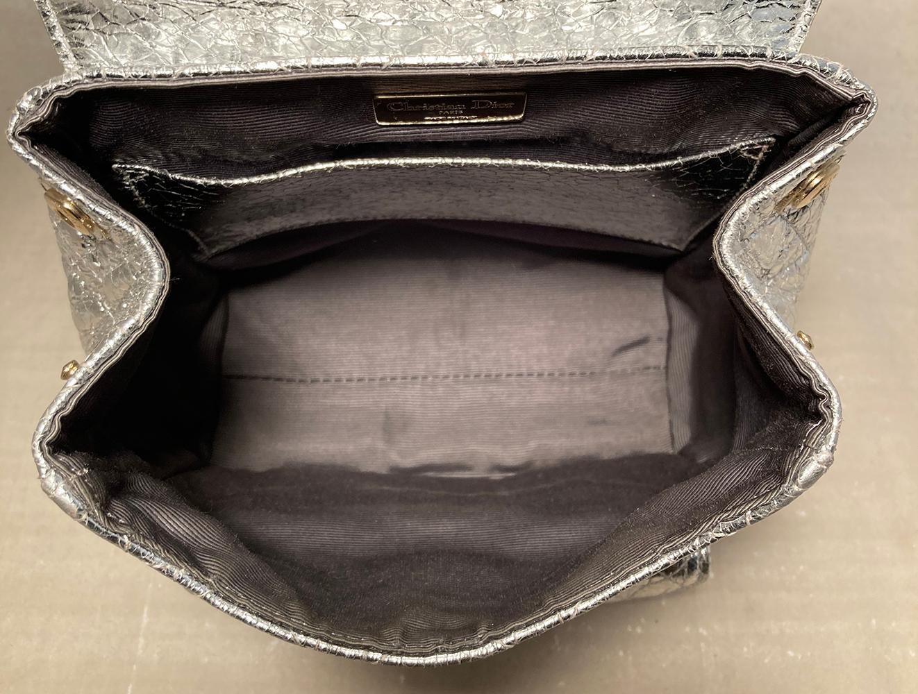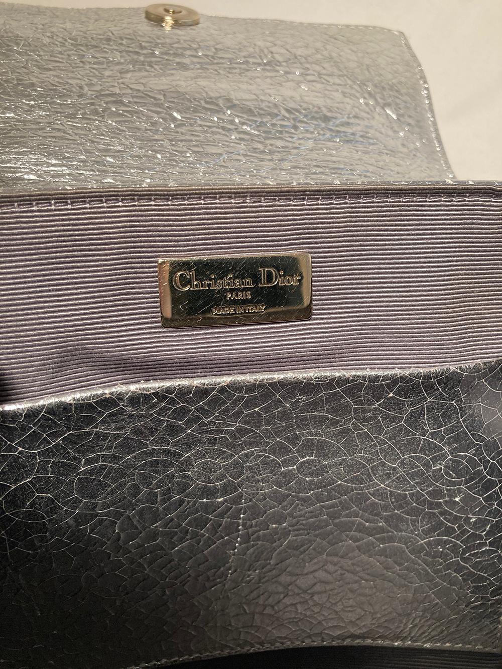 Silver crackled patent leather exterior quilted in classic dior cannage style and trimmed with silver hardware.