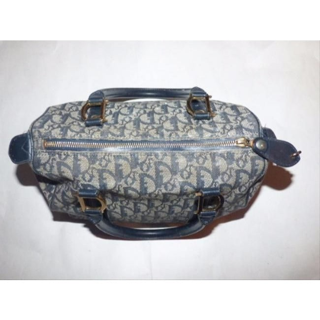 The bag is a medium/ large, classic, doctor's satchel style purse with two handles. It is made of trotter style logo embroidered canvas & leather in blues. The purse has two navy leather handles, attached by a bold gold 'D' logo and a 'Dior' gold padlock attached to the zipper!