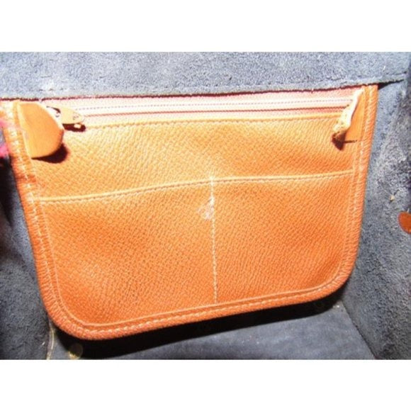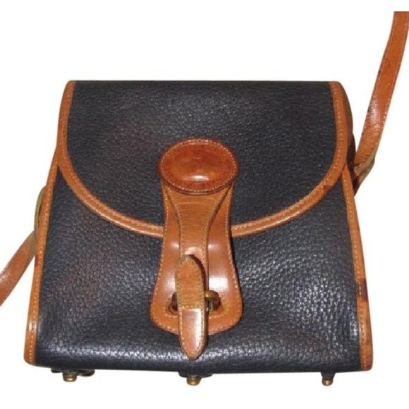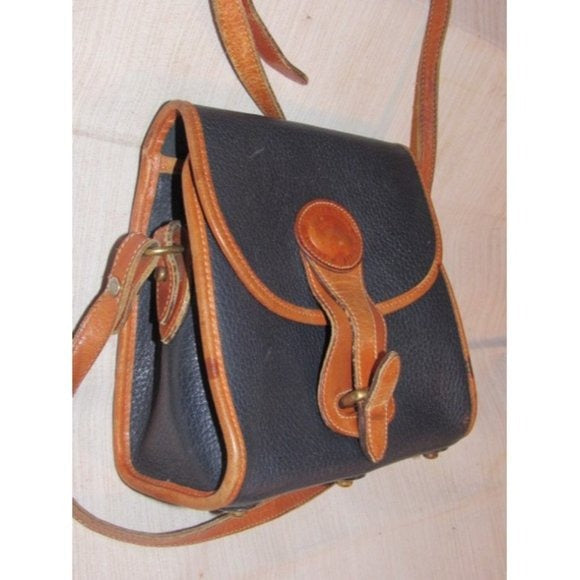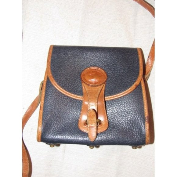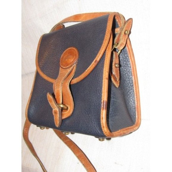For sale is an authentic, vintage, Dooney and Bourke AWL, textured navy leather and smooth camel leather, envelope top, cross body or shoulder bag with a removable adjustable strap, exterior pockets, a footed bottom, brass accents and a fitted brass and leather closure!