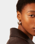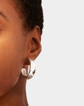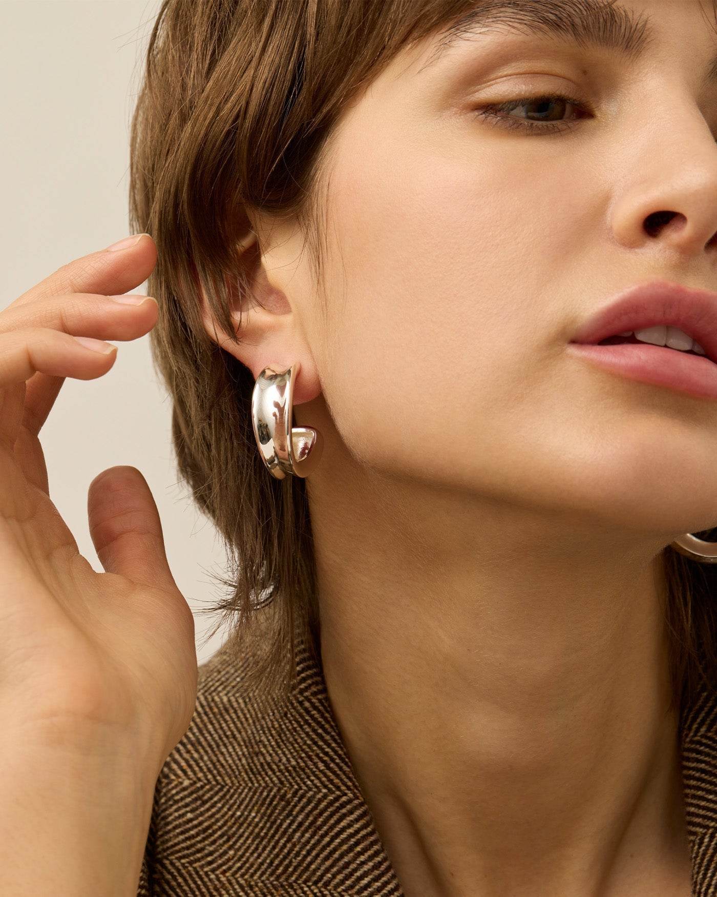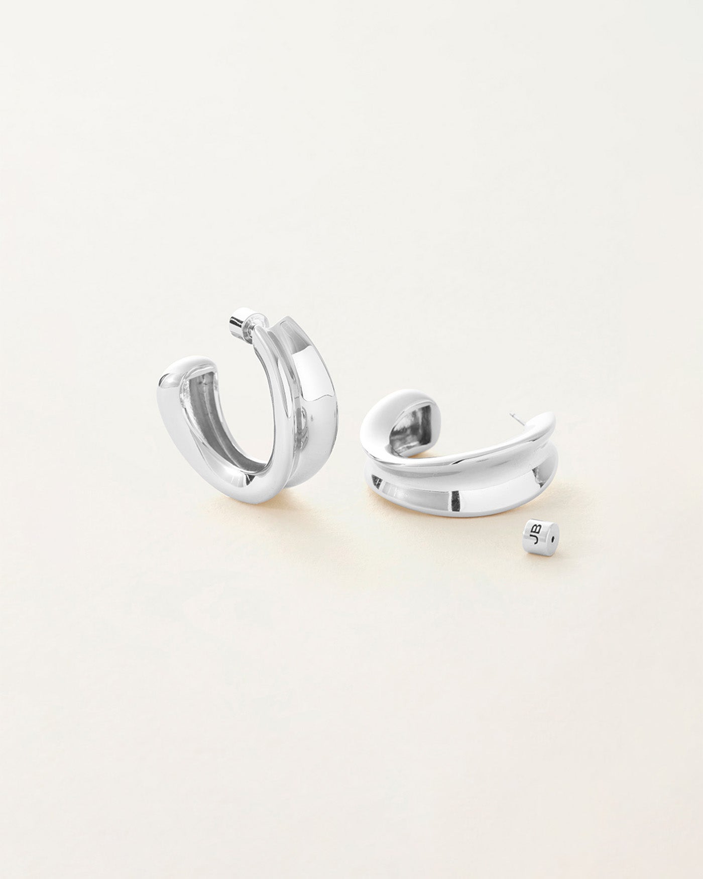A large pair of high-shine hoops featuring sculptural curves and a rounded tail, as seen on Selena Gomez and Dakota Johnson. Despite their bold body, they are lightweight, thanks to a hollowed out design. Finished in high-polish silver. For a chunkier version of these, see the Chunky Doune Hoops.