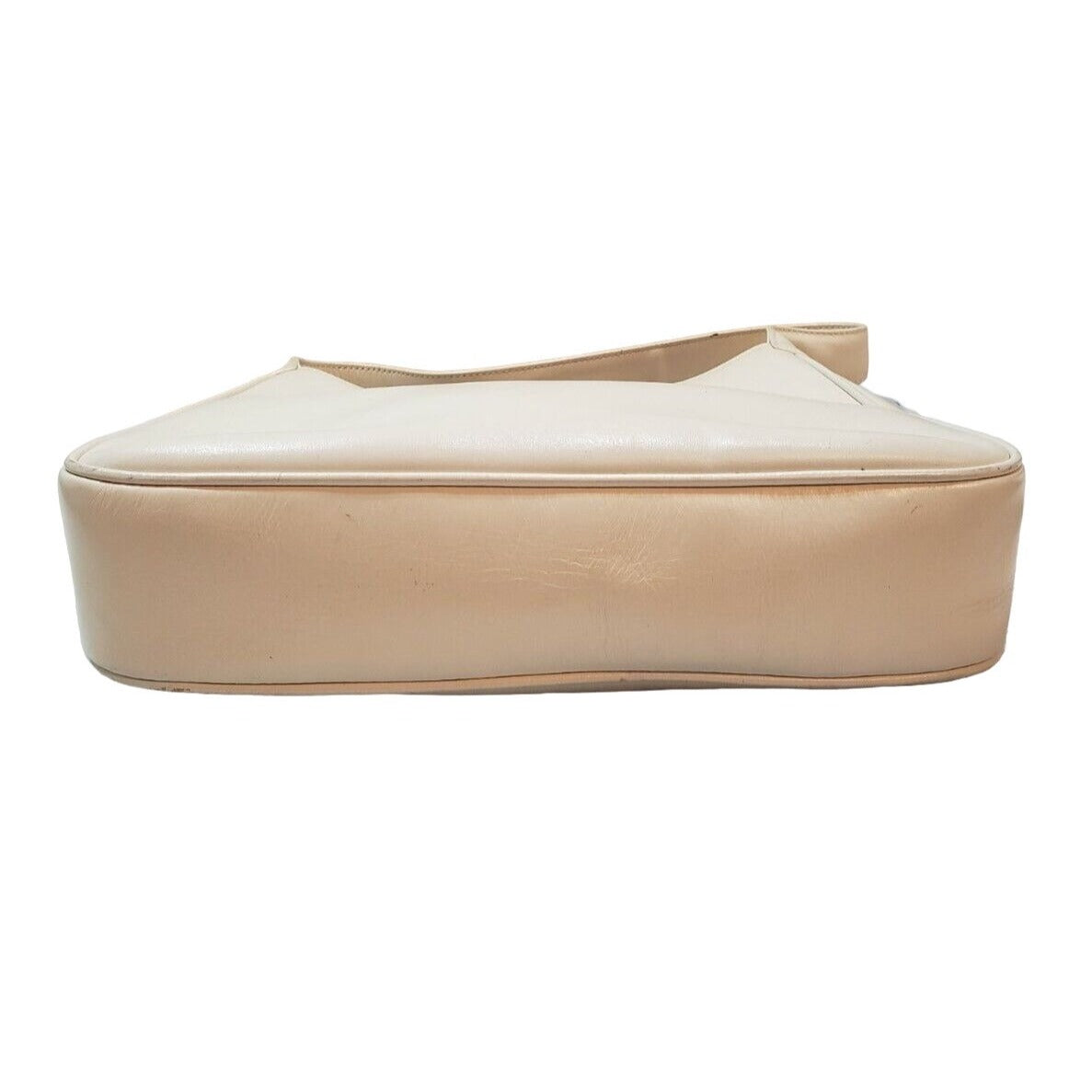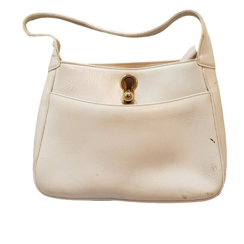 The bag is an amazing, large, early, Padlock style hobo with a gorgeous, bold, gold clasp! It is the perfect original purse by G. Gucci in an all leather version that anyone would want! The purse is made of supple white & ivory leather in a large size hobo and has a gold, cut-out key-hole shaped closure. The strap is a wider style and not adjustable and there is an exterior front pocket. This is an exquisite early Gucci Padlock shoulder bag that is in beautiful condition.