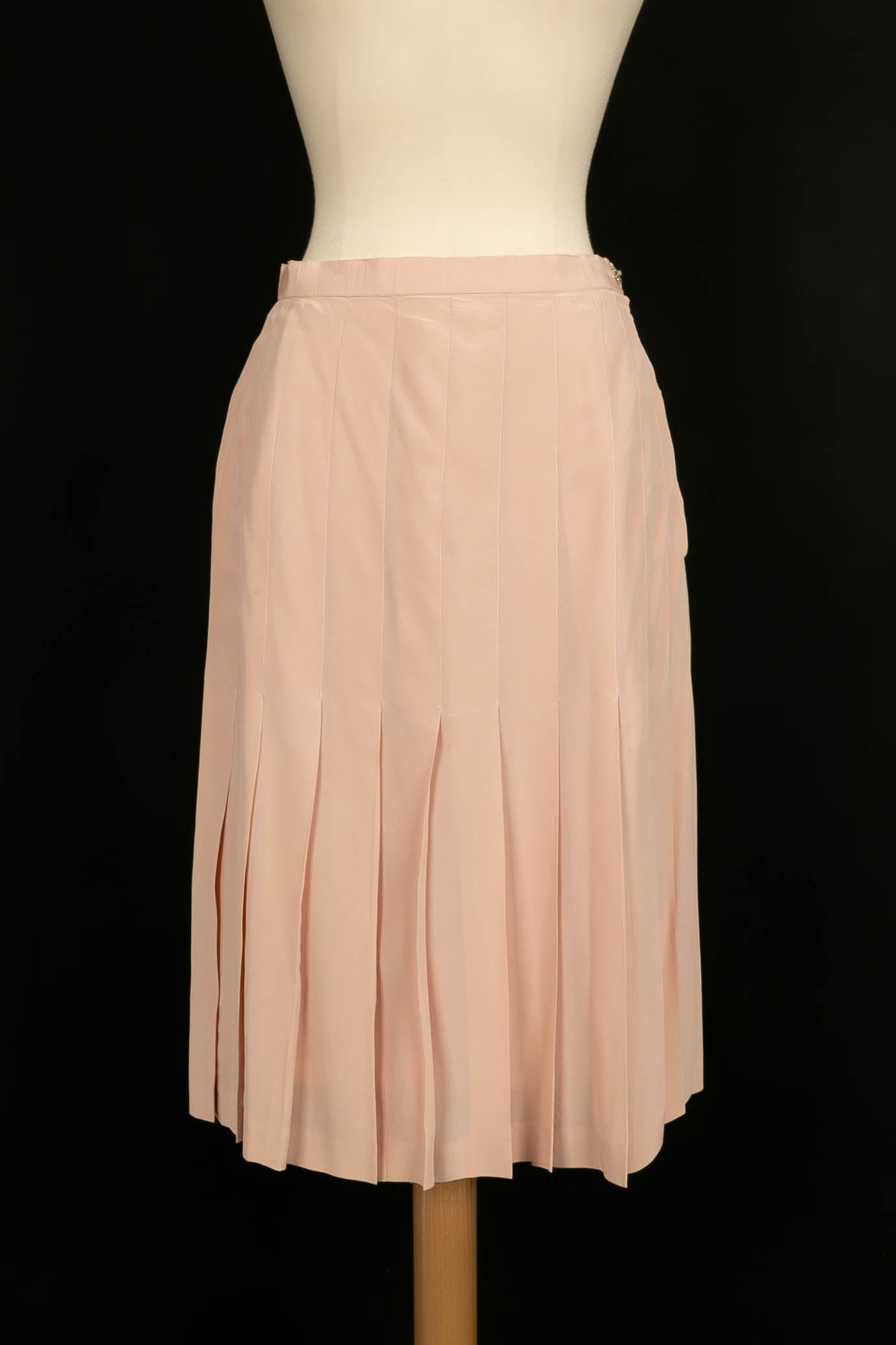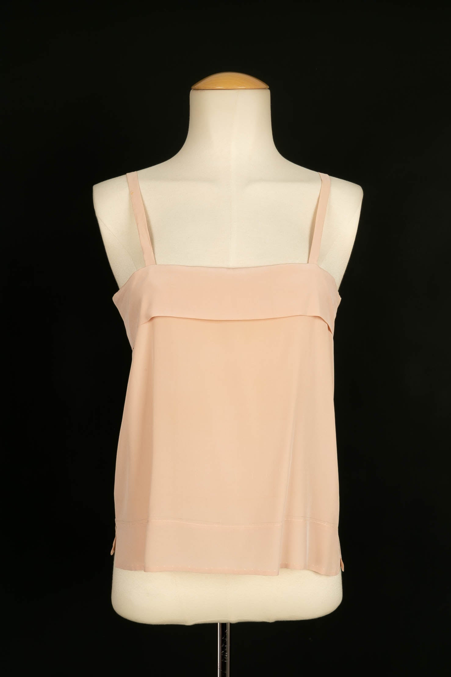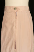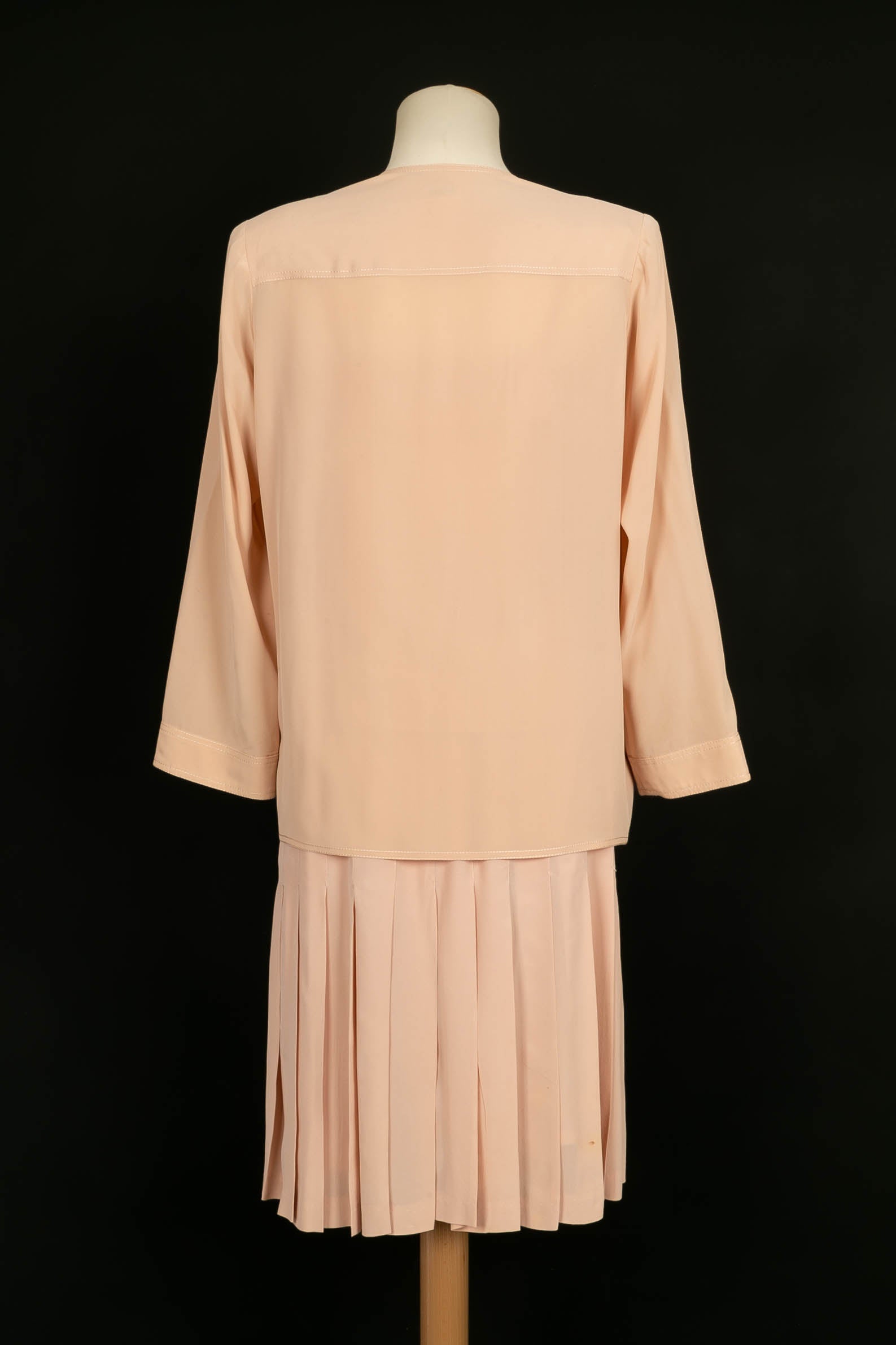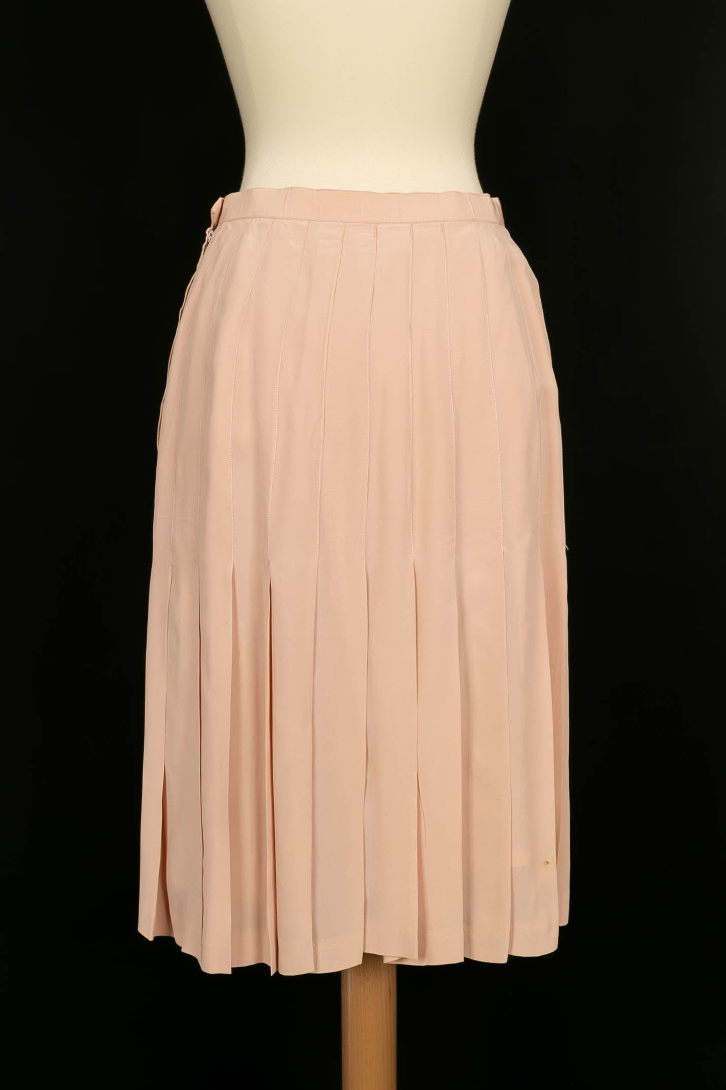 CHANEL -Ensemble compos� d'un top, d'une jupe et d'un gilet en soie rose p�le. Pas d'�tiquette de composition ou de taille indiqu�e, il correspond � un 34FR. A signaler, pr�sence d'un trou dans la soie.