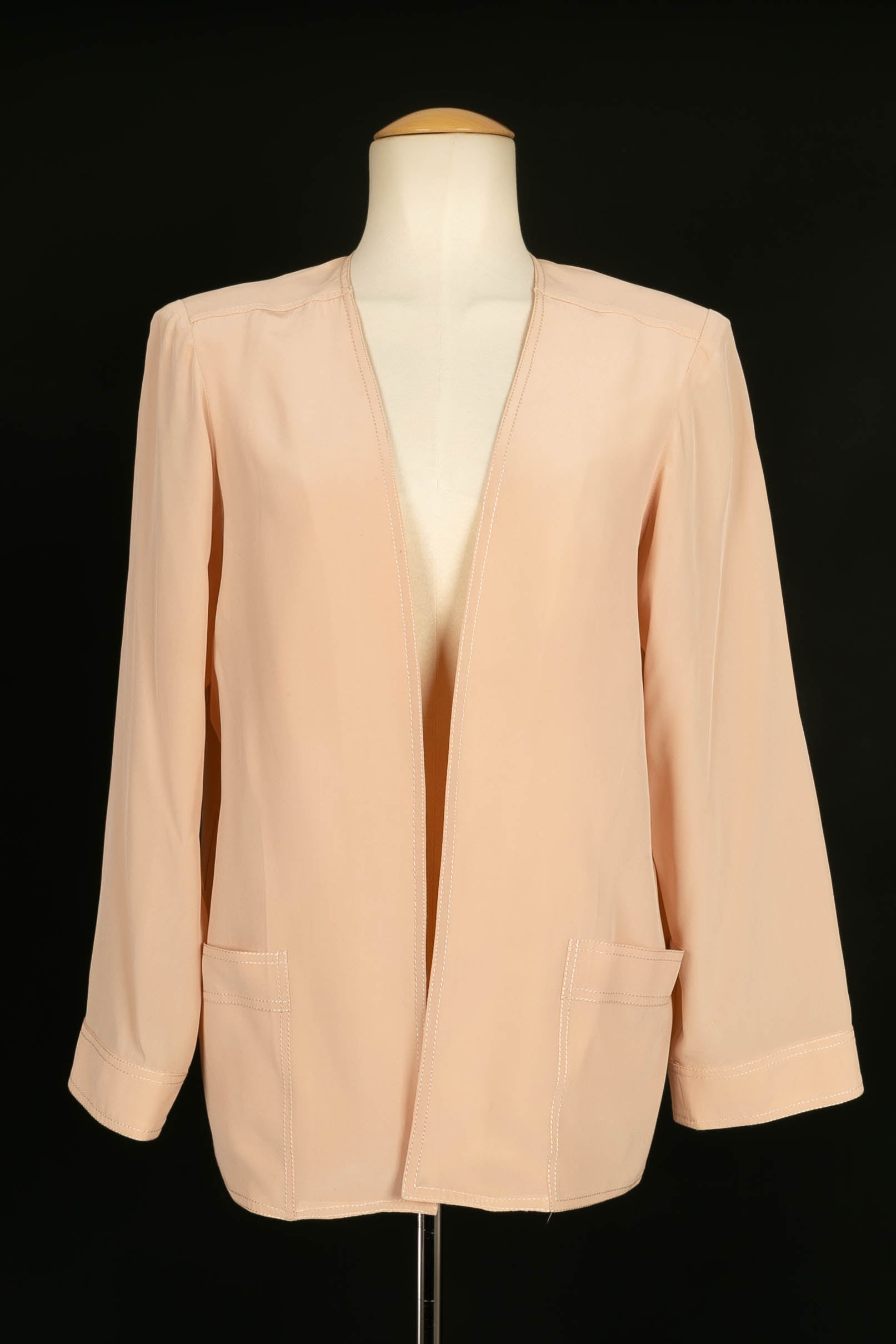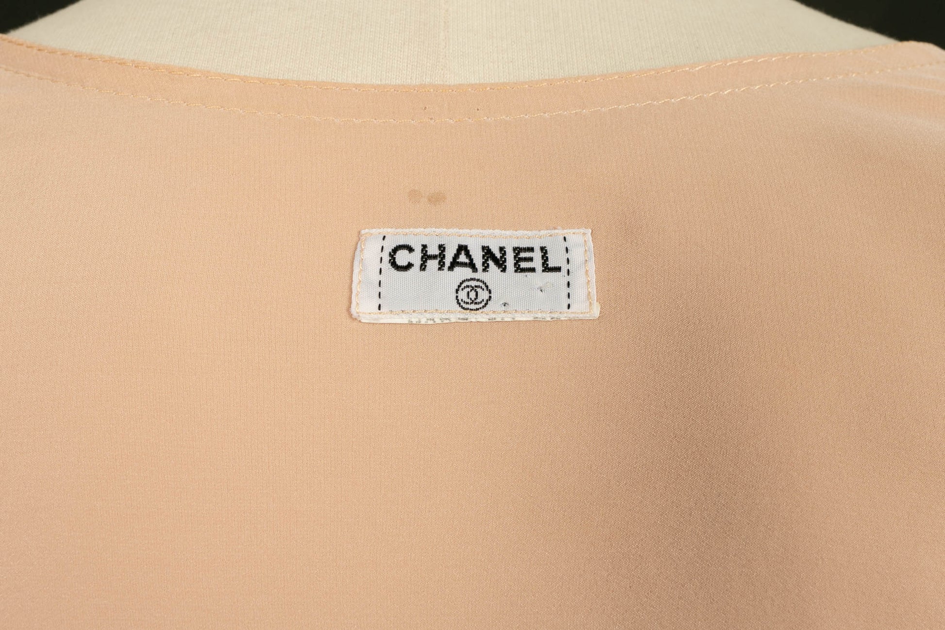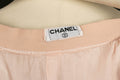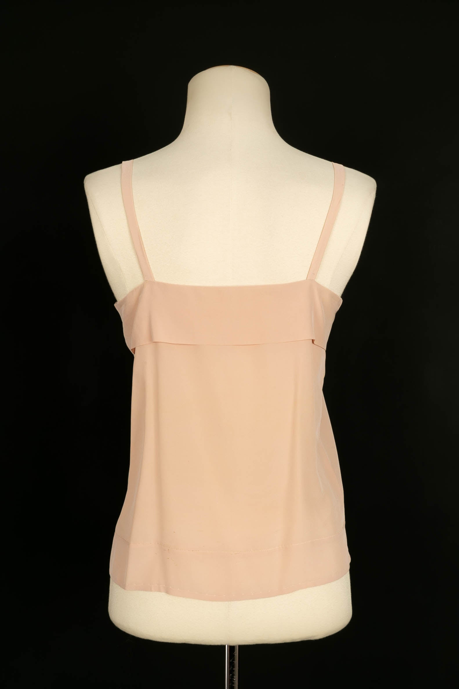 CHANEL -Ensemble compos� d'un top, d'une jupe et d'un gilet en soie rose p�le. Pas d'�tiquette de composition ou de taille indiqu�e, il correspond � un 34FR. A signaler, pr�sence d'un trou dans la soie.