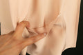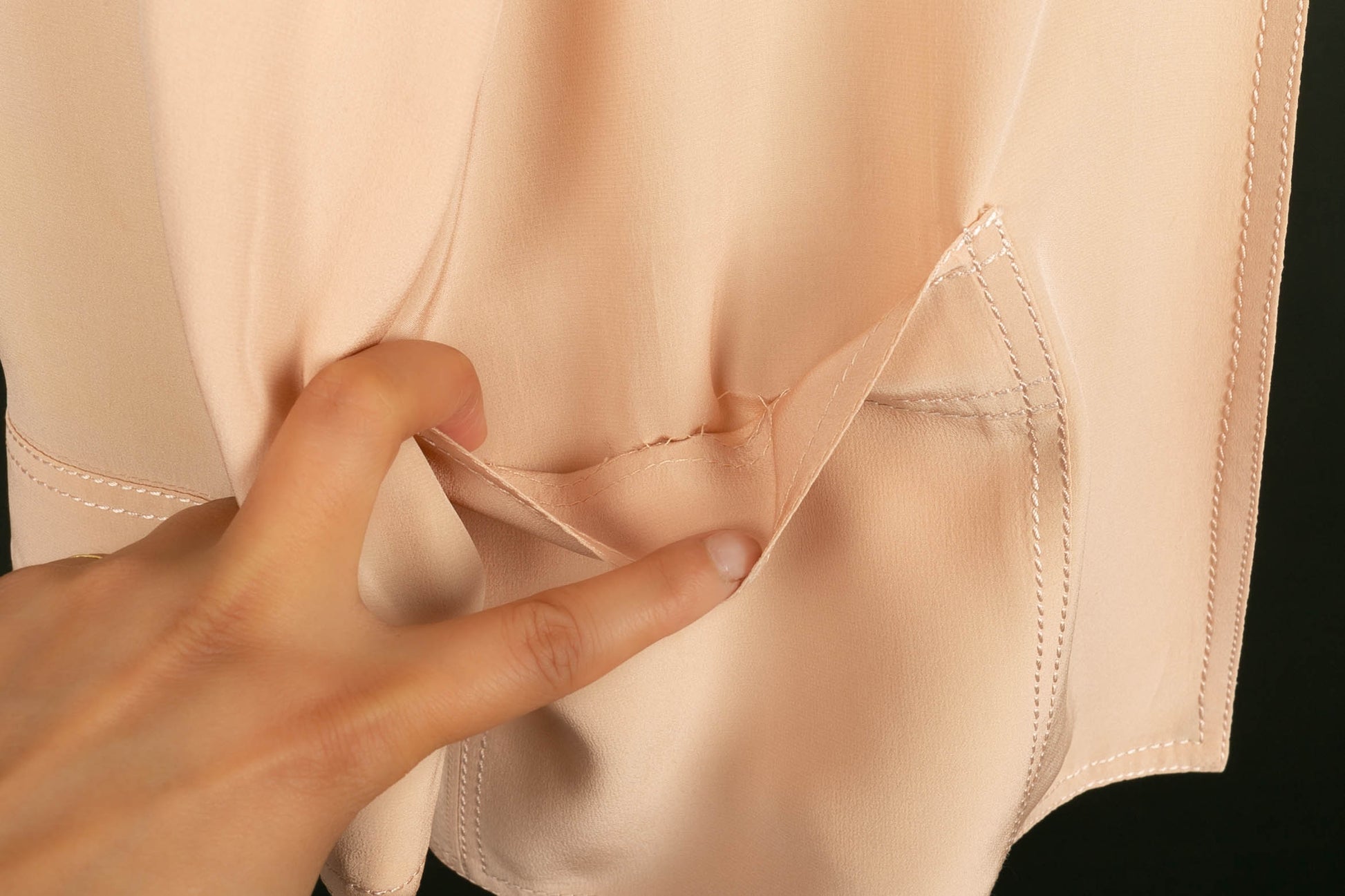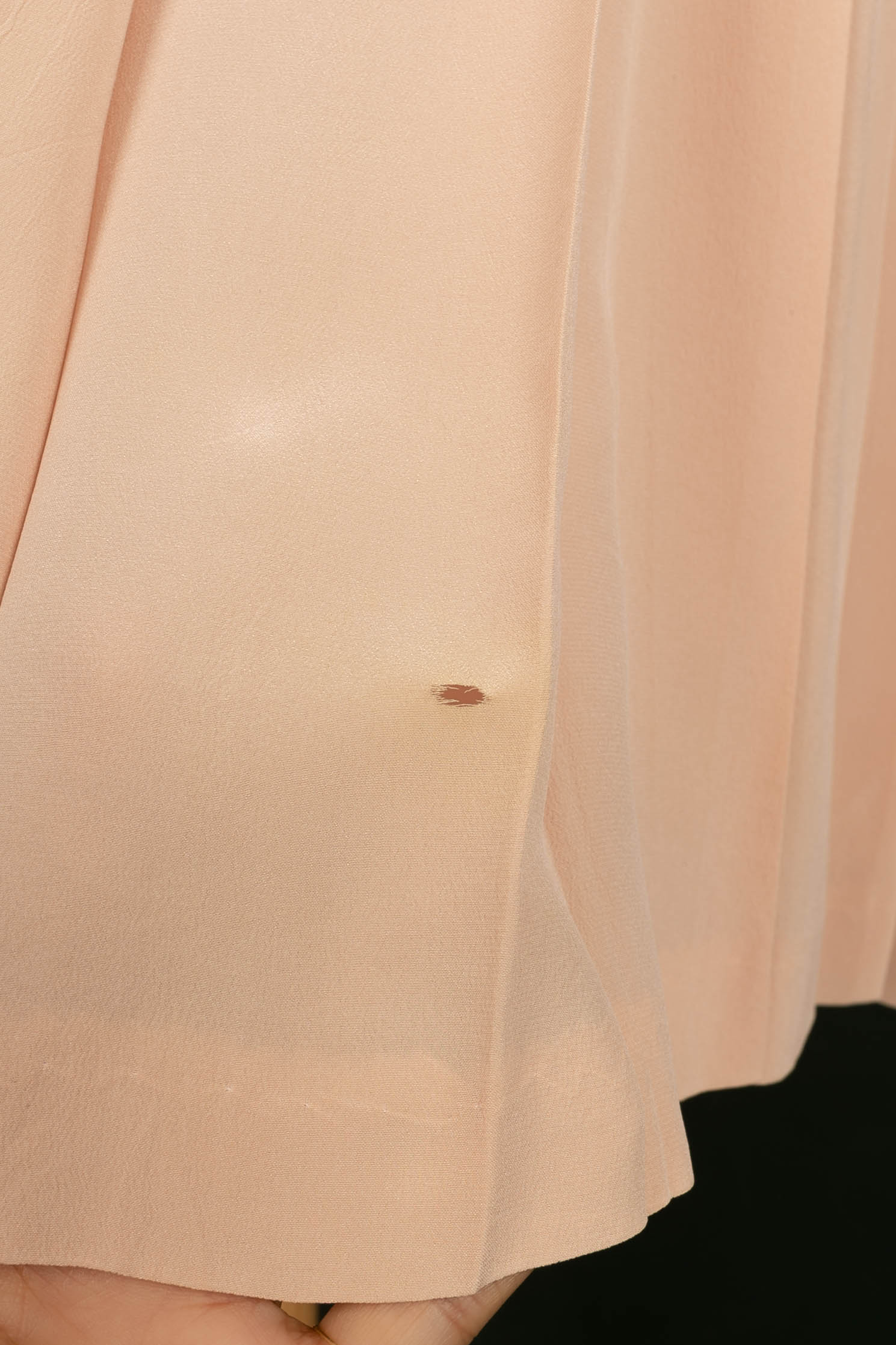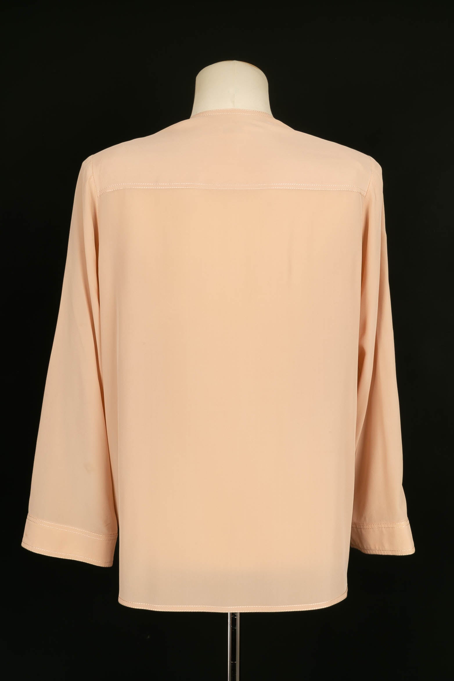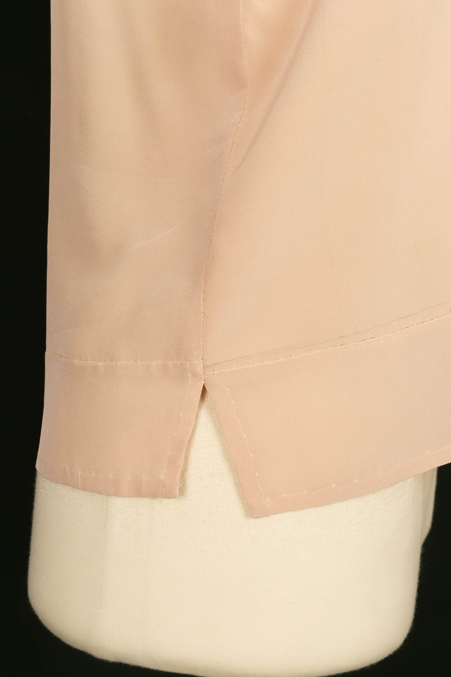 CHANEL -Ensemble compos� d'un top, d'une jupe et d'un gilet en soie rose p�le. Pas d'�tiquette de composition ou de taille indiqu�e, il correspond � un 34FR. A signaler, pr�sence d'un trou dans la soie.
