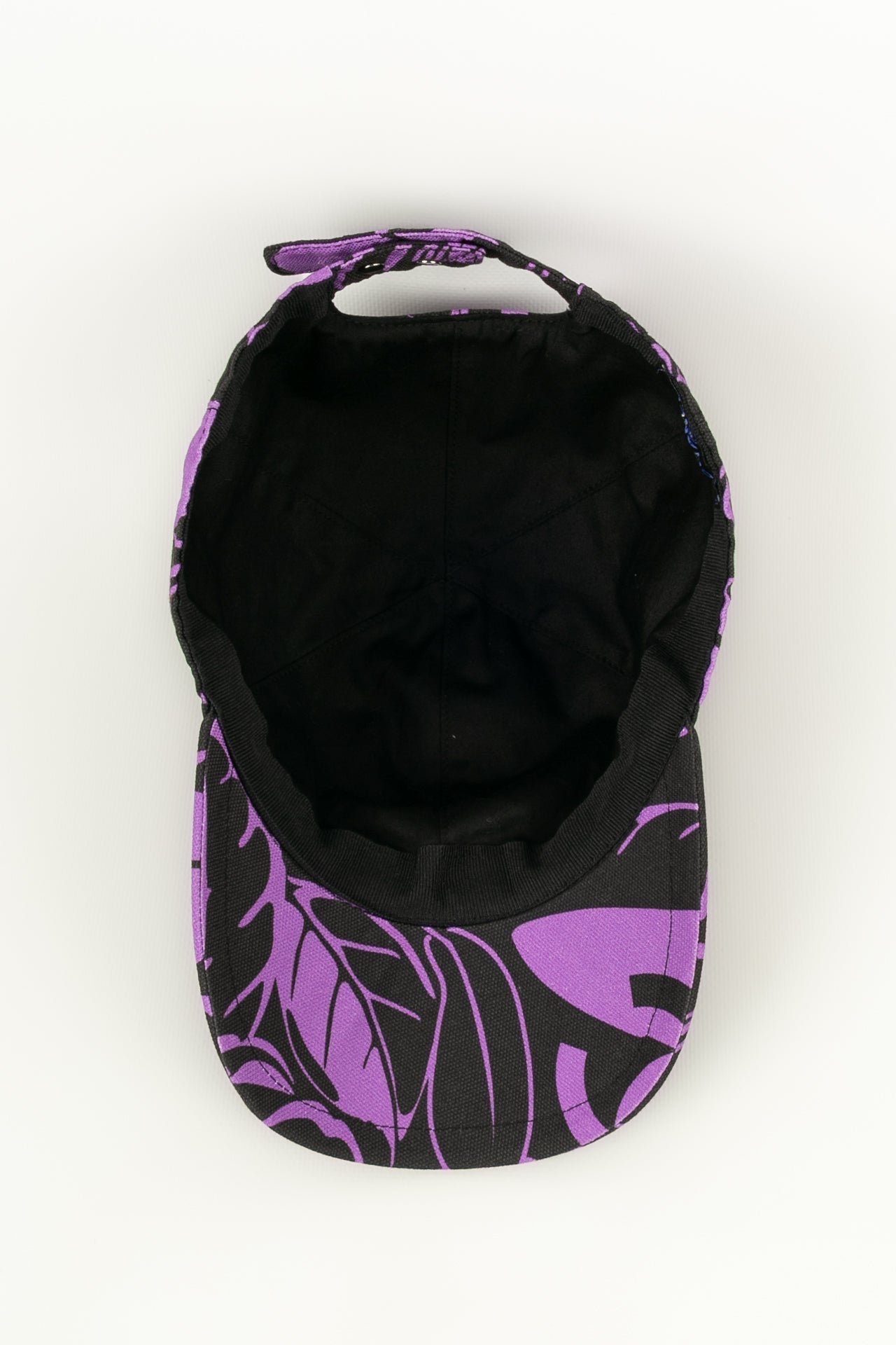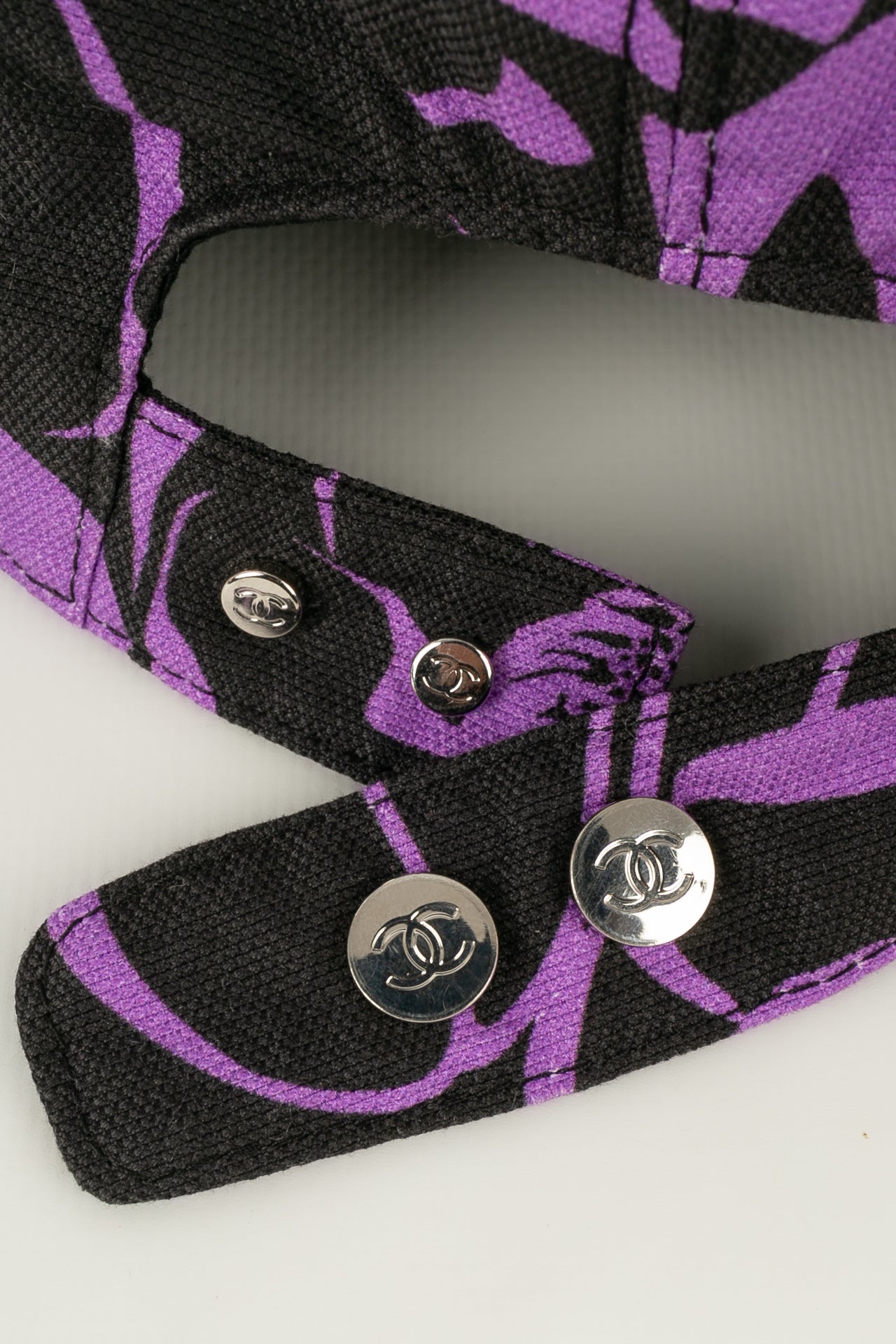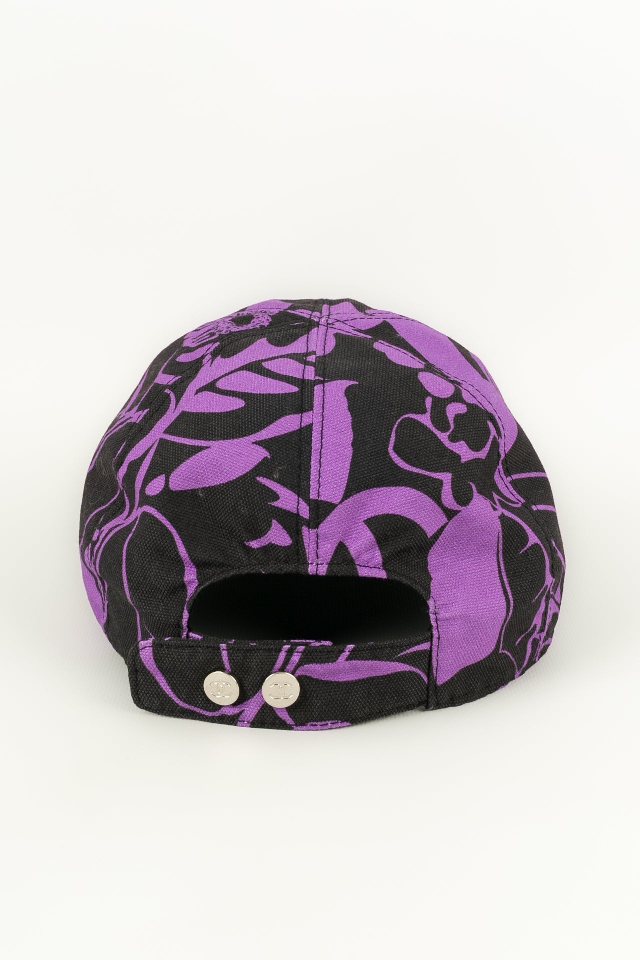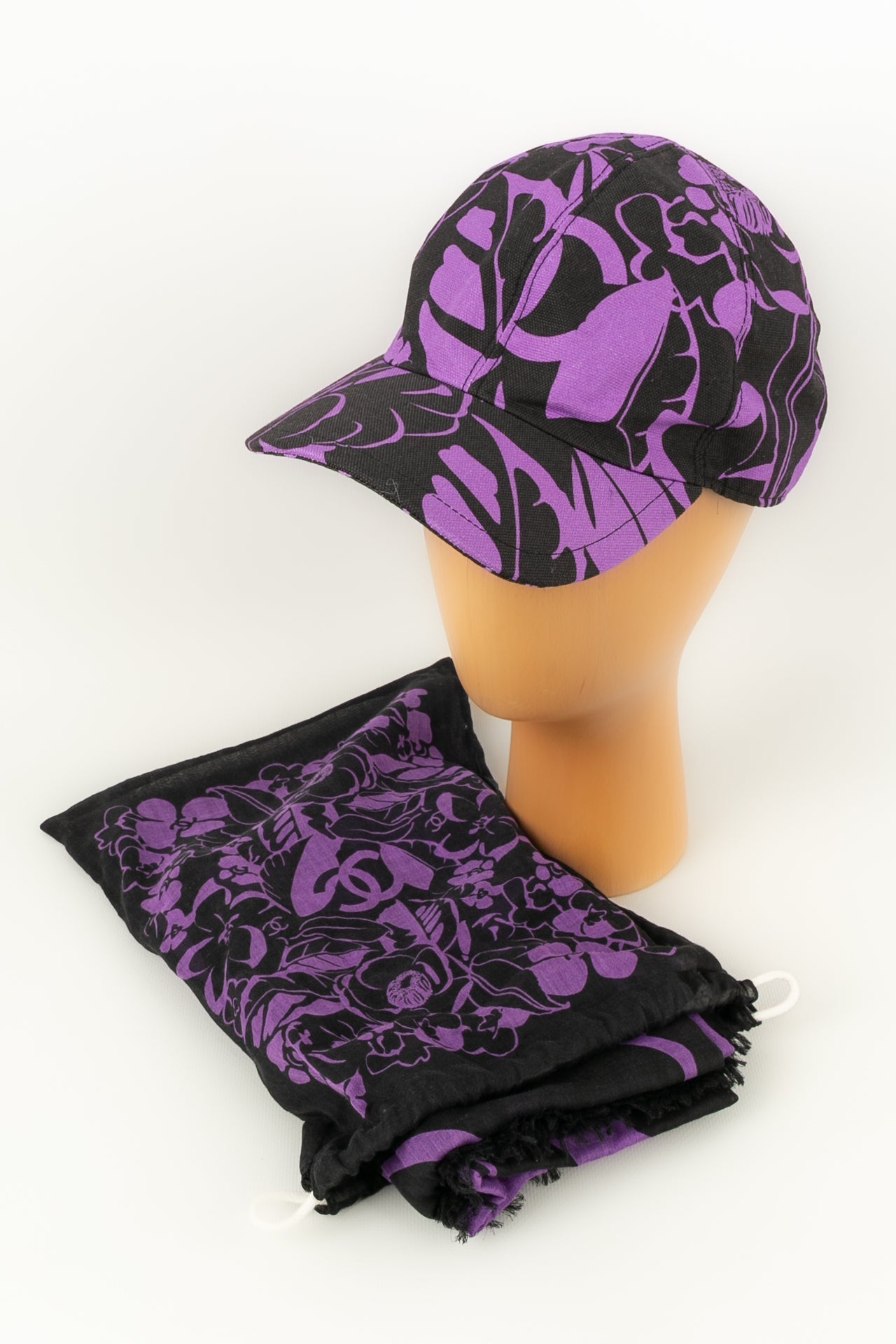 CHANEL -(Made in Italy) Ensemble compos� d'une casquette r�glable et d'un par�o en coton dans les tons de noir et violet. Le par�o dispose d'un petit sac de rangement.