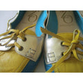 Stylish twist! - on classic loafer moccasin - has teal, yellow and silver leather upper panels with yellow lace and 2 inch toe bow. 5/8 inch rubber soles. Signature padded insoles. All measurements are approximate.