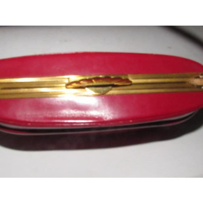 This purse is the epitome of mid century mod style! It is made of smooth leather in a true red color as the body and has an engraved, gold frame with a hinged top opening. It has a matching red leather shoulder strap. This hard, boxy style purse is called a 'lunchbox'. At the top, it has a gold engraved, elaborate, locking closure.