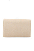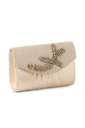 This beige clutch is made with the satin, having flap over design that is aDIORned with a big shiny motif at front.