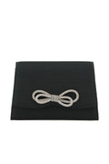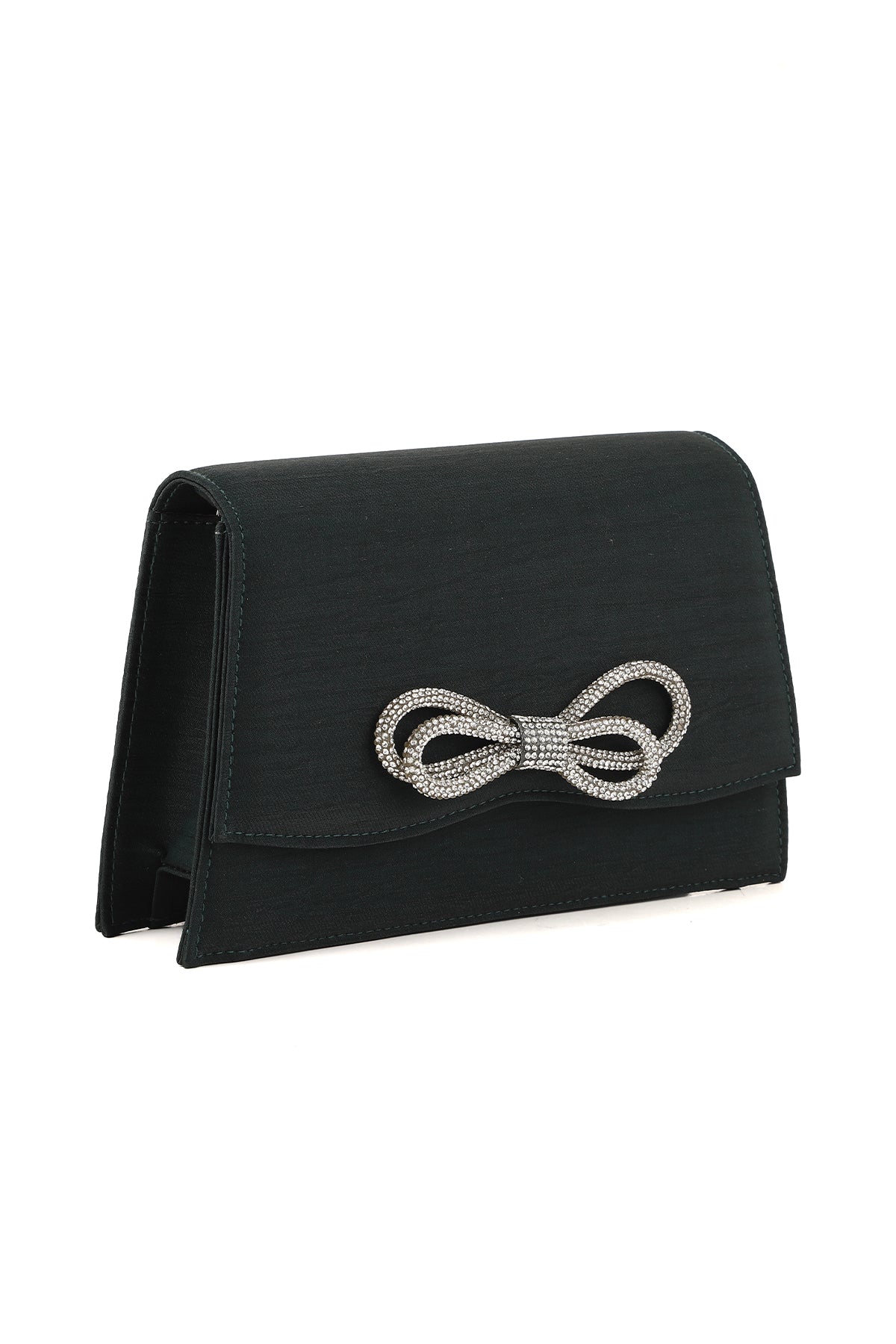 This green clutch is made with the lustrous satin, having embellishment of a sparkling bow at front and that is made with flap over style.
