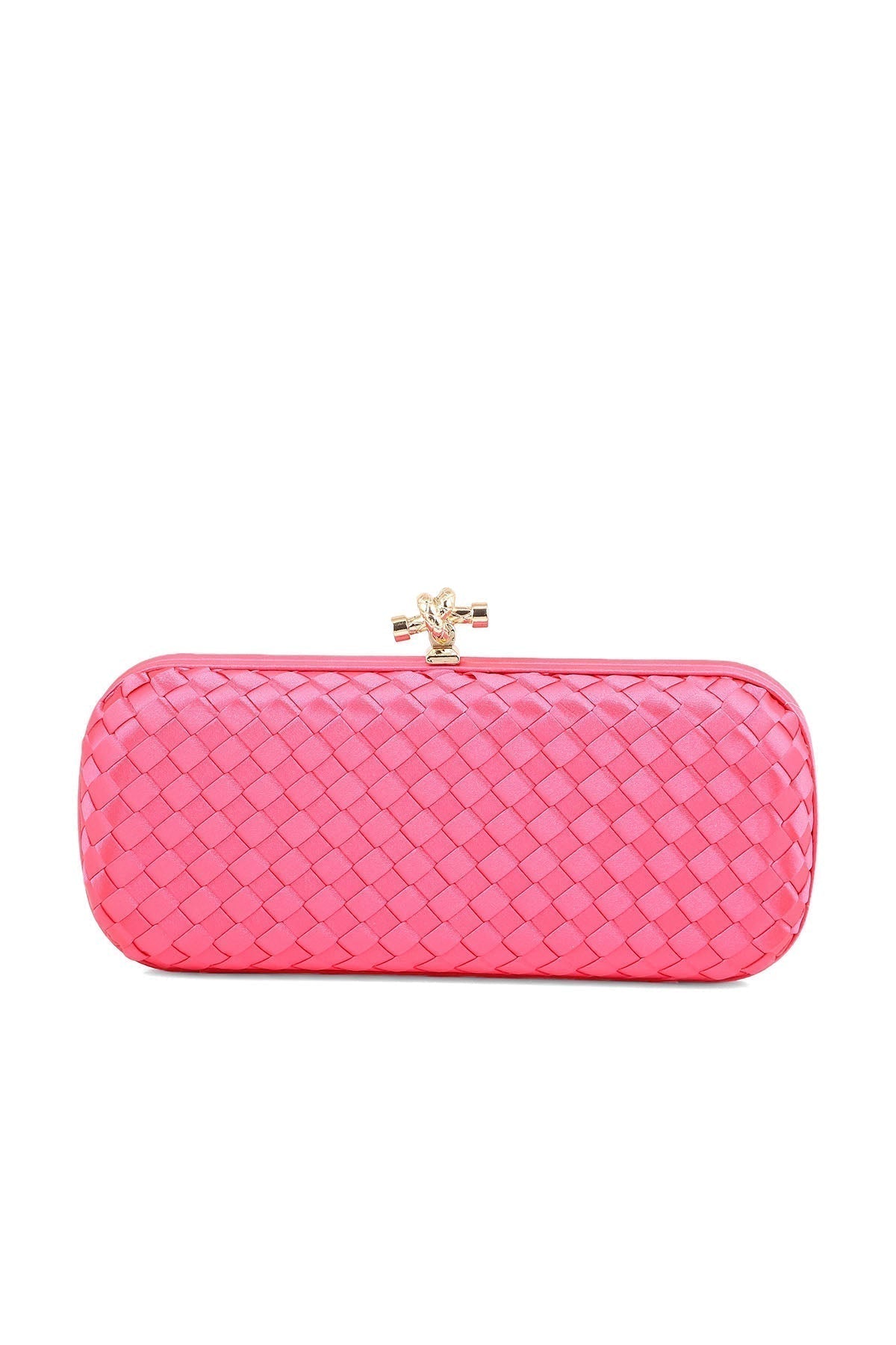 This is a pink clutch with a metallic finish. The purse does not have any straps or handles. The bag can be used as a stylish accessory for a formal occasion.