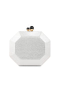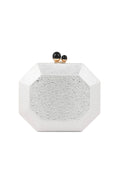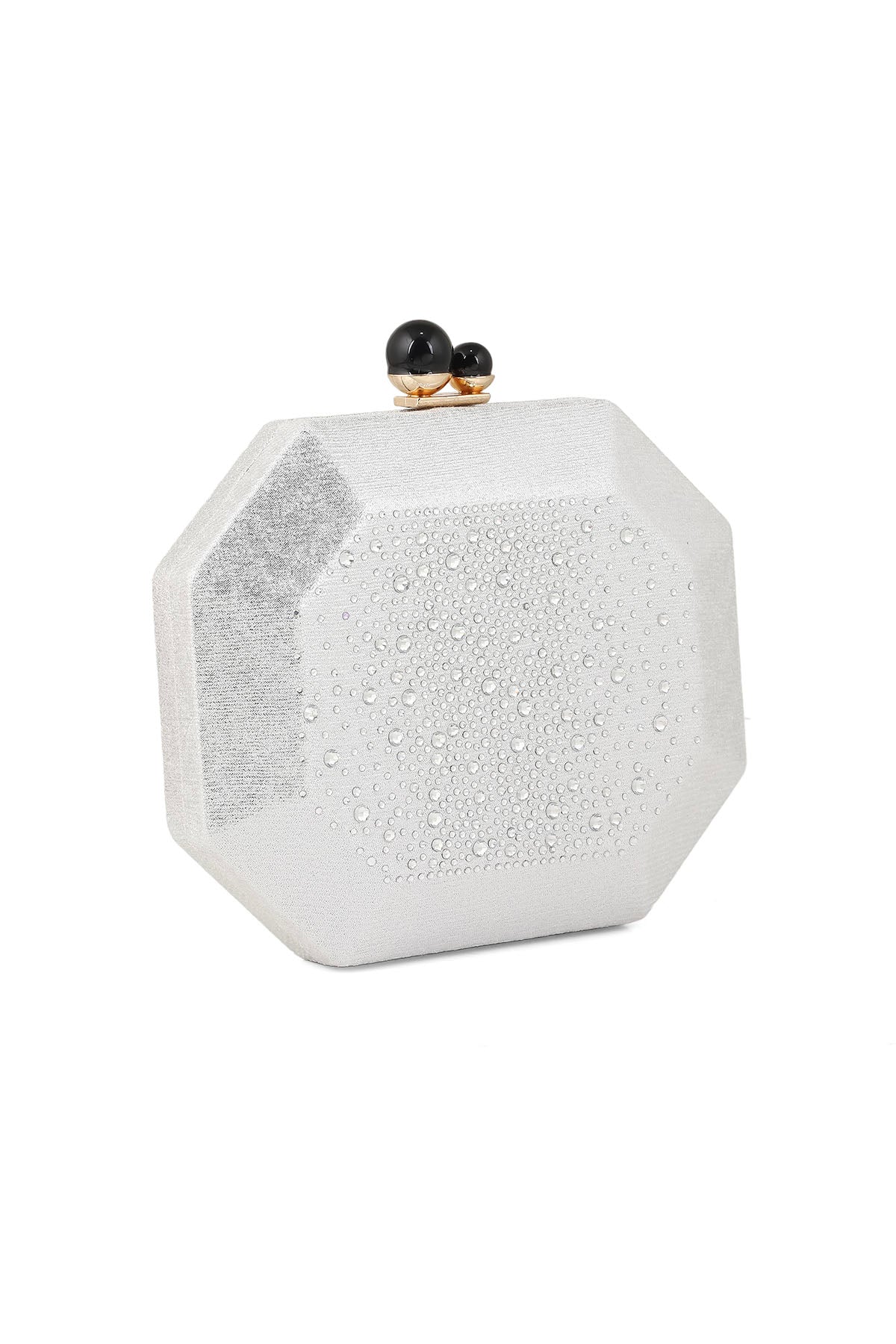 This silver colored clutch is made with the geometrical frame, having embellishment of the small diamantes and then finsihed to a twist lock at the top.