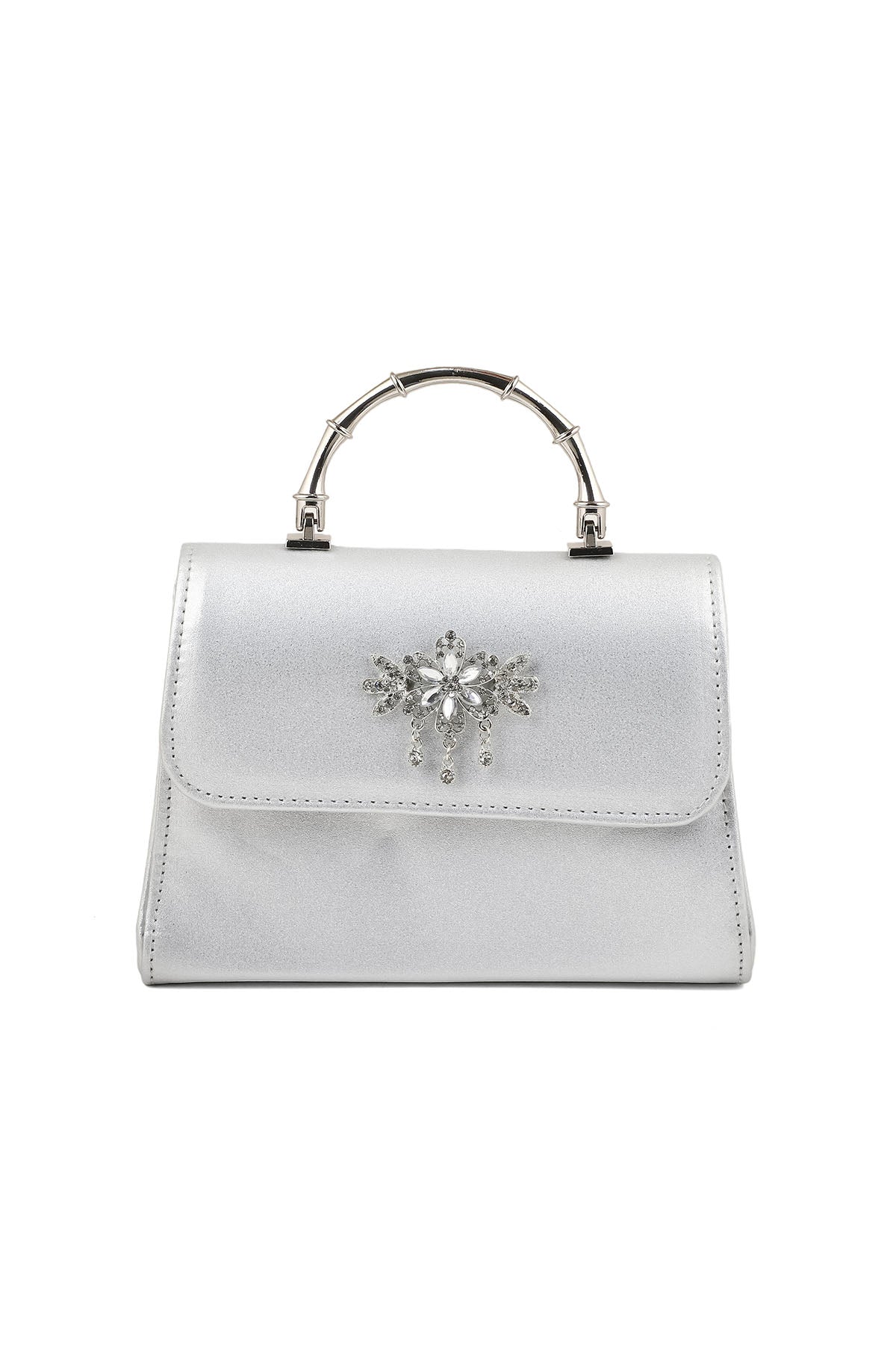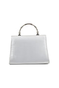 The silver bag is a hand-carry bag with beautiful hardware on it. The bag features one pocket. It could be a great choice for both casual and formal occasions.