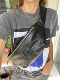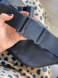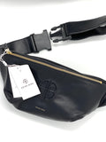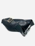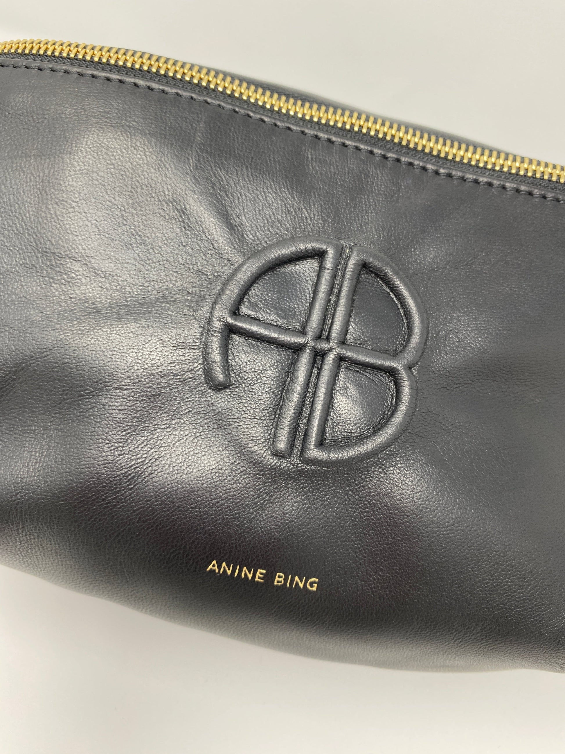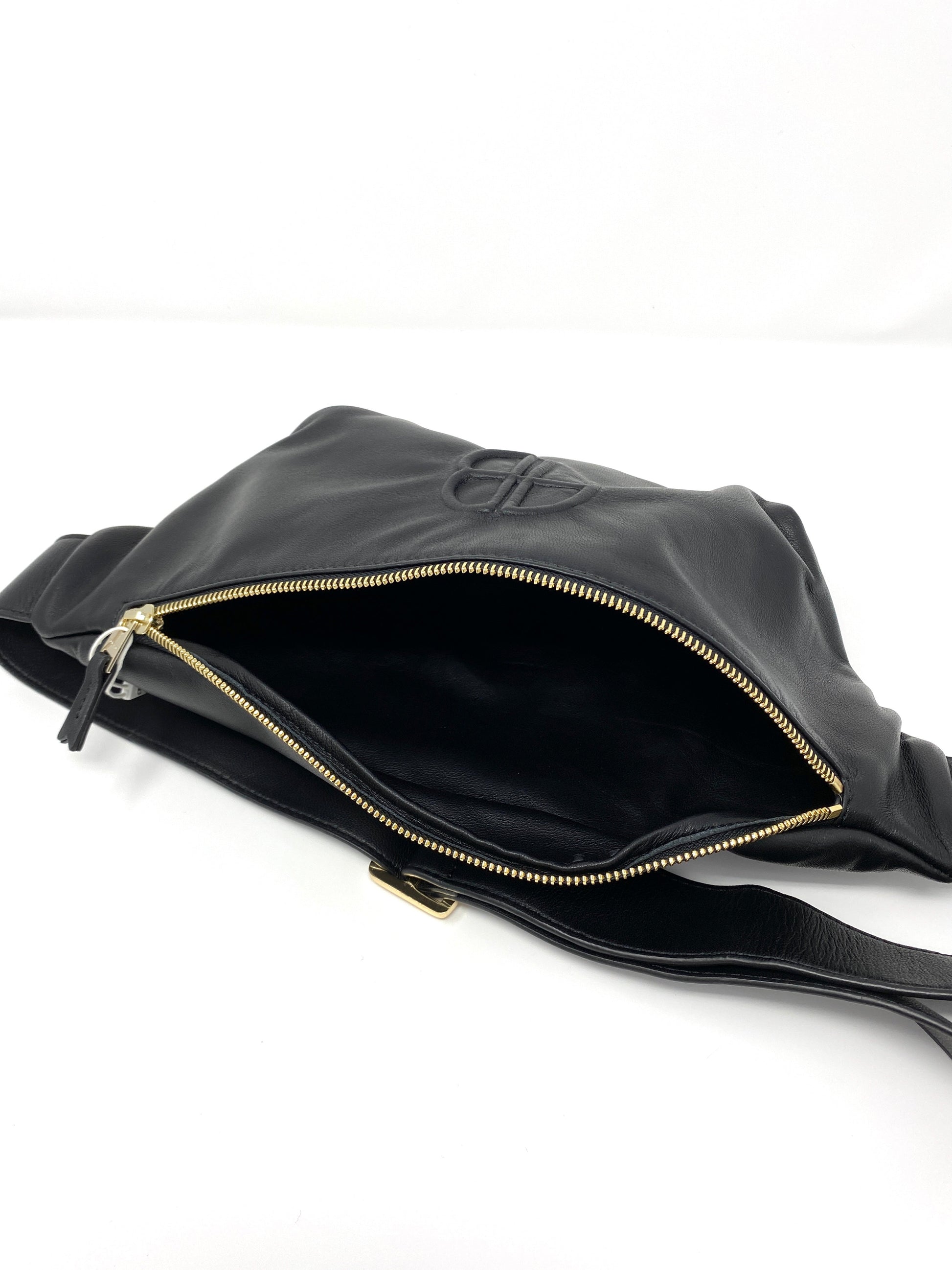 Simple and clean, this oversized leather fanny bag is complete with an embossed ANINE BING logo and gold hardware for an elevated finish. It has a soft, pebbled texture with quilted logo initials and zip closure. The belt strap is adjustable and also has a plastic clasp. The lining (inside) is also leather.
