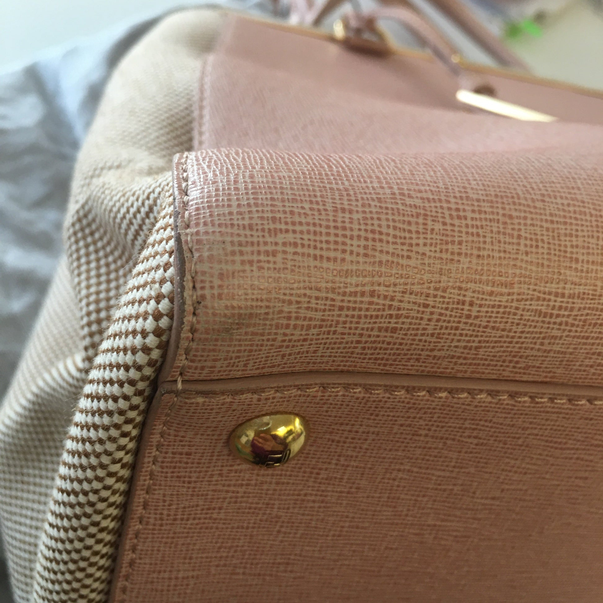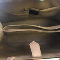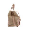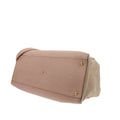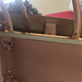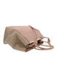 This chic handbag is crafted of Saffiano leather in Pink with beige toile details, gold and white hardware